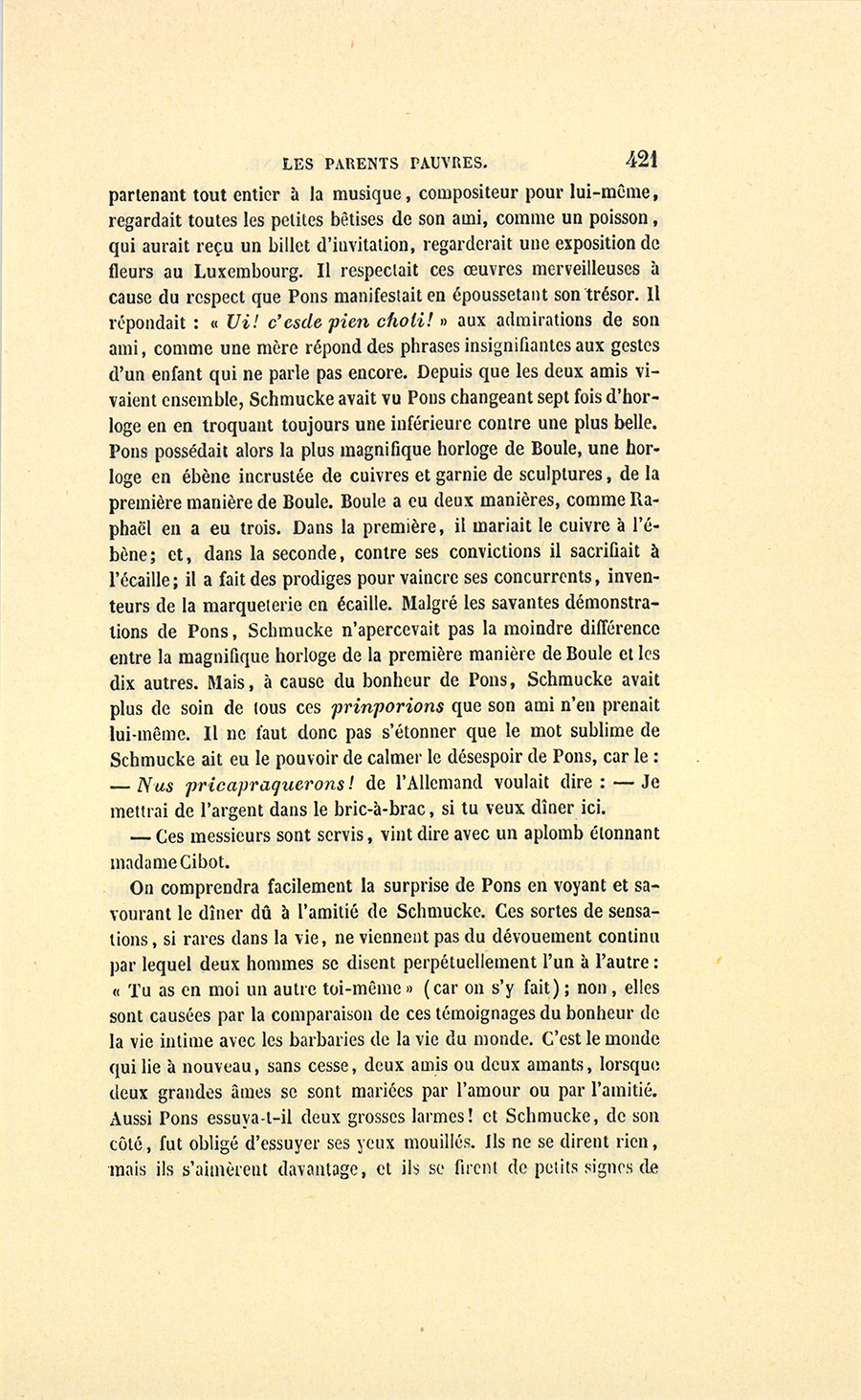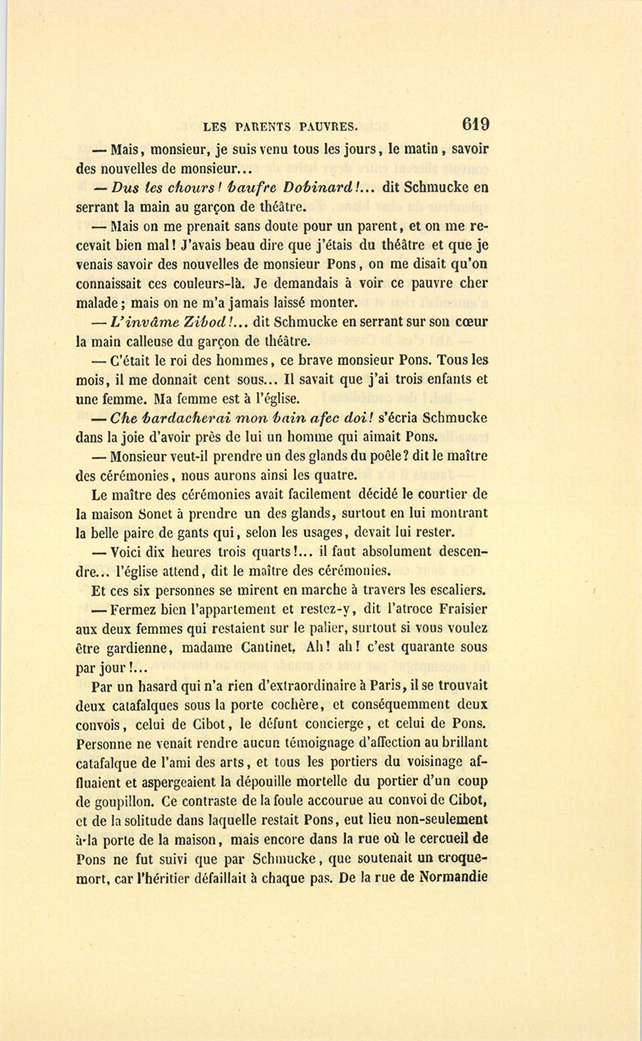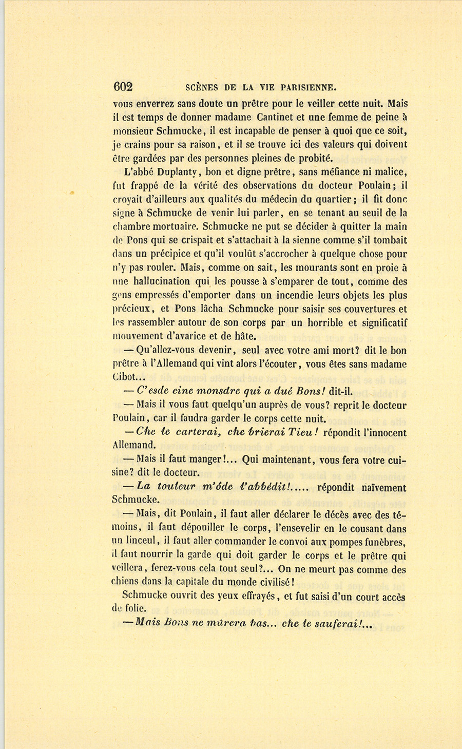 – Pah ! pur quelques jurs que c’hai à fifre ! dit Schmucke, c’esde bien pon ! Atieu ! che fais au zimedière… foir ce qu’on a vaid te Bons… ed gommader tes fleurs pir sa dompe !