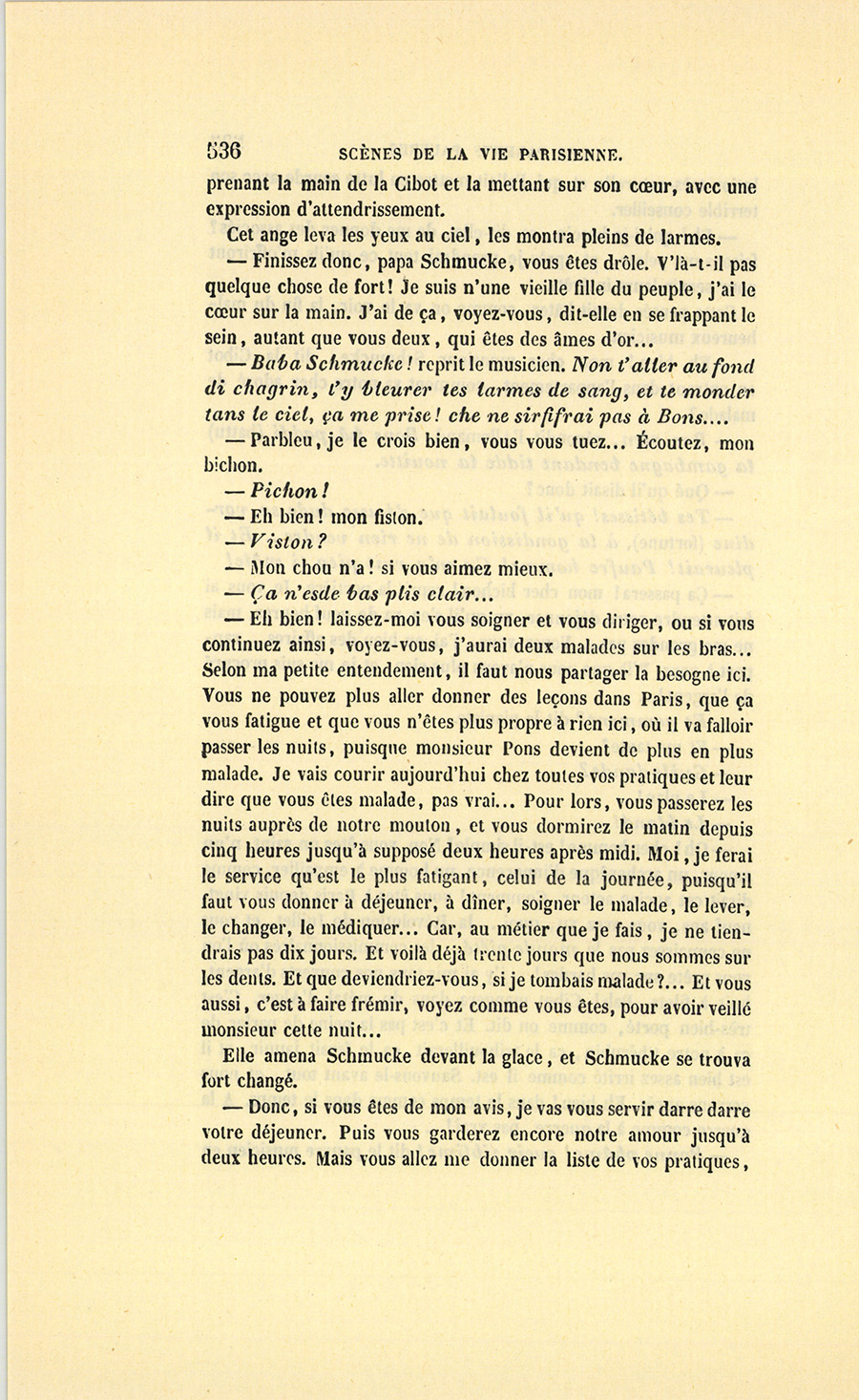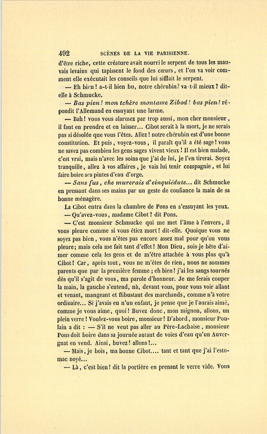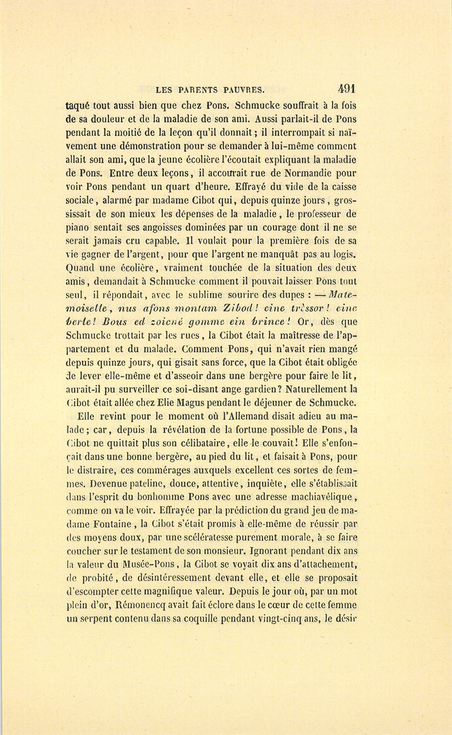 – Pah ! pur quelques jurs que c’hai à fifre ! dit Schmucke, c’esde bien pon ! Atieu ! che fais au zimedière… foir ce qu’on a vaid te Bons… ed gommader tes fleurs pir sa dompe !