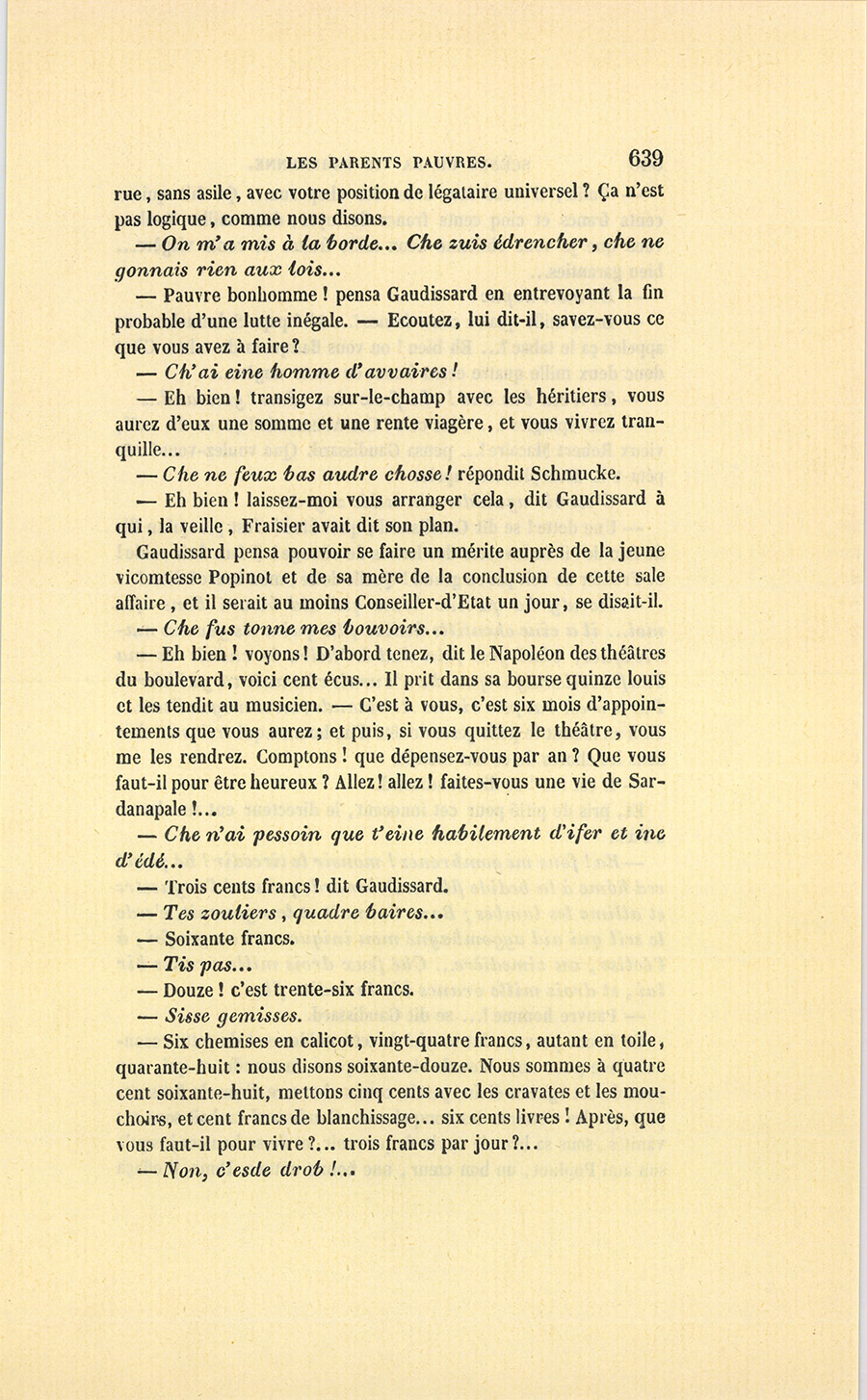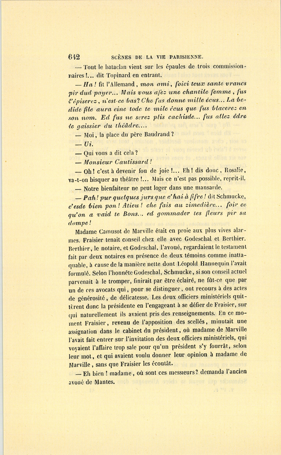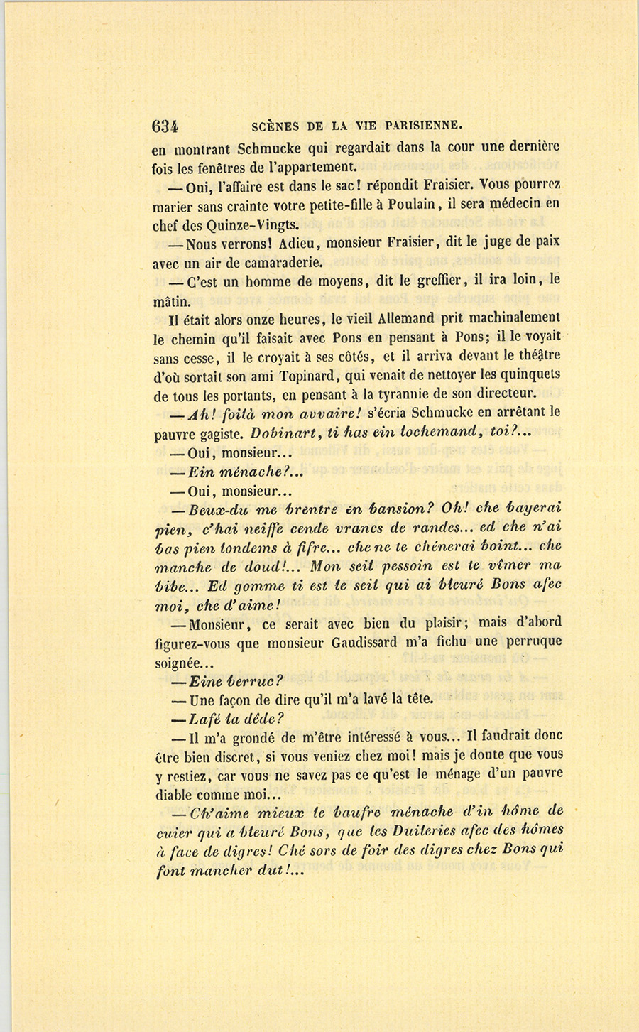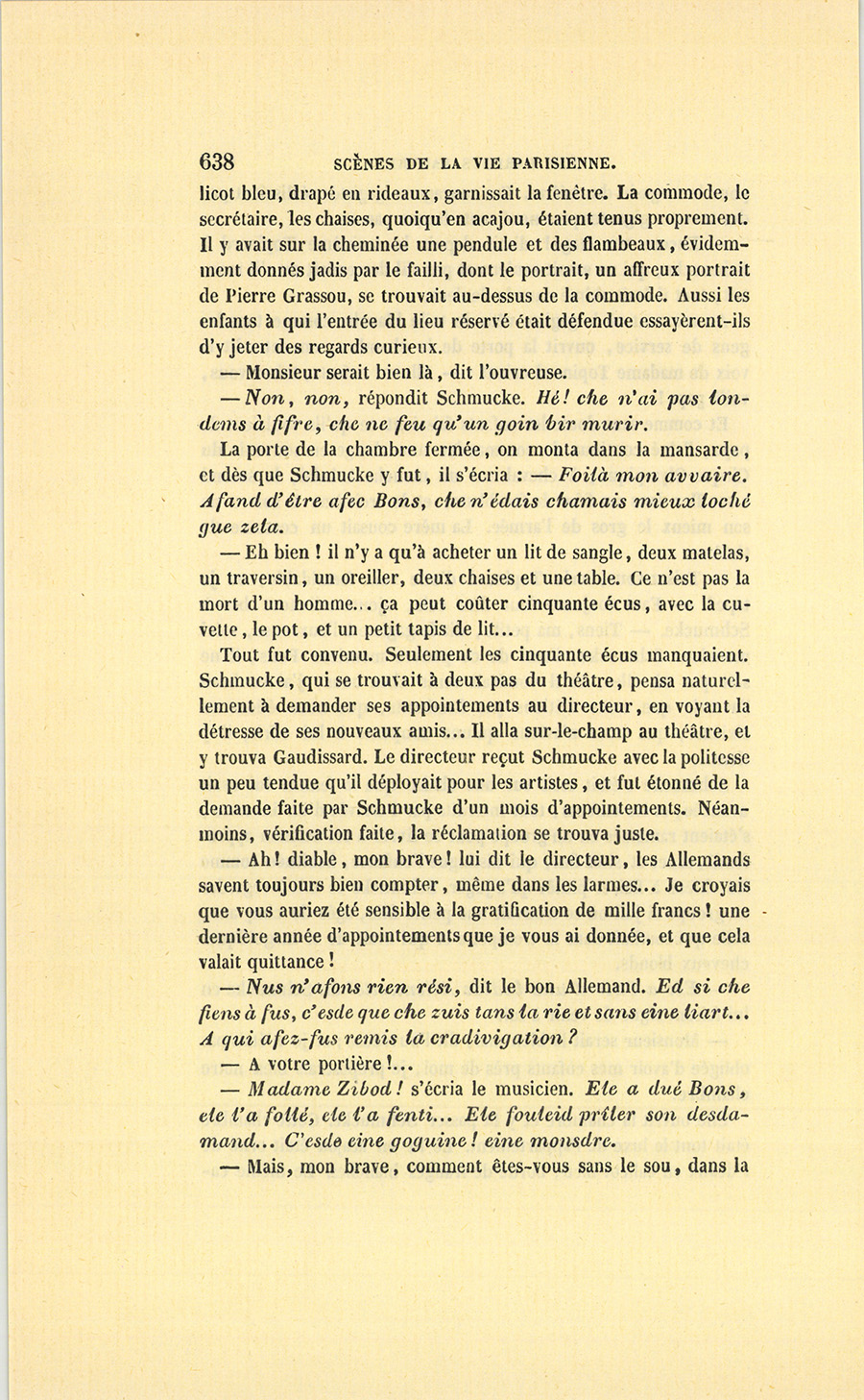 – Ha ! fit l’Allemand, mon ami, foici teux sante vrancs pir dud payer… Mais vous afez une chantile femme, fus l’épiserez, n’est-ce bas ? Che fus donne mille écus… La bedide file aura eine tode te mile écus que fus blacerez en son nom. Ed fus ne serez plis cachisde… fus allez êdre le gaissier du théâdre…