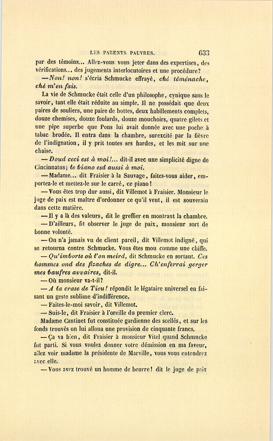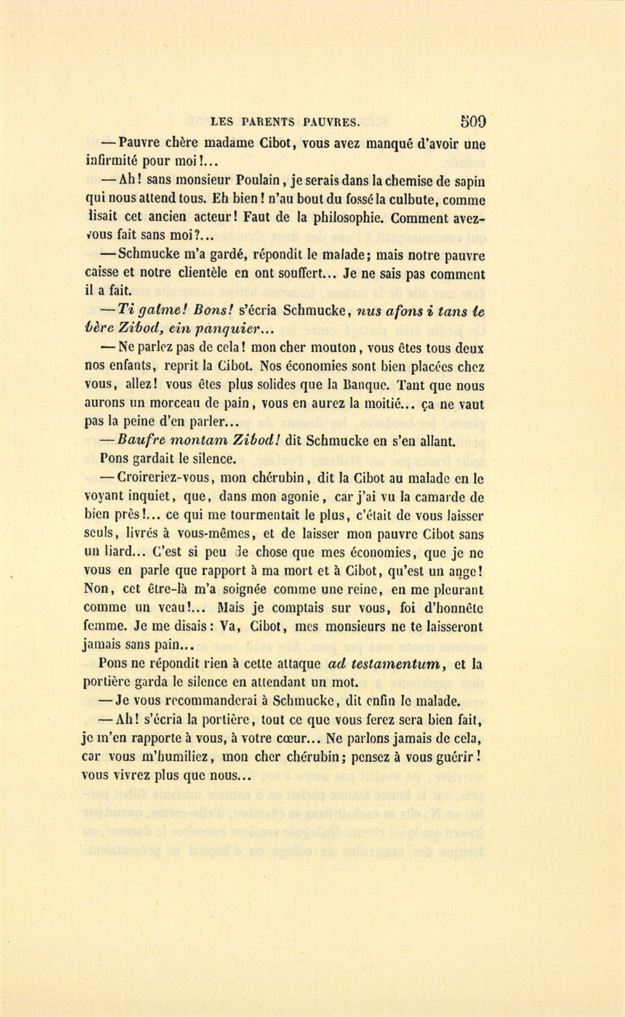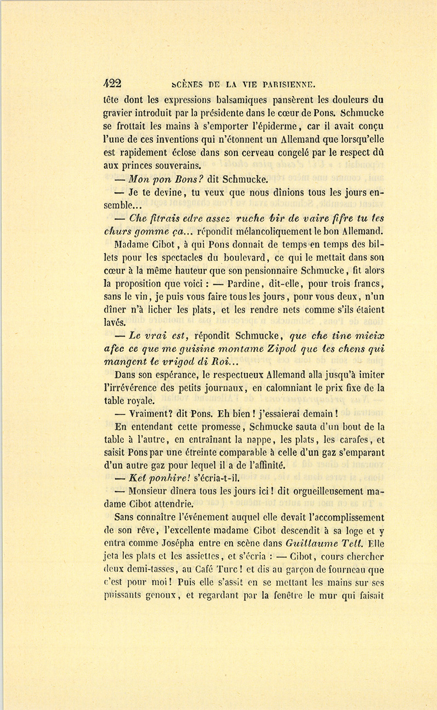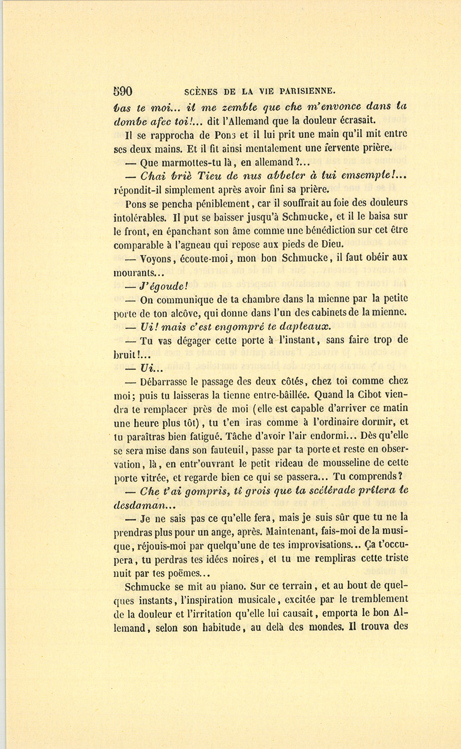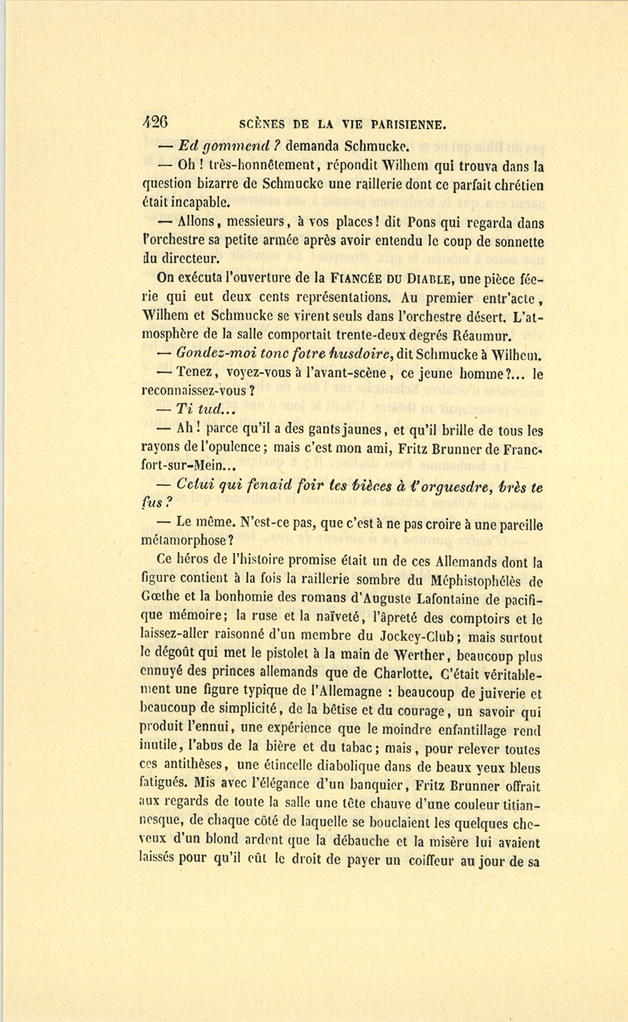 – Ha ! fit l’Allemand, mon ami, foici teux sante vrancs pir dud payer… Mais vous afez une chantile femme, fus l’épiserez, n’est-ce bas ? Che fus donne mille écus… La bedide file aura eine tode te mile écus que fus blacerez en son nom. Ed fus ne serez plis cachisde… fus allez êdre le gaissier du théâdre…