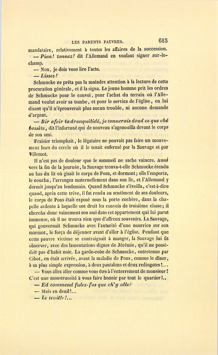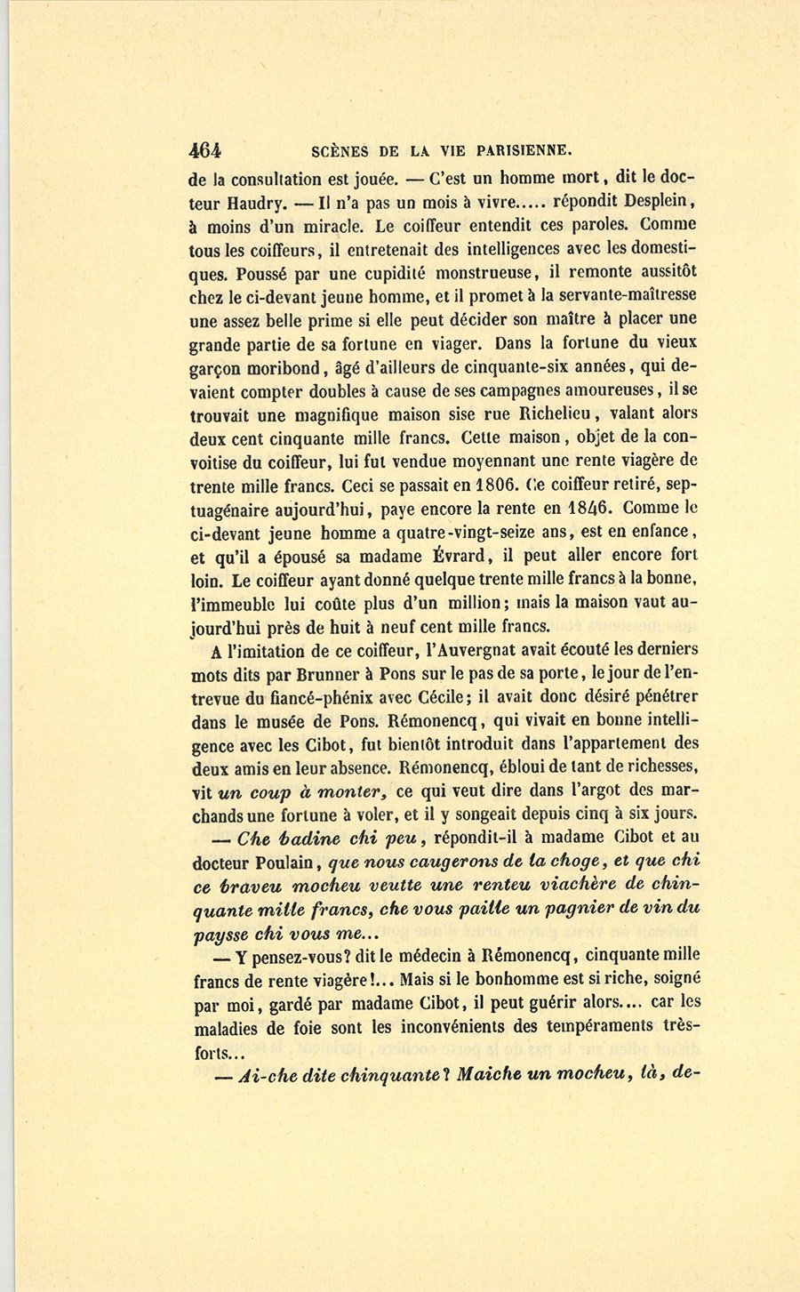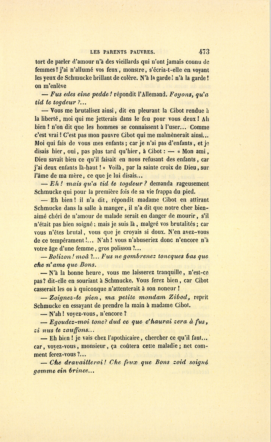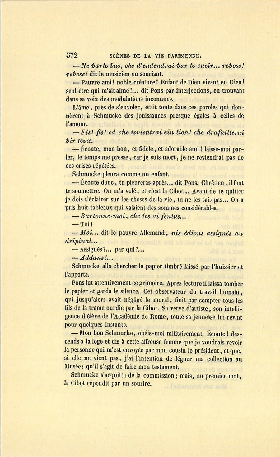 – Ha ! fit l’Allemand, mon ami, foici teux sante vrancs pir dud payer… Mais vous afez une chantile femme, fus l’épiserez, n’est-ce bas ? Che fus donne mille écus… La bedide file aura eine tode te mile écus que fus blacerez en son nom. Ed fus ne serez plis cachisde… fus allez êdre le gaissier du théâdre…