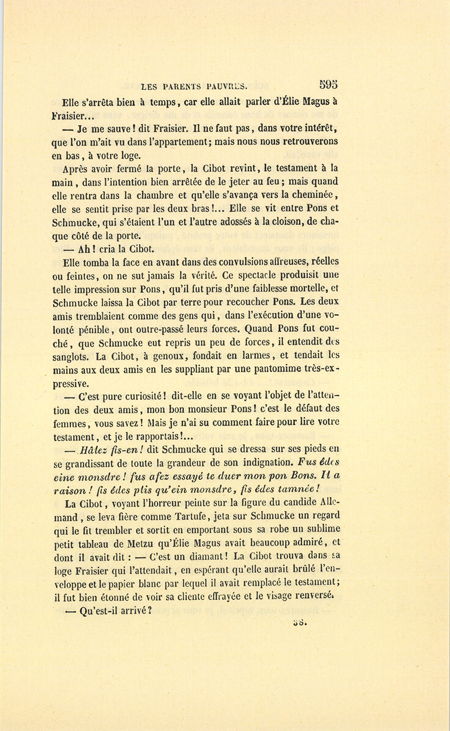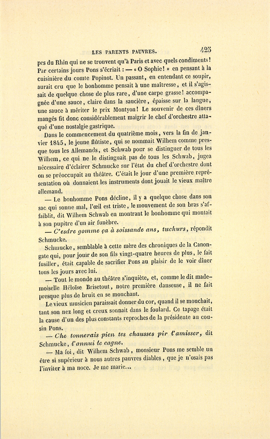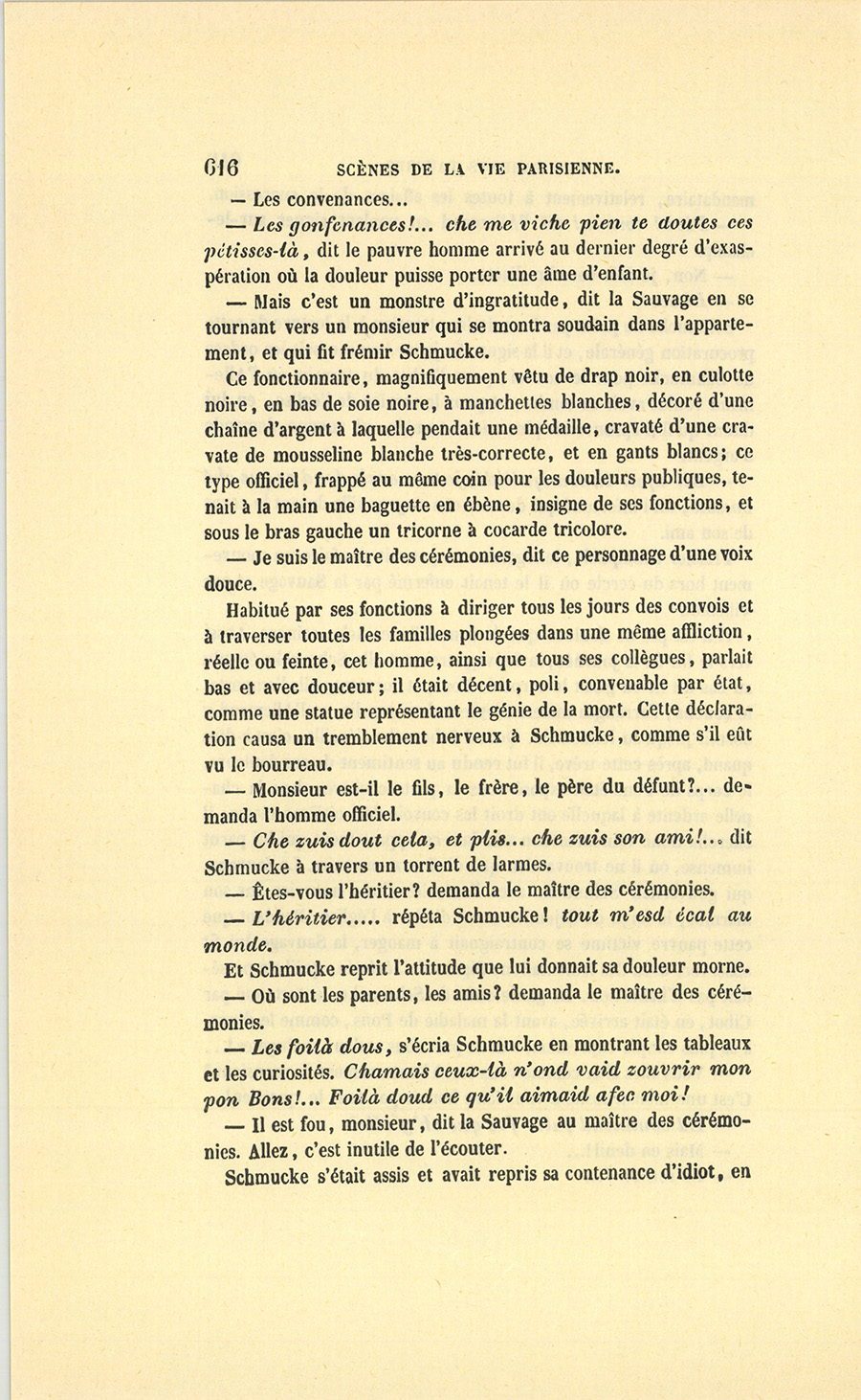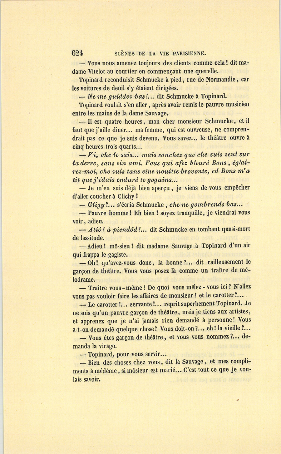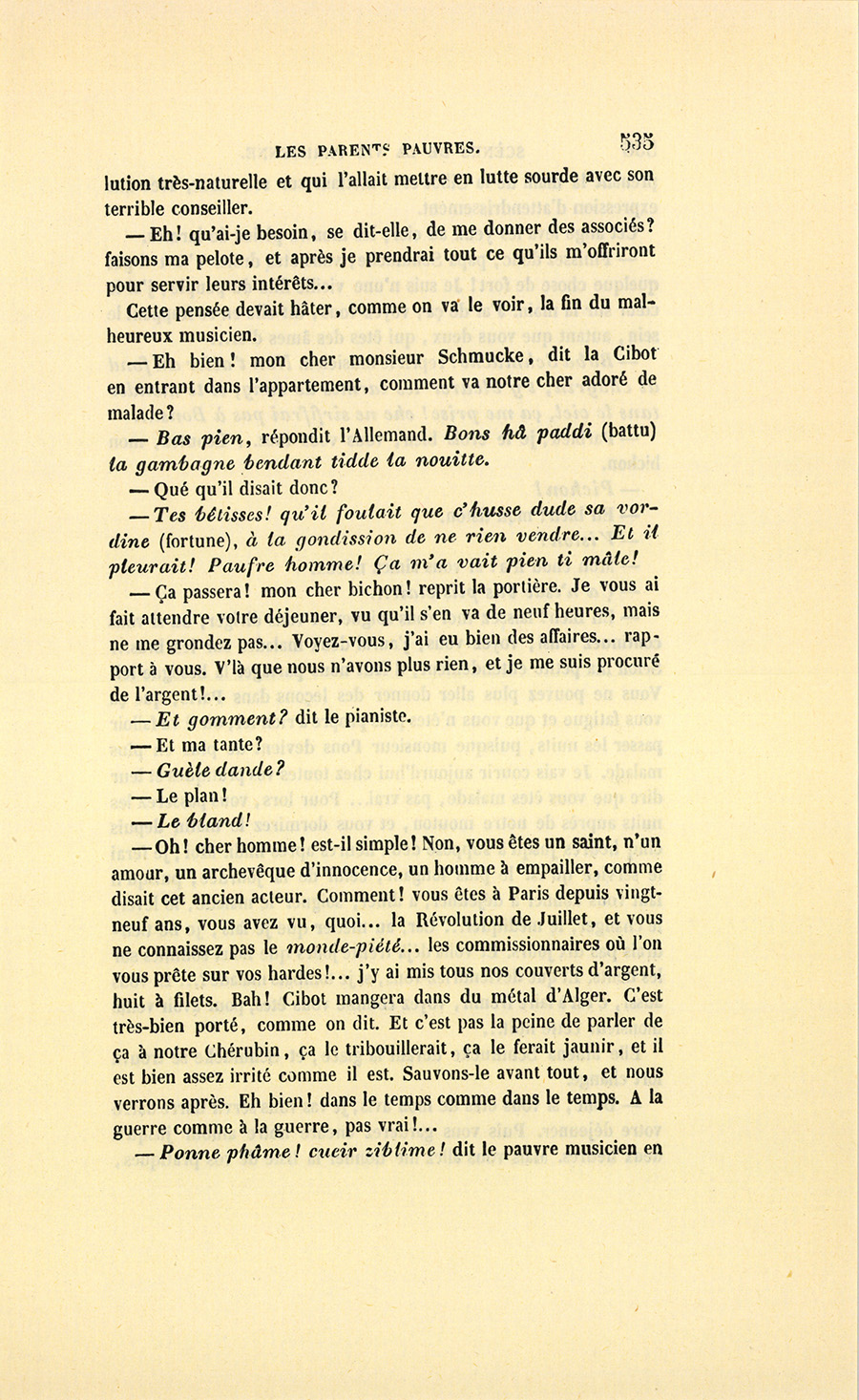 – Ha ! fit l’Allemand, mon ami, foici teux sante vrancs pir dud payer… Mais vous afez une chantile femme, fus l’épiserez, n’est-ce bas ? Che fus donne mille écus… La bedide file aura eine tode te mile écus que fus blacerez en son nom. Ed fus ne serez plis cachisde… fus allez êdre le gaissier du théâdre…