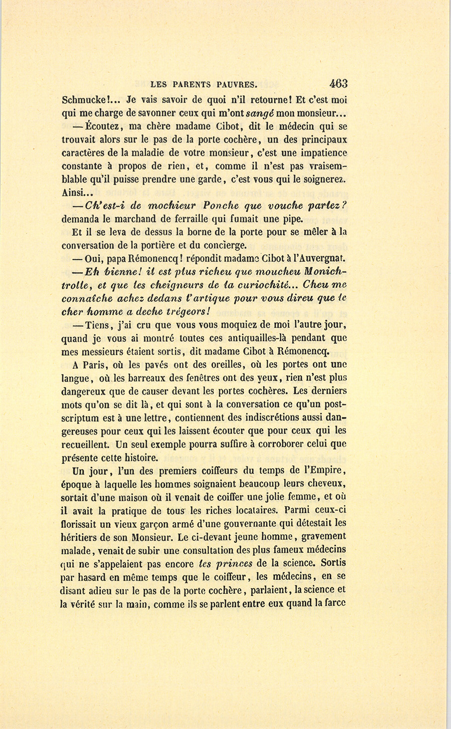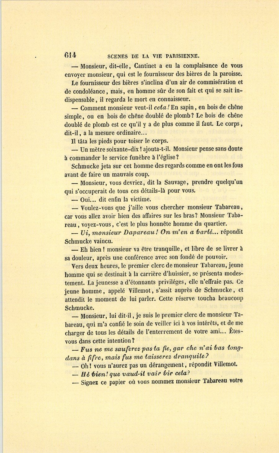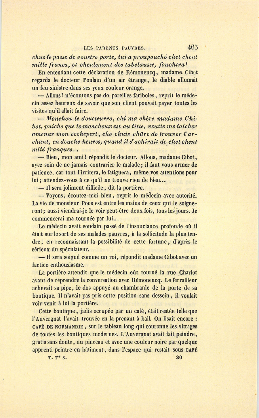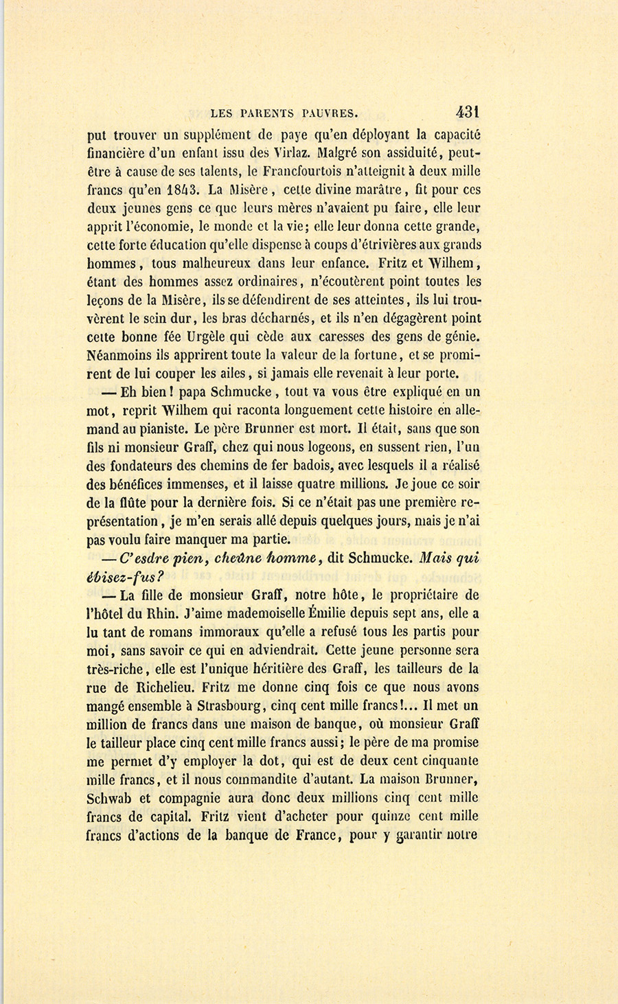 – Ha ! fit l’Allemand, mon ami, foici teux sante vrancs pir dud payer… Mais vous afez une chantile femme, fus l’épiserez, n’est-ce bas ? Che fus donne mille écus… La bedide file aura eine tode te mile écus que fus blacerez en son nom. Ed fus ne serez plis cachisde… fus allez êdre le gaissier du théâdre…