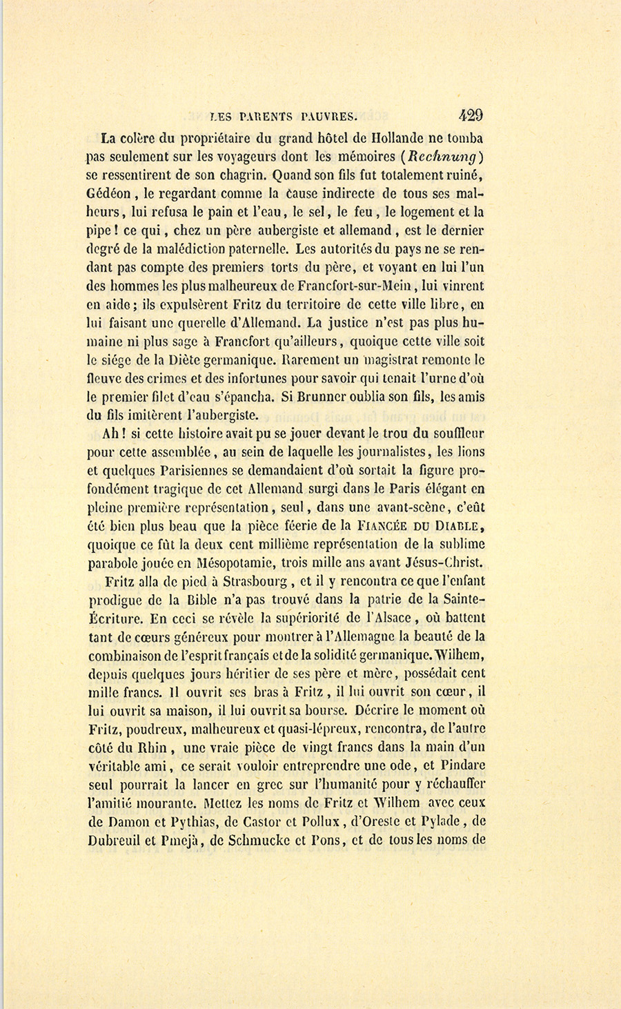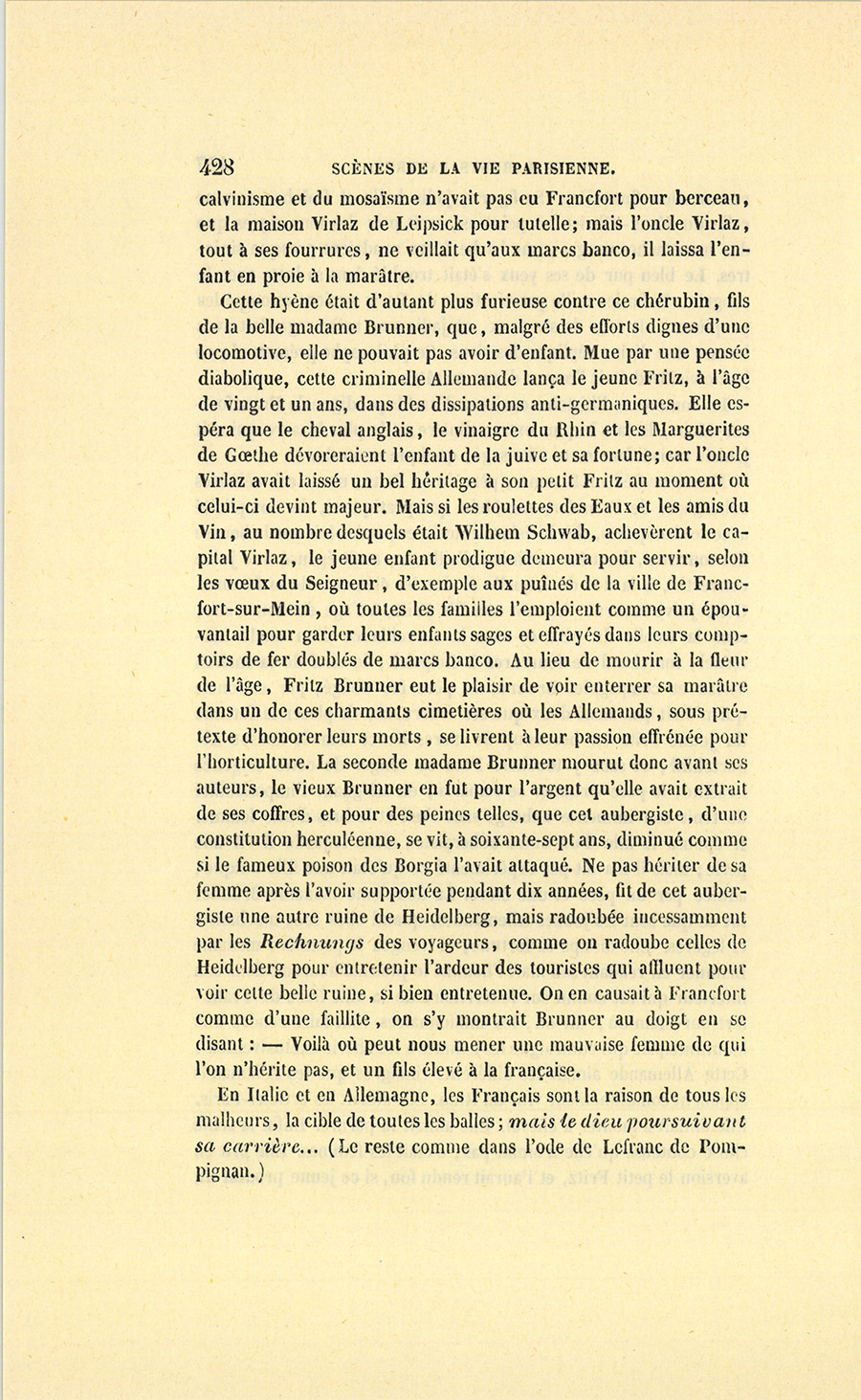 – Pauvre mouton ! se dit Gaudissard en saluant l’Allemand qui se retirait. On vit de côtelettes après tout. Et comme dit le sublime Béranger :