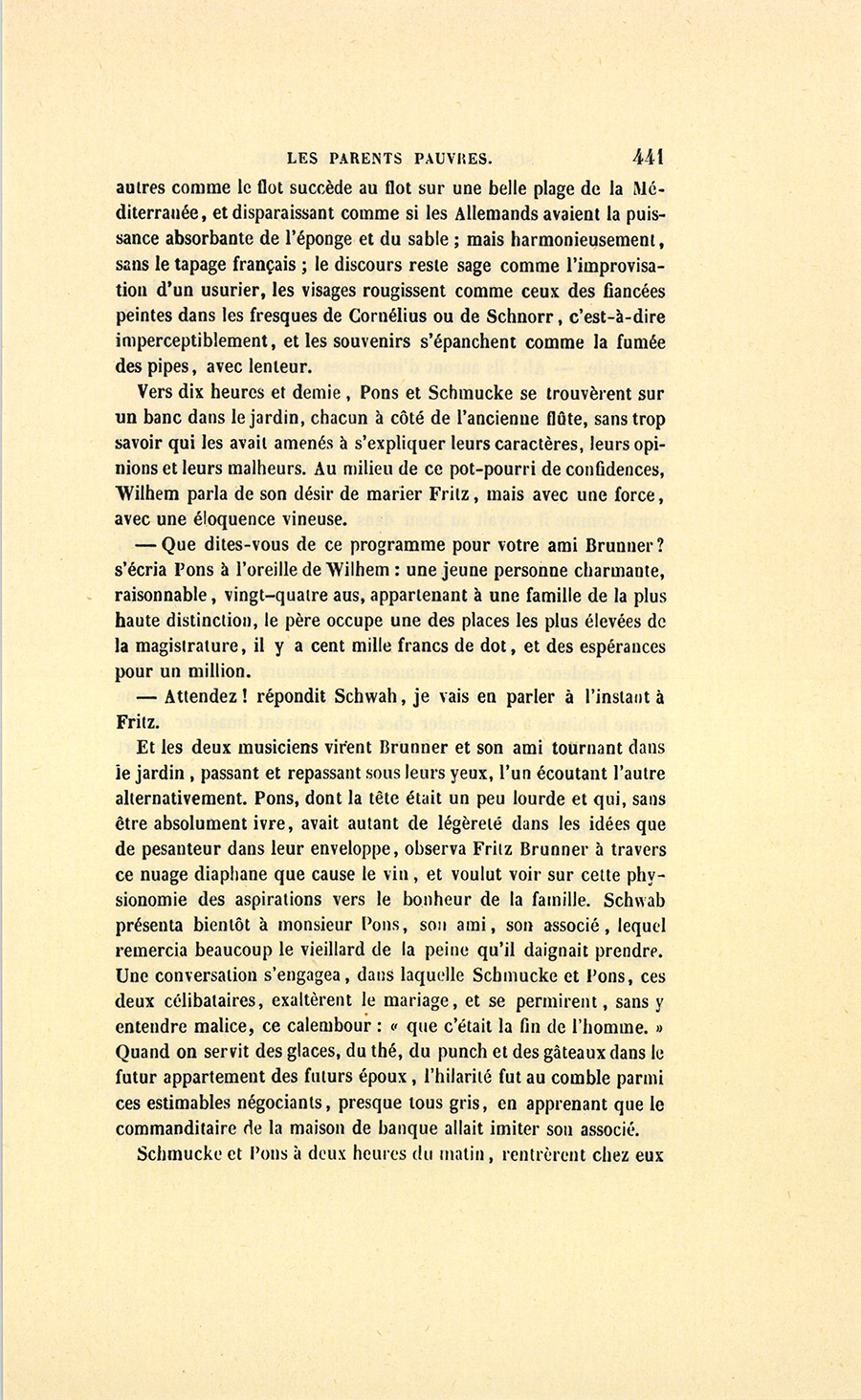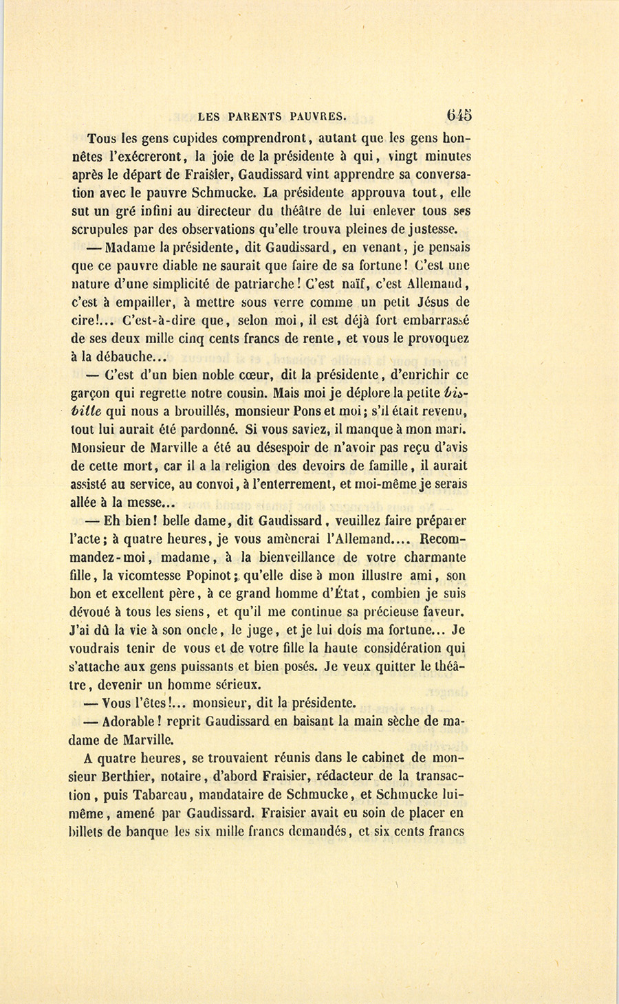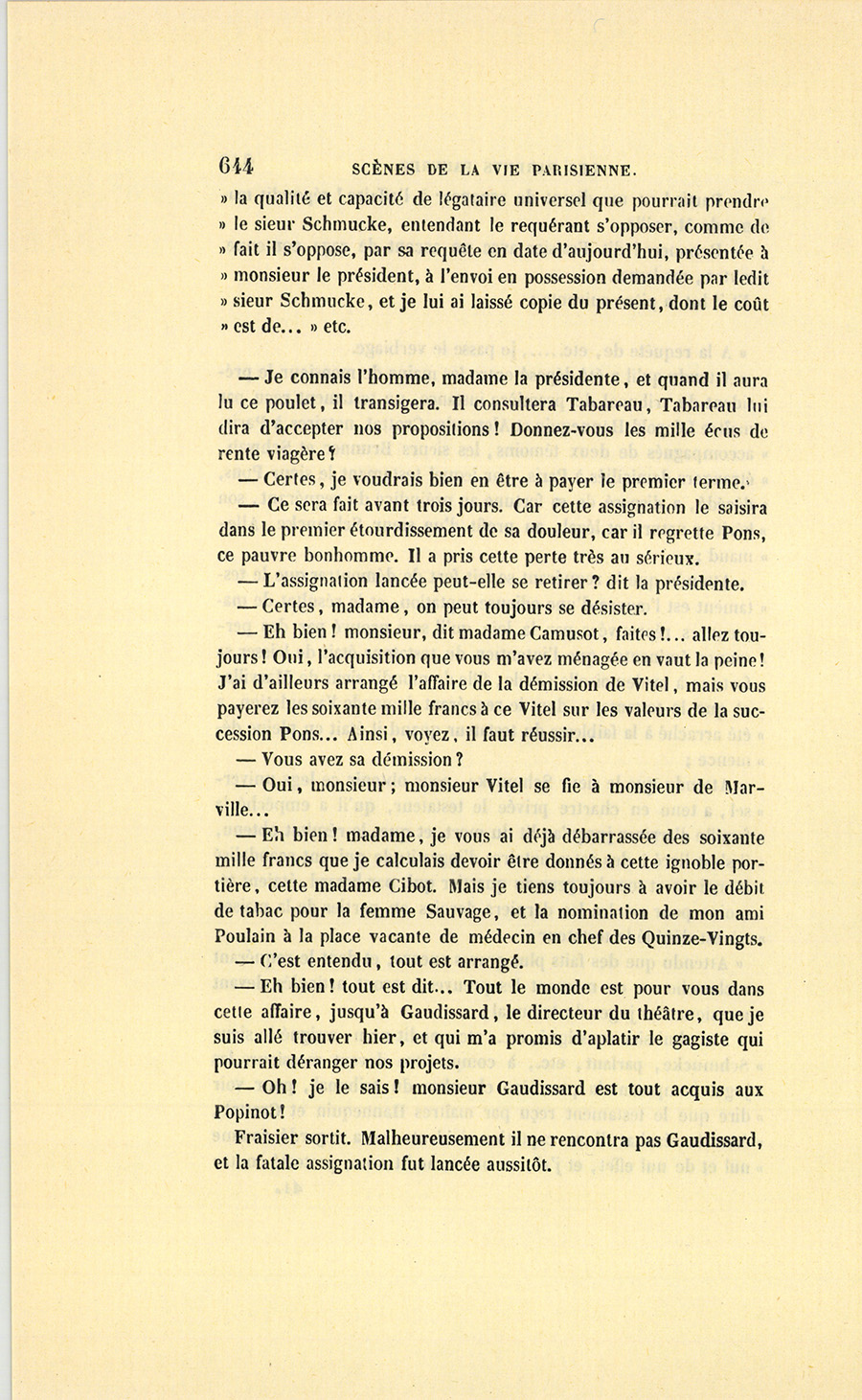 {p. 645} Tous les gens cupides comprendront, autant que les gens honnêtes l’exécreront, la joie de la présidente à qui, vingt minutes après le départ de Fraisier, Gaudissard vint apprendre sa conversation avec le pauvre Schmucke. La présidente approuva tout, elle sut un gré infini au directeur du théâtre de lui enlever tous ses scrupules par des observations qu’elle trouva pleines de justesse.