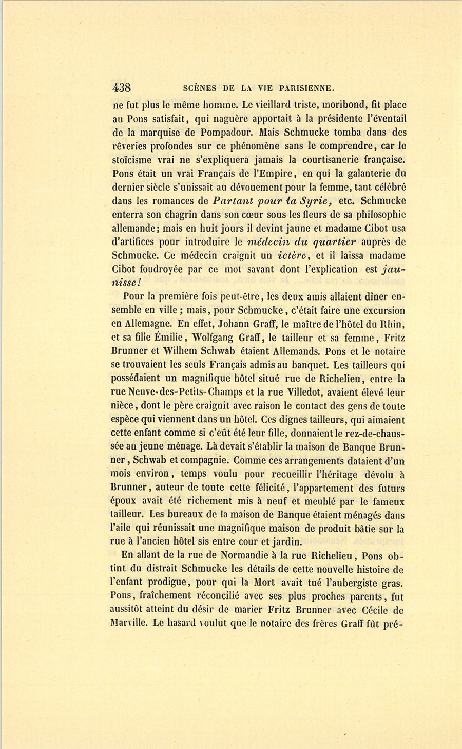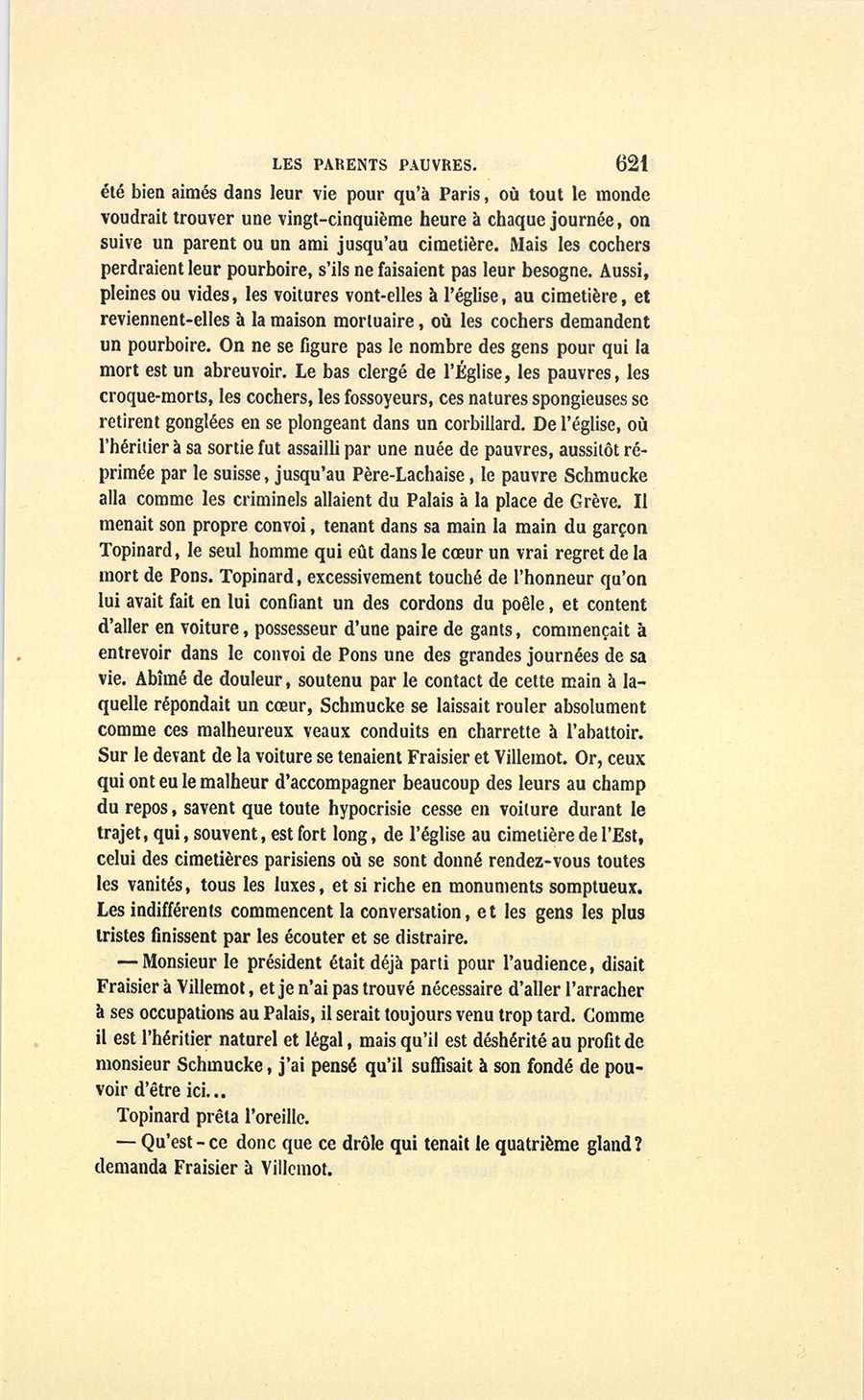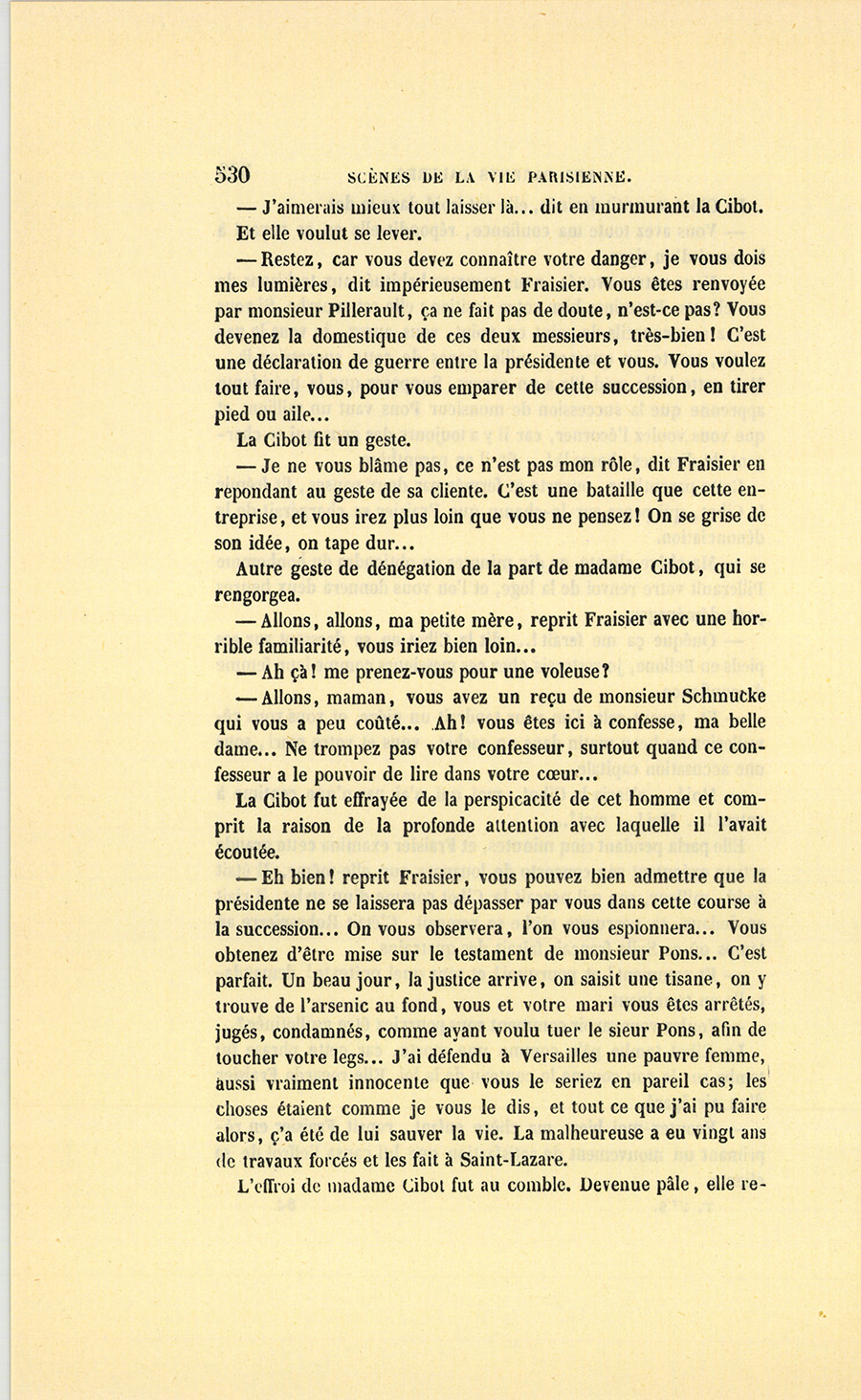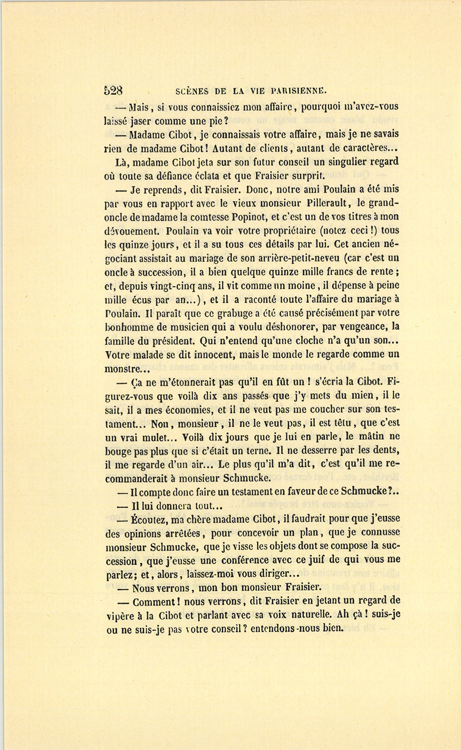 {p. 645} Tous les gens cupides comprendront, autant que les gens honnêtes l’exécreront, la joie de la présidente à qui, vingt minutes après le départ de Fraisier, Gaudissard vint apprendre sa conversation avec le pauvre Schmucke. La présidente approuva tout, elle sut un gré infini au directeur du théâtre de lui enlever tous ses scrupules par des observations qu’elle trouva pleines de justesse.