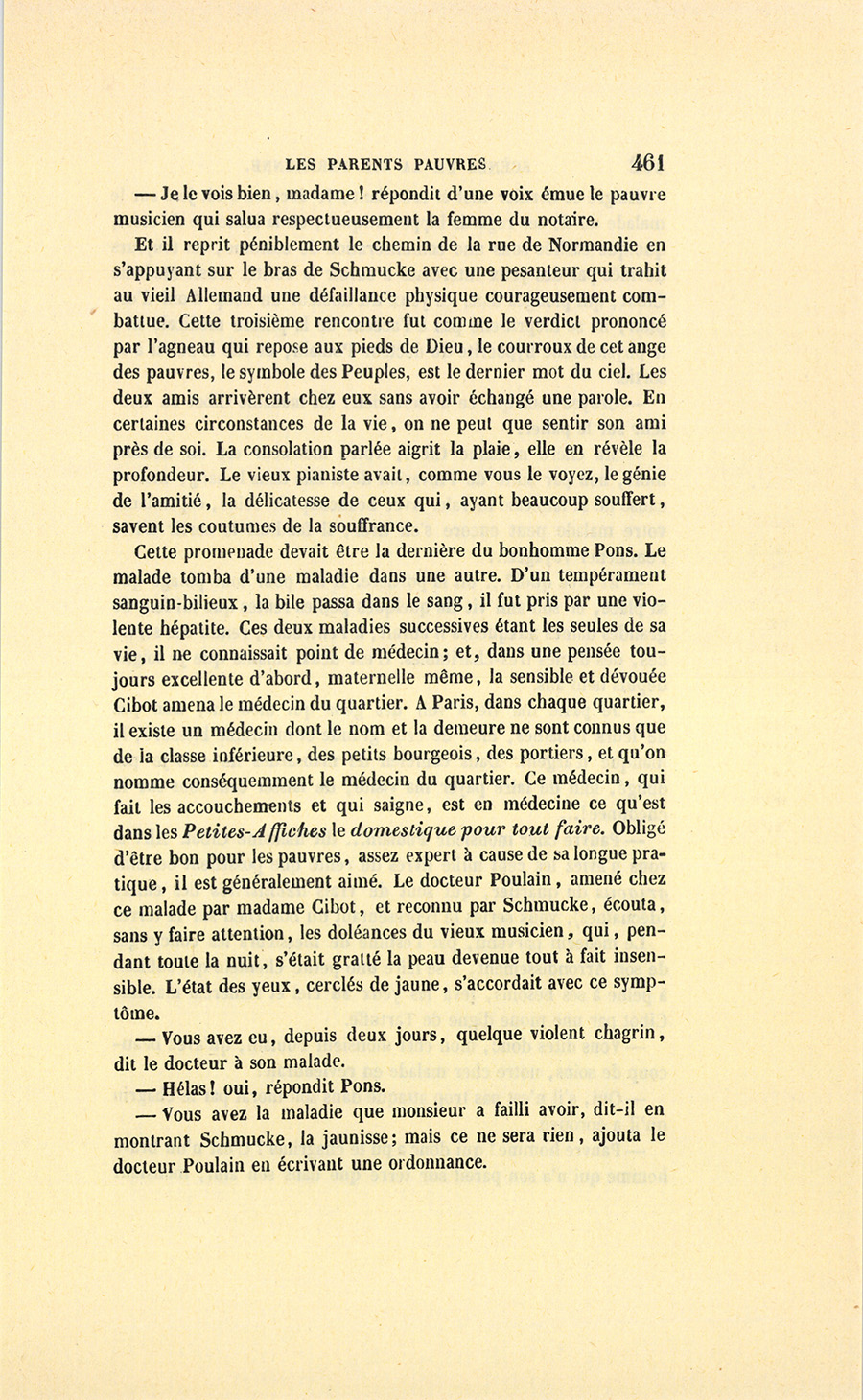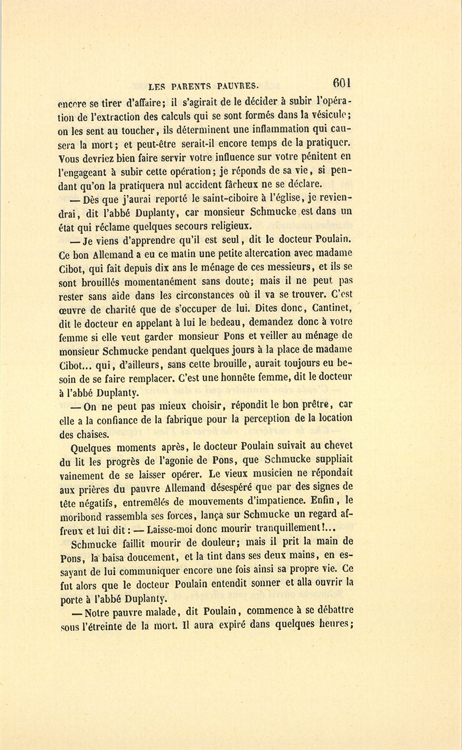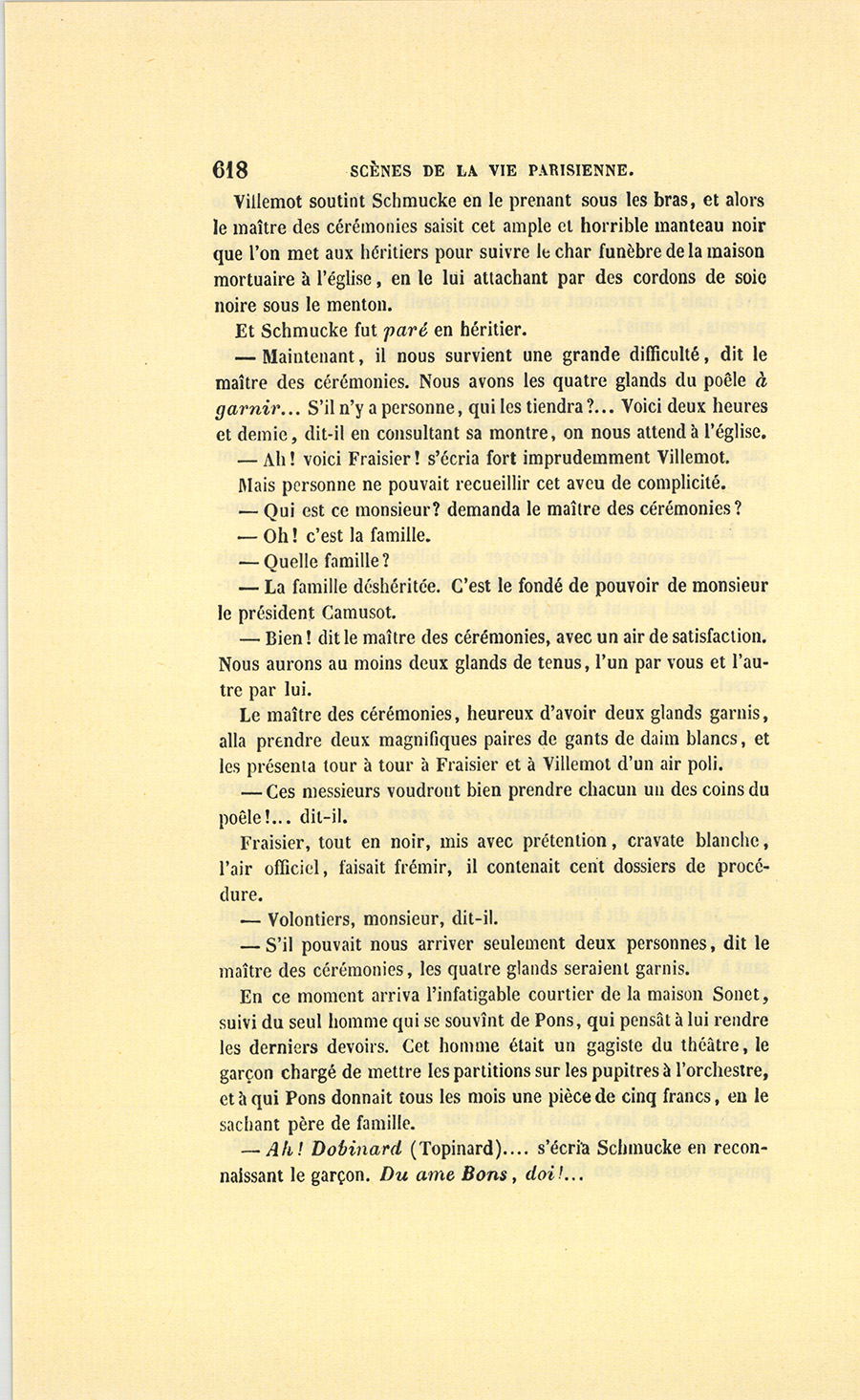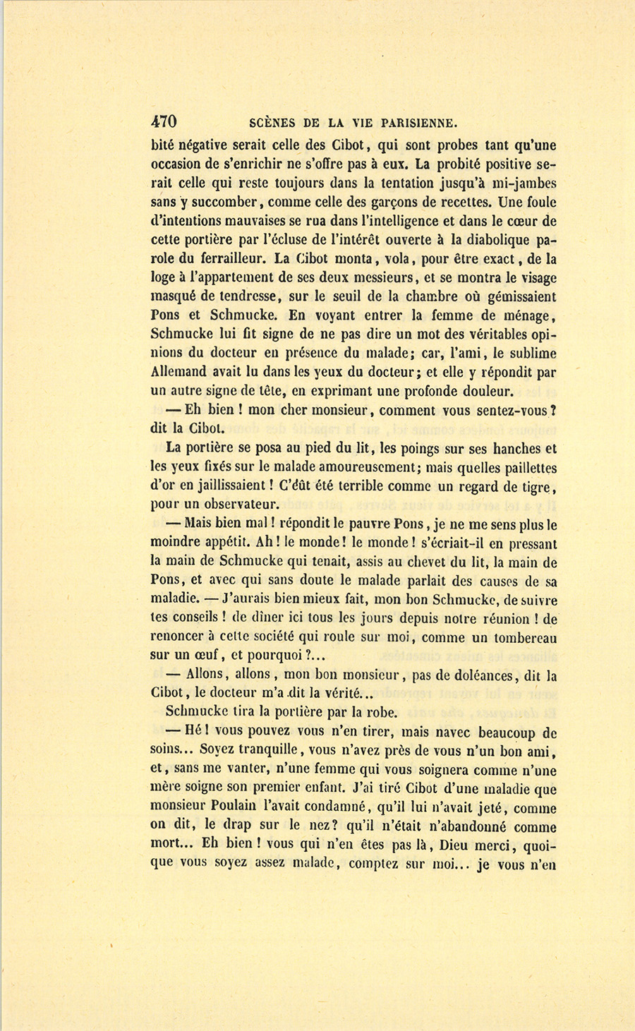 Et cet imprudent ami donna l’assignation envoyée à Schmucke, cité Bordin. Schmucke prit le papier, le lut, et en se voyant traité comme il l’était, ne comprenant rien aux gentillesses de la procédure, il reçut un coup mortel. Ce gravier lui boucha le cœur. Topinard reçut Schmucke dans ses bras ; ils étaient alors tous deux sous la porte cochère du notaire. Une voiture vint à passer, Topinard y fit entrer le pauvre Allemand, qui subissait les douleurs d’une congestion séreuse au cerveau. La vue était troublée ; mais le musicien eut encore la force de tendre l’argent à Topinard. Schmucke ne succomba point à cette première attaque, mais il ne recouvra point la raison ; il ne faisait que des mouvements sans conscience ; il ne mangea point ; il mourut en dix jours sans se plaindre, car il ne parla plus. Il fut soigné par madame Topinard, et fut obscurément enterré côte à côte avec Pons, par les soins de Topinard, la seule personne qui suivit le convoi de ce fils de l’Allemagne.