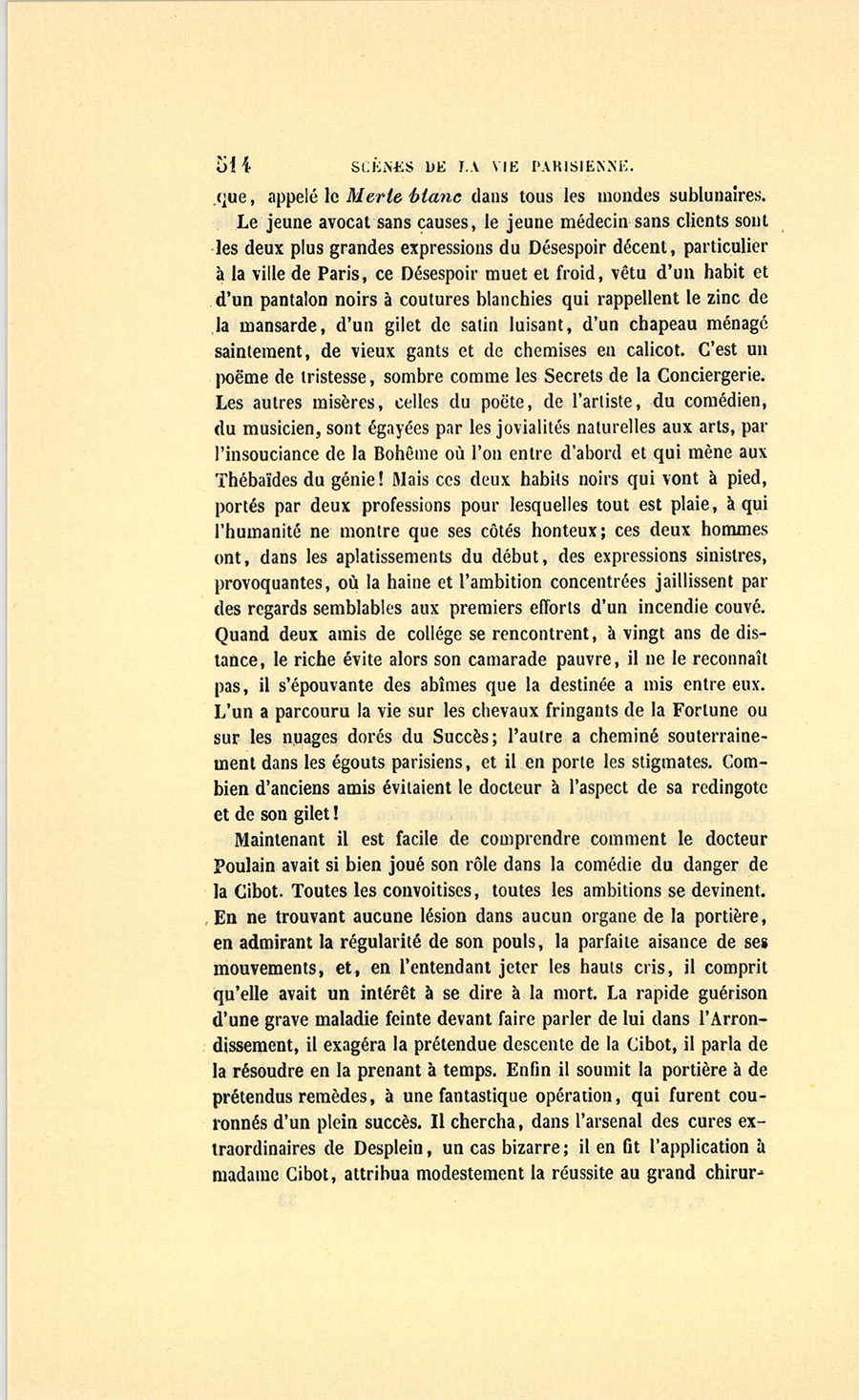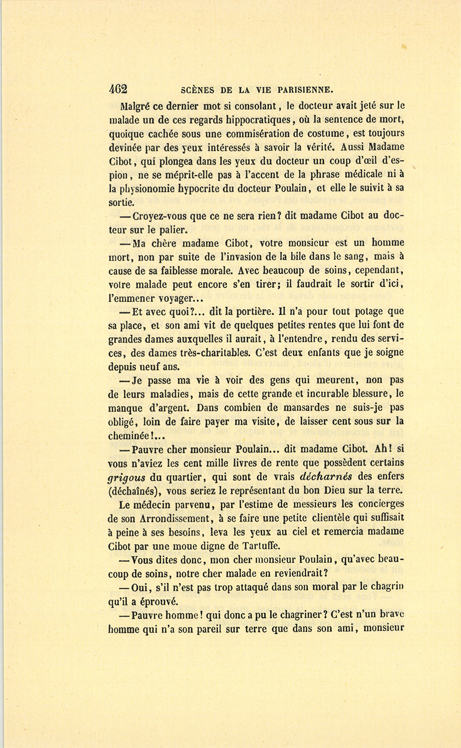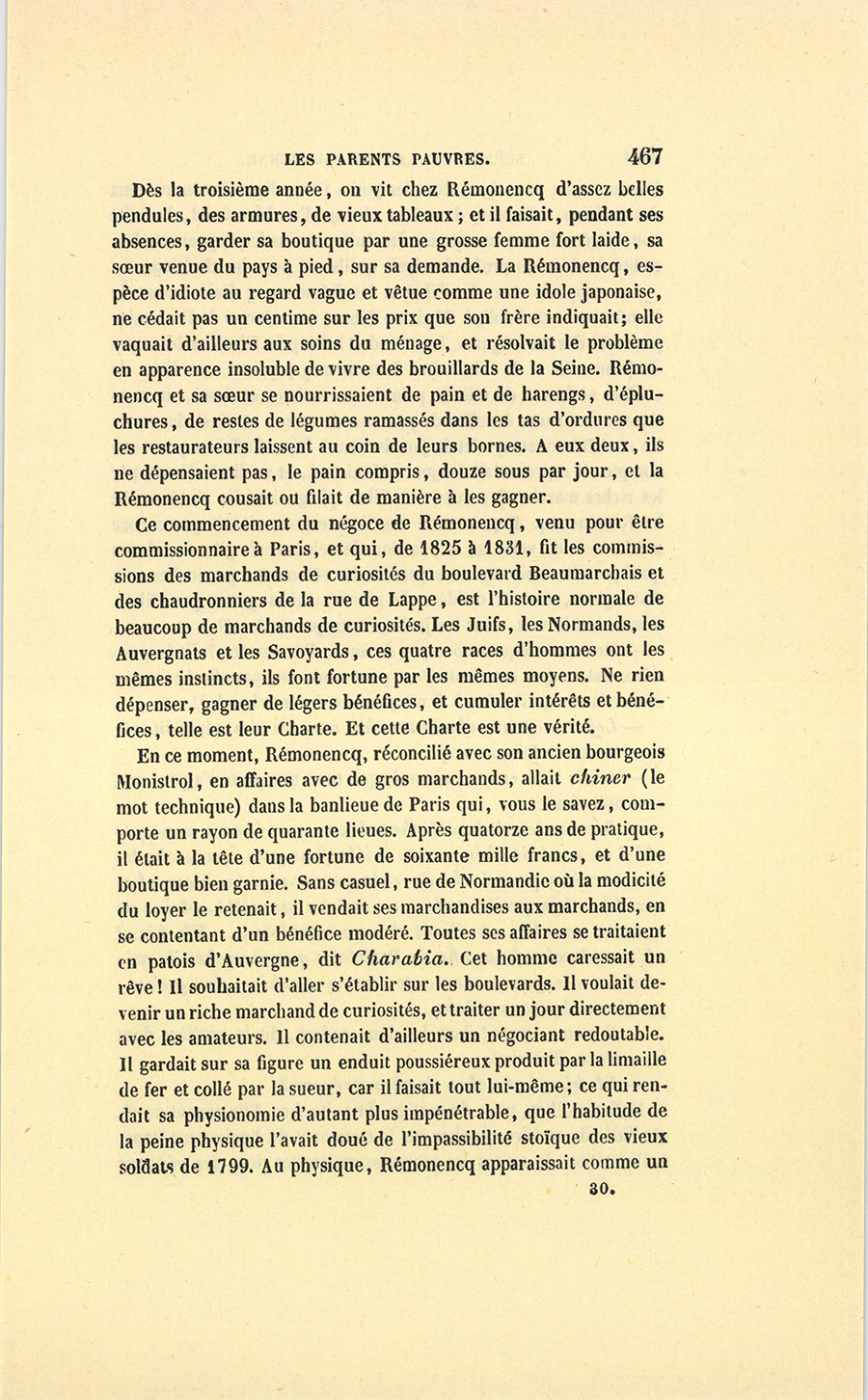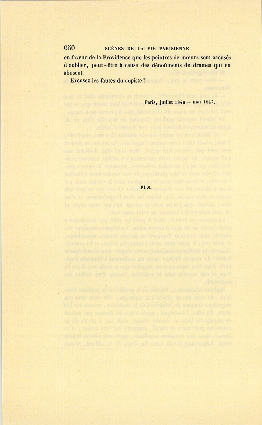 Madame Rémonencq, frappée de la prédiction de madame Fontaine, ne veut pas se retirer à la campagne, elle reste dans son magnifique magasin du boulevard de la Madeleine, encore une fois veuve. En effet, l’Auvergnat, après s’être fait donner par contrat de mariage les biens au dernier vivant, avait mis à portée de sa femme un petit verre de vitriol, comptant sur une erreur, et sa femme, dans une intention excellente, ayant mis ailleurs le petit verre, Rémonencq l’avala. Cette fin, digne de ce scélérat, prouve {p. 650} en faveur de la Providence que les peintres de mœurs sont accusés d’oublier, peut-être à cause des dénoûments de drames qui en abusent.