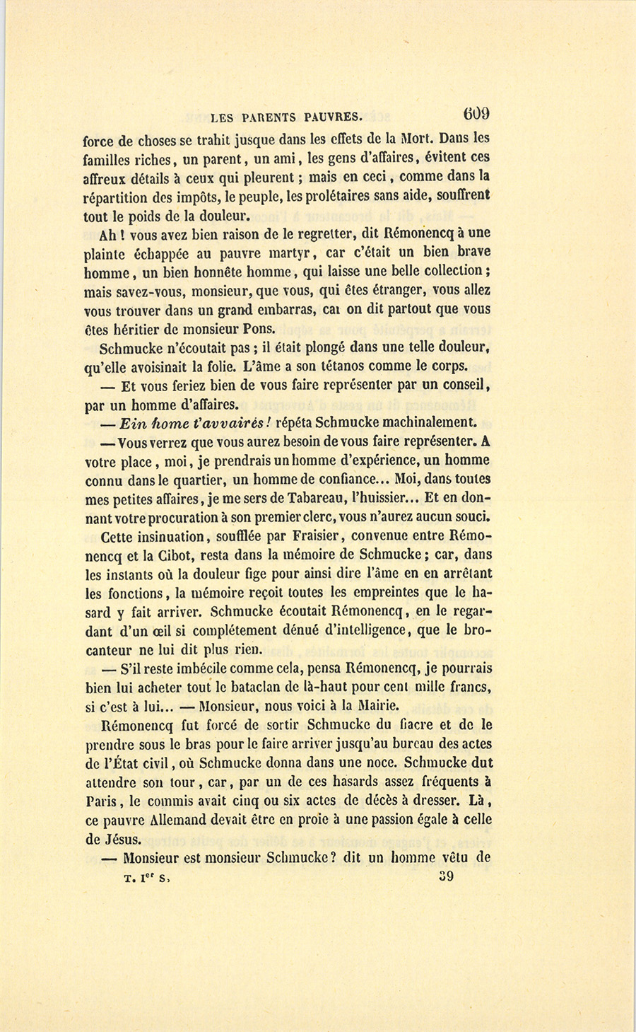 – Monsieur, il y a là, dit-il à son patron, un homme qui veut parler à monsieur Schmucke…