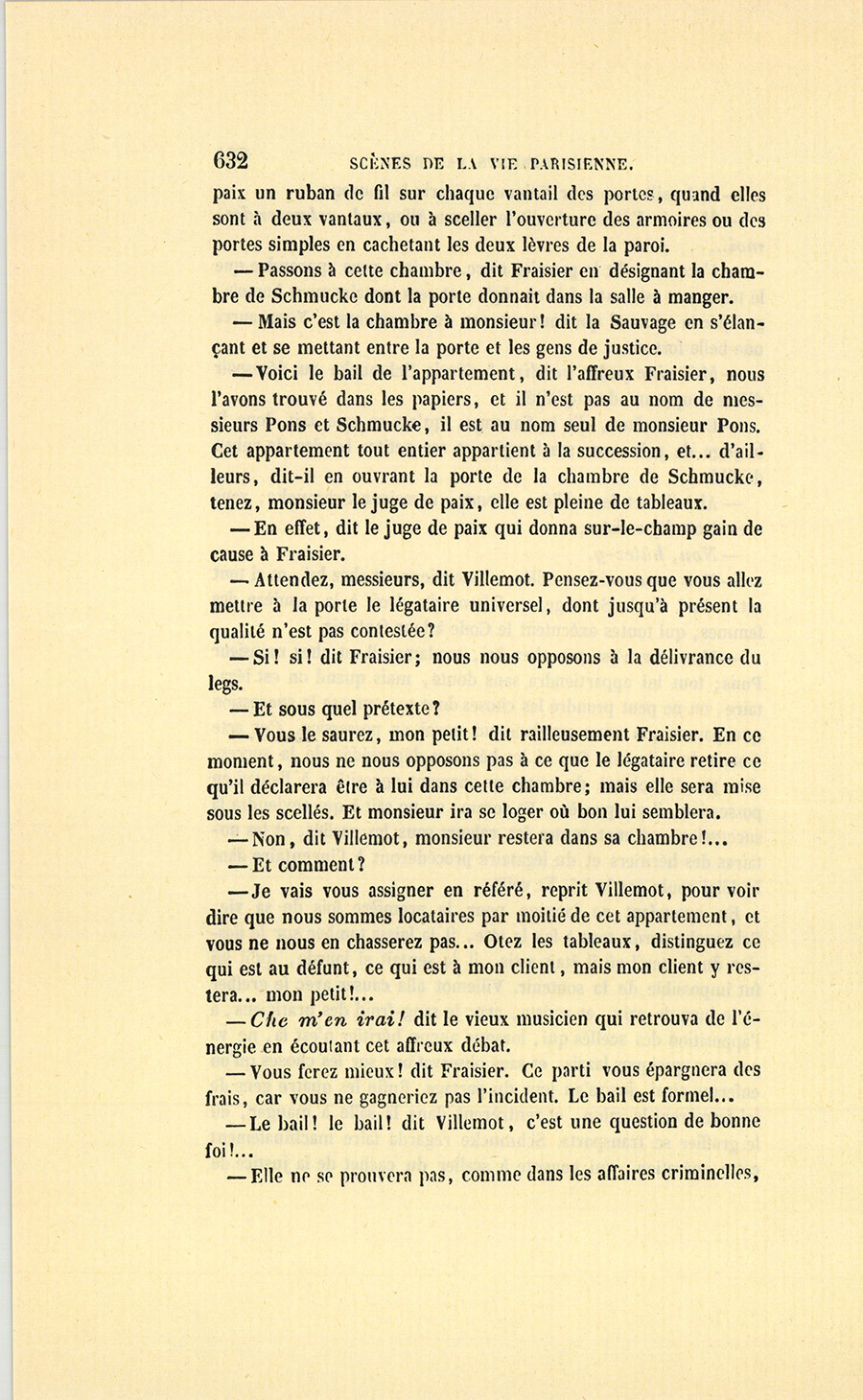 – Ah ! mon cher monsieur Schmucke, vous avez enrichi des monstres, des gens qui veulent vous ravir l’honneur. J’ai porté cela chez un brave homme, un avoué qui connaît ce Fraisier, et il dit que vous devez punir tant de scélératesse en acceptant le procès et qu’ils reculeront… Lisez.