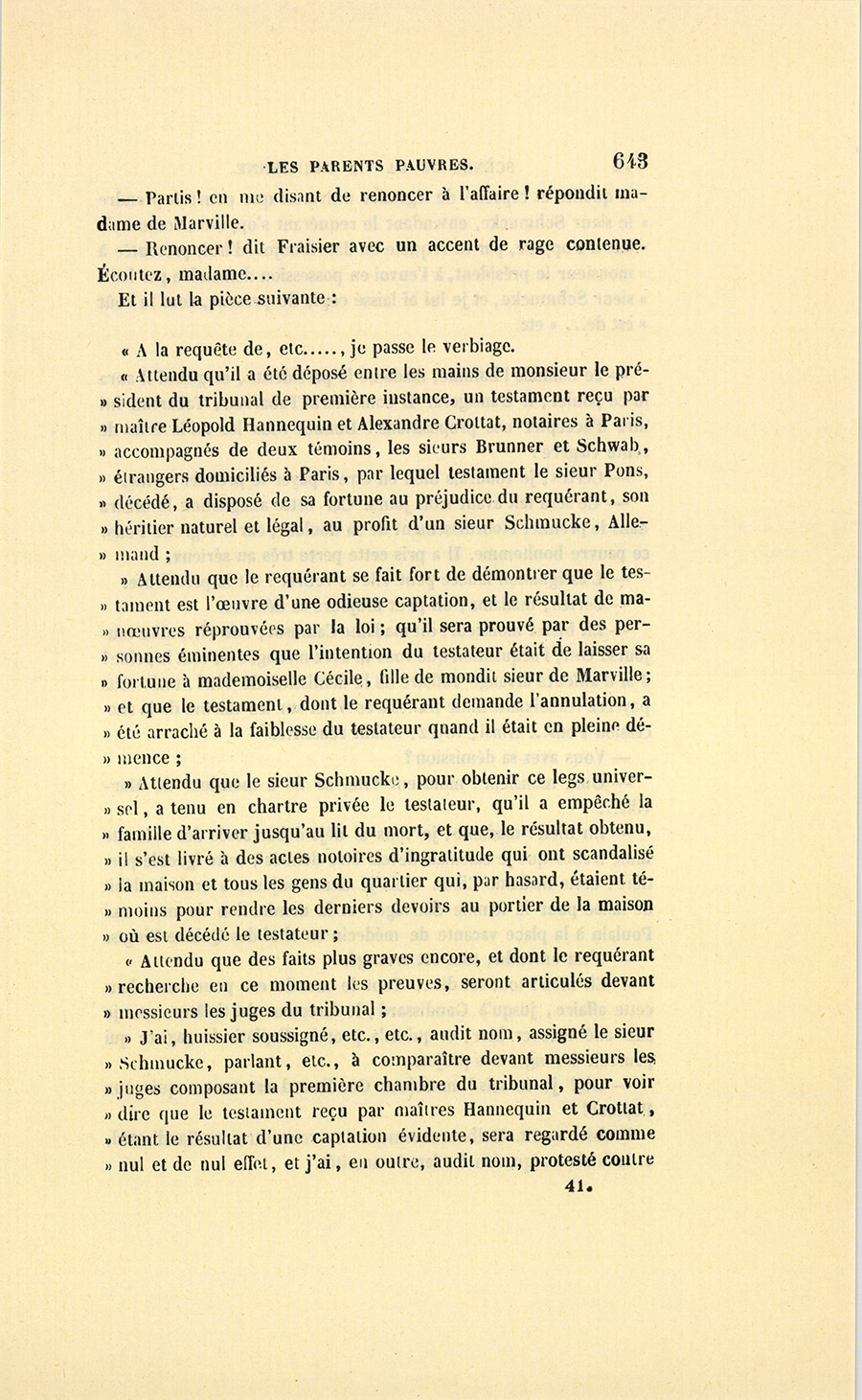 Attendu qu’il a été déposé entre les mains de monsieur le président du tribunal de première instance, un testament reçu par maître Léopold Hannequin et Alexandre Crottat, notaires à Paris, accompagnés de deux témoins, les sieurs Brunner et Schwab, étrangers domiciliés à Paris, par lequel testament le sieur Pons, décédé, a disposé de sa fortune au préjudice du requérant, son héritier naturel et légal, au profit d’un sieur Schmucke, Allemand ;