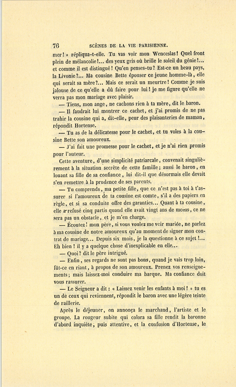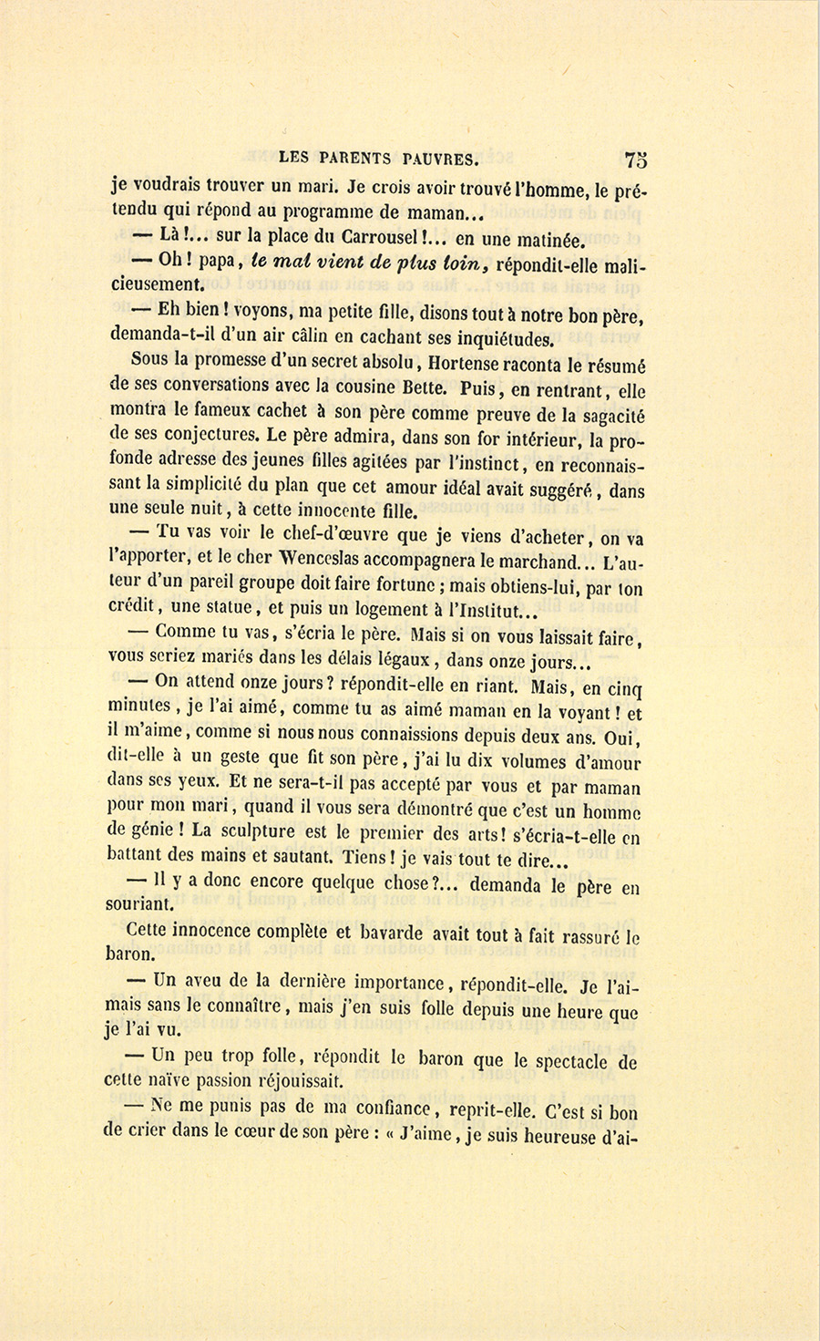 – Il s’agit de ton mariage, dit la cousine Bette à l’oreille de sa petite cousine Hortense sans paraître offensée de la façon dont la baronne s’y prenait pour les renvoyer, en la comptant pour presque rien.
