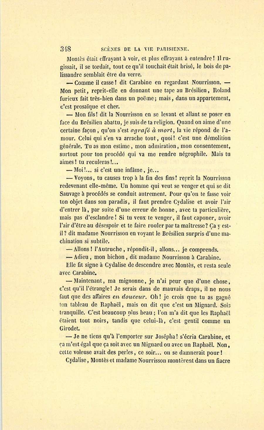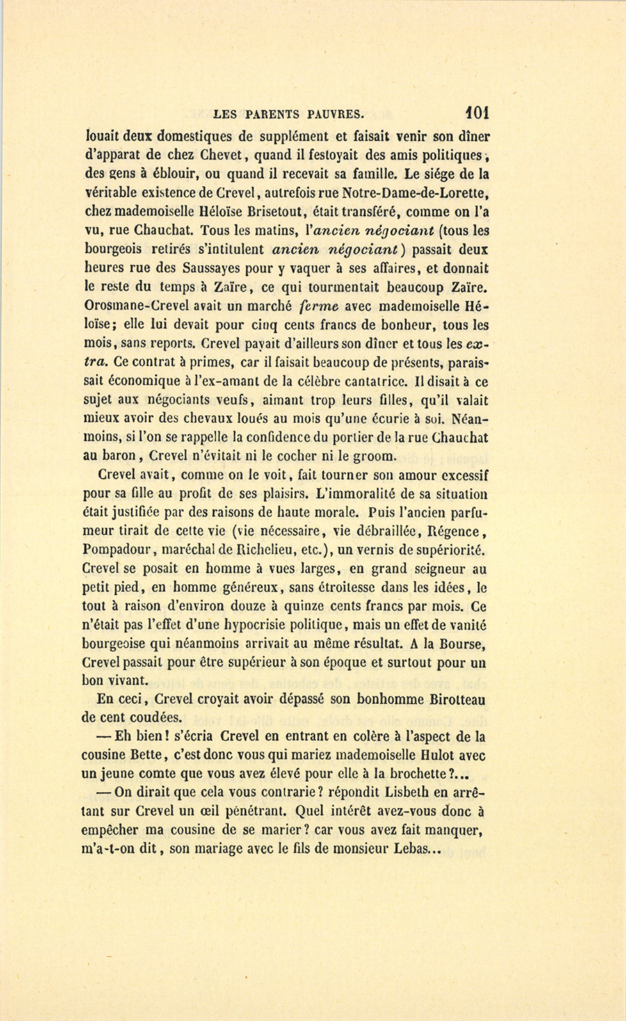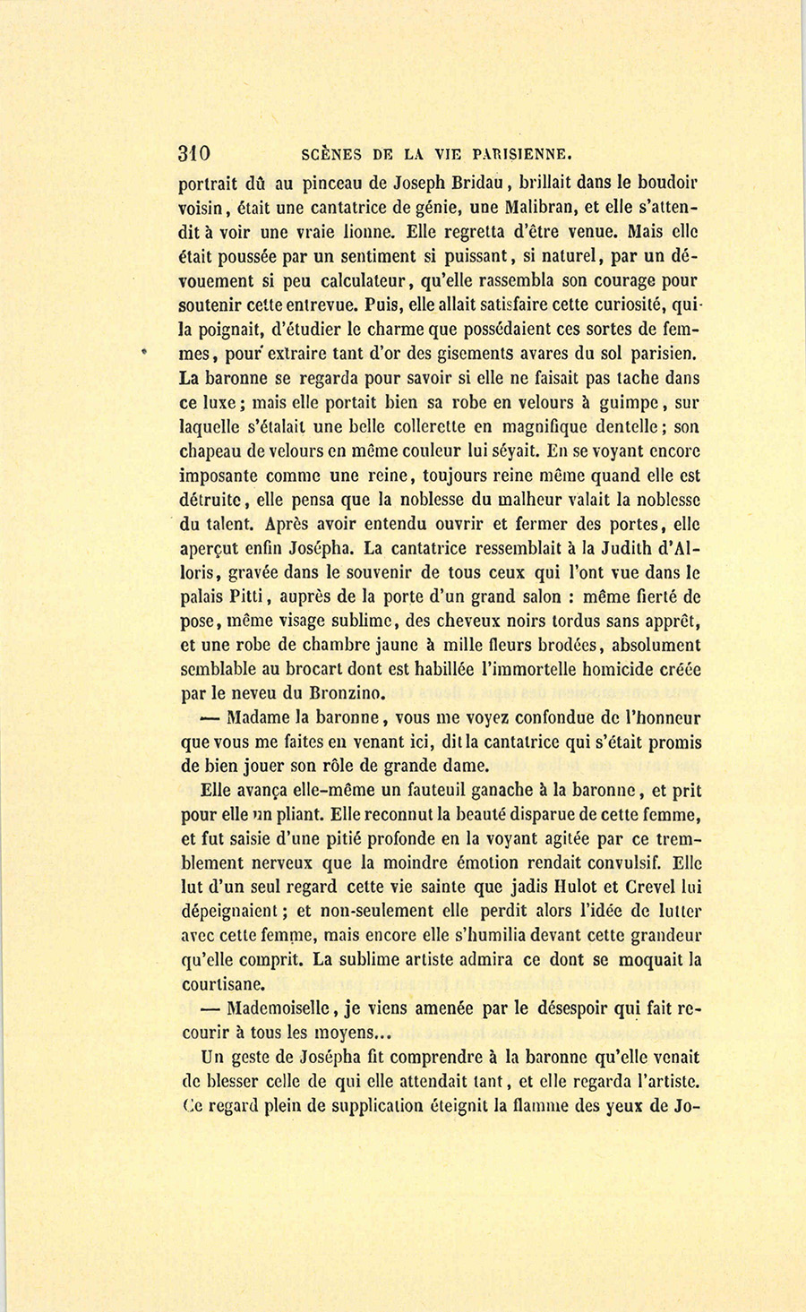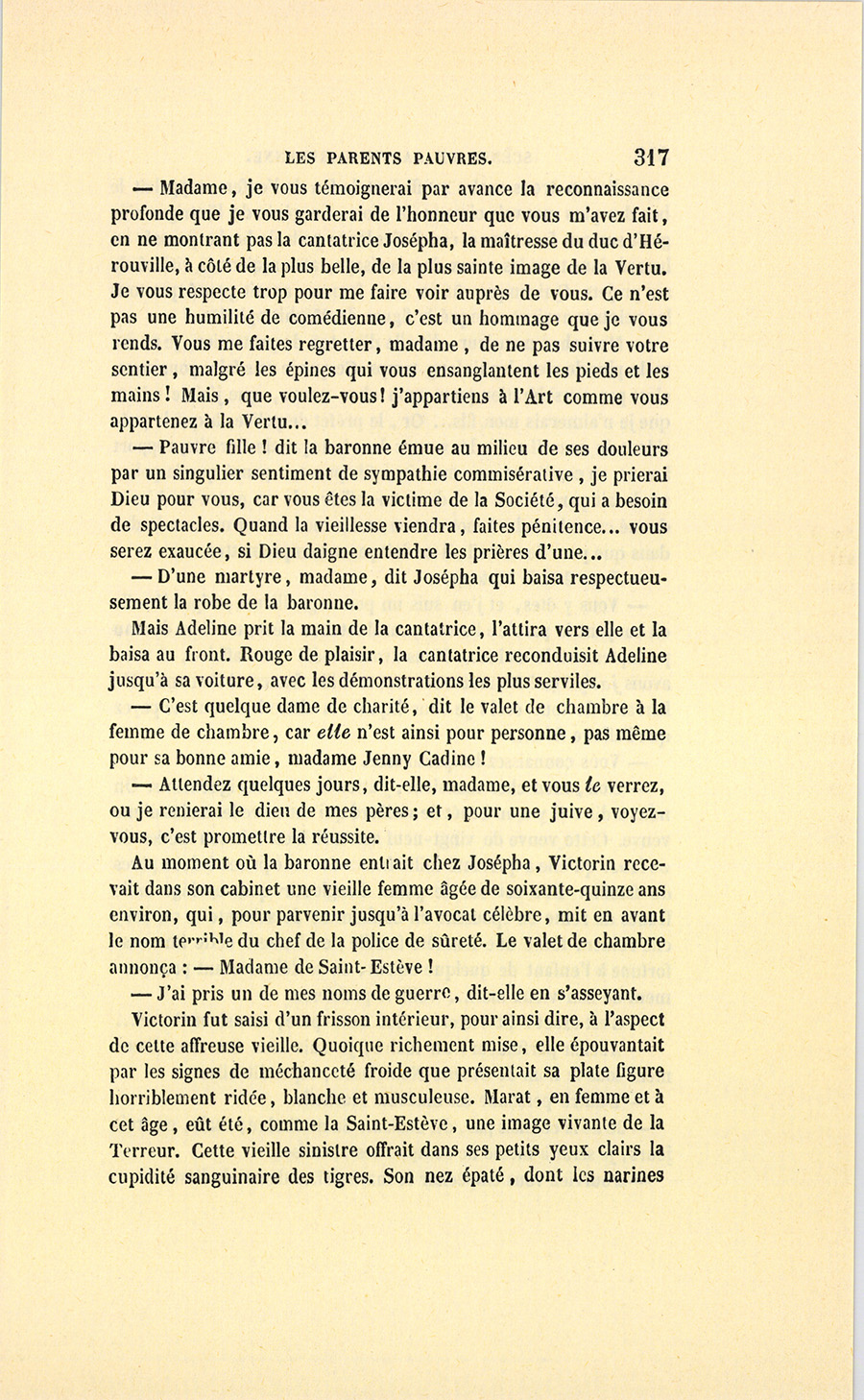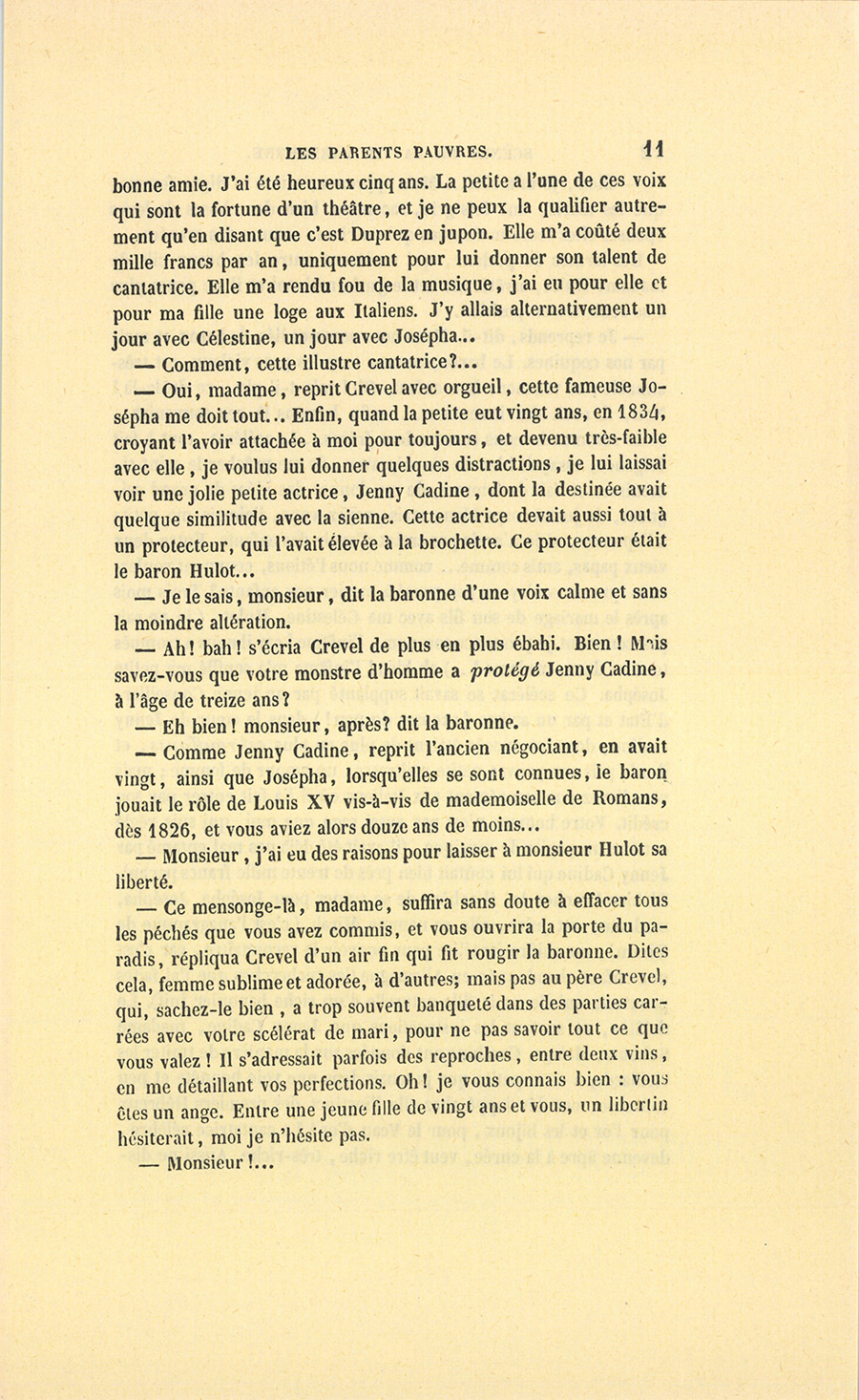 – Moi, veuf depuis cinq ans, reprit Crevel en parlant comme un homme qui va raconter une histoire, ne voulant pas me remarier, dans l’intérêt de ma fille que j’idolâtre, ne voulant pas non plus avoir d’accointances chez moi, quoique j’eusse alors une très-jolie dame de comptoir, j’ai mis, comme on dit, dans ses meubles une petite ouvrière de quinze ans, d’une beauté miraculeuse et de qui, je l’avoue, je devins amoureux à en perdre la tête. Aussi, madame, ai-je prié ma propre tante, que j’ai fait venir de mon pays (la sœur de ma mère !) de vivre avec cette charmante créature et de la surveiller pour qu’elle restât aussi sage que possible dans cette situation, comment dire ?… chocnoso… non, illicite !… La petite, dont la vocation pour la musique était visible, a eu des maîtres, elle a reçu de l’éducation (il fallait bien l’occuper !). Et d’ailleurs, je voulais être à la fois son père, son bienfaiteur, et, lâchons le mot, son amant ; faire d’une pierre deux coups, une bonne action et une {p. 11} bonne amie. J’ai été heureux cinq ans. La petite a l’une de ces voix qui sont la fortune d’un théâtre, et je ne peux la qualifier autrement qu’en disant que c’est Duprez en jupon. Elle m’a coûté deux mille francs par an, uniquement pour lui donner son talent de cantatrice. Elle m’a rendu fou de la musique, j’ai eu pour elle et pour ma fille une loge aux Italiens. J’y allais alternativement un jour avec Célestine, un jour avec Josépha…