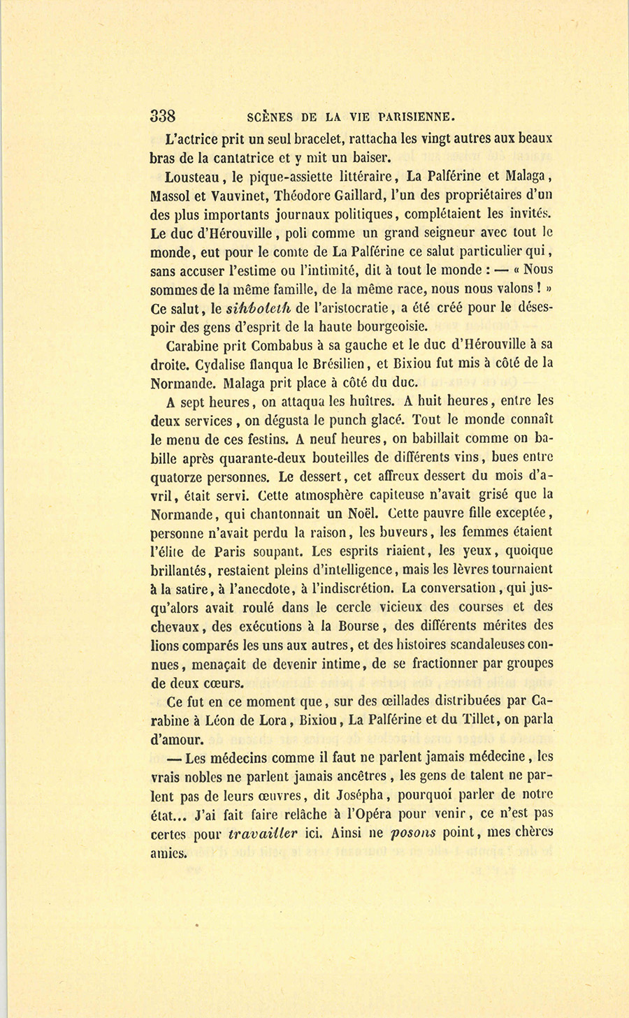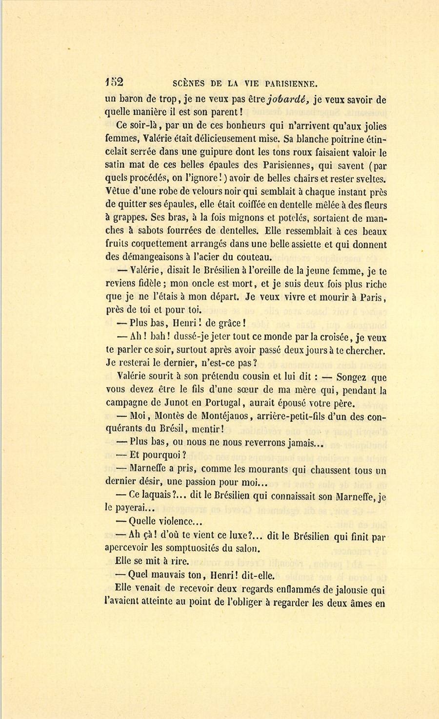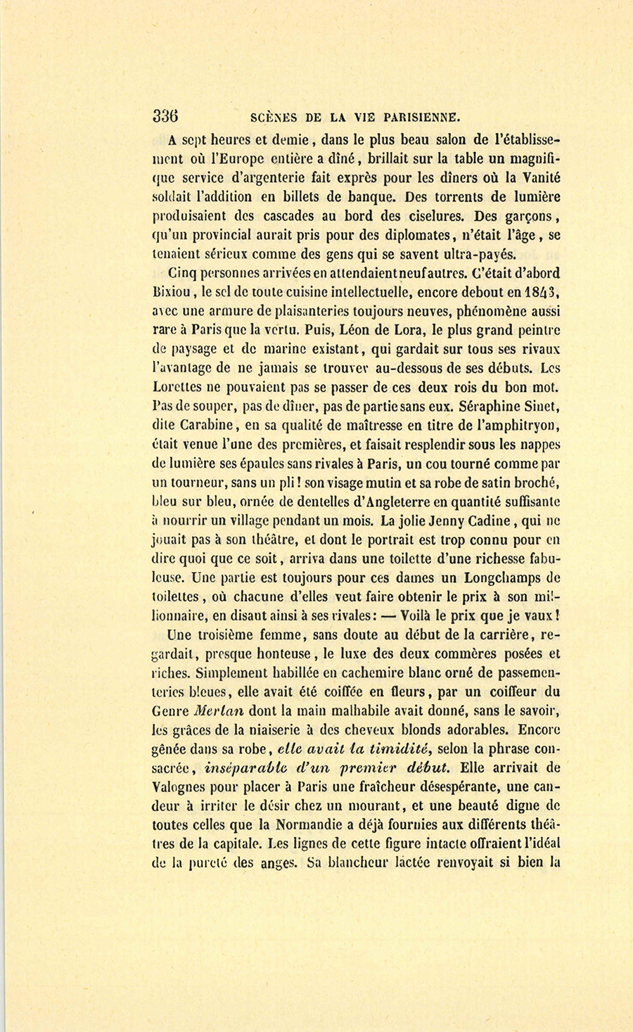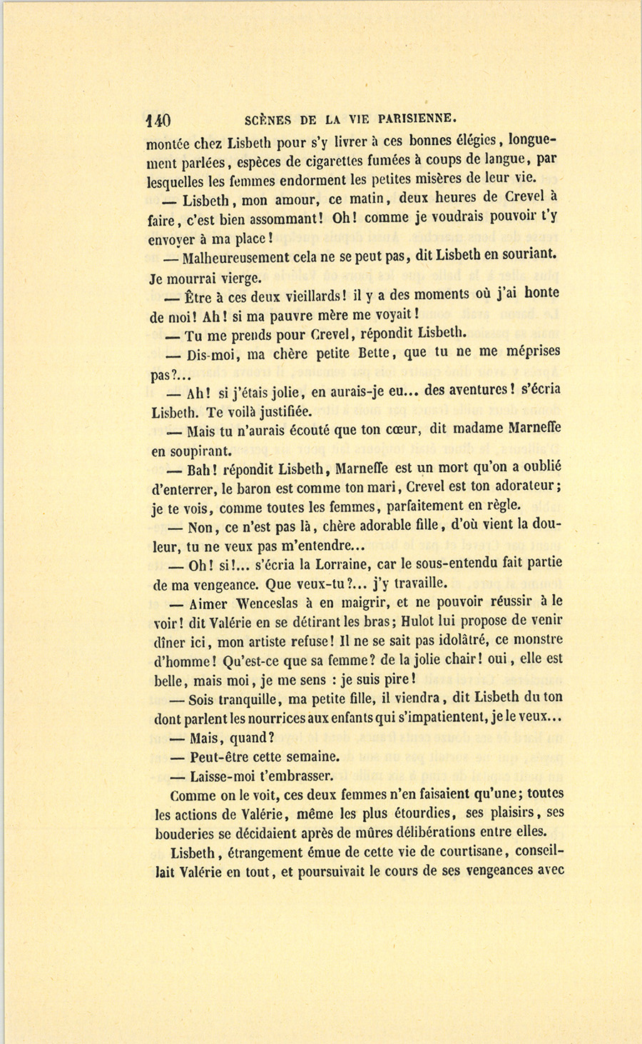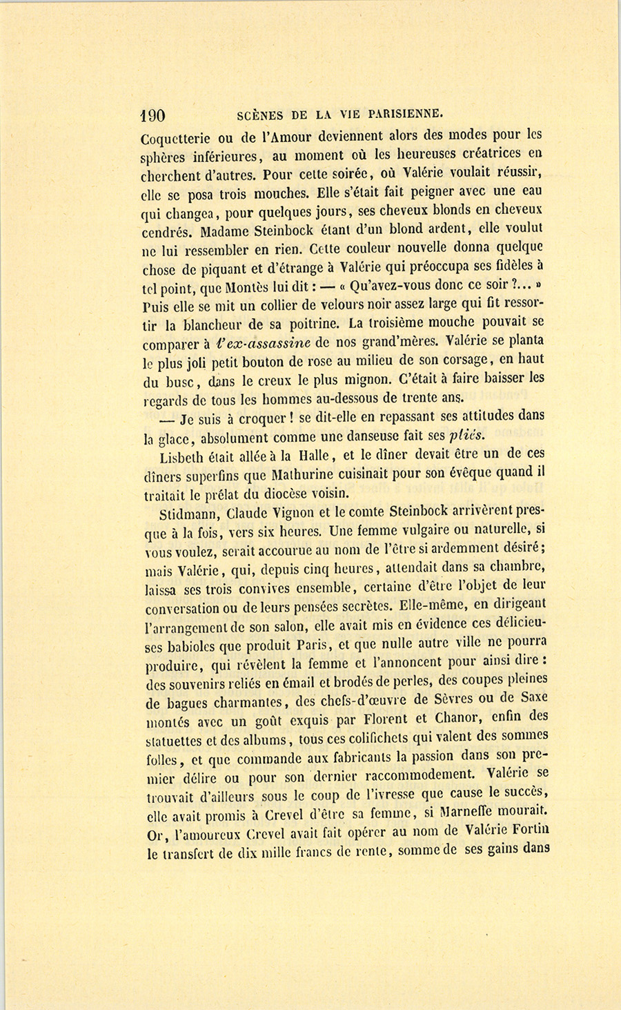 – Moi, veuf depuis cinq ans, reprit Crevel en parlant comme un homme qui va raconter une histoire, ne voulant pas me remarier, dans l’intérêt de ma fille que j’idolâtre, ne voulant pas non plus avoir d’accointances chez moi, quoique j’eusse alors une très-jolie dame de comptoir, j’ai mis, comme on dit, dans ses meubles une petite ouvrière de quinze ans, d’une beauté miraculeuse et de qui, je l’avoue, je devins amoureux à en perdre la tête. Aussi, madame, ai-je prié ma propre tante, que j’ai fait venir de mon pays (la sœur de ma mère !) de vivre avec cette charmante créature et de la surveiller pour qu’elle restât aussi sage que possible dans cette situation, comment dire ?… chocnoso… non, illicite !… La petite, dont la vocation pour la musique était visible, a eu des maîtres, elle a reçu de l’éducation (il fallait bien l’occuper !). Et d’ailleurs, je voulais être à la fois son père, son bienfaiteur, et, lâchons le mot, son amant ; faire d’une pierre deux coups, une bonne action et une {p. 11} bonne amie. J’ai été heureux cinq ans. La petite a l’une de ces voix qui sont la fortune d’un théâtre, et je ne peux la qualifier autrement qu’en disant que c’est Duprez en jupon. Elle m’a coûté deux mille francs par an, uniquement pour lui donner son talent de cantatrice. Elle m’a rendu fou de la musique, j’ai eu pour elle et pour ma fille une loge aux Italiens. J’y allais alternativement un jour avec Célestine, un jour avec Josépha…