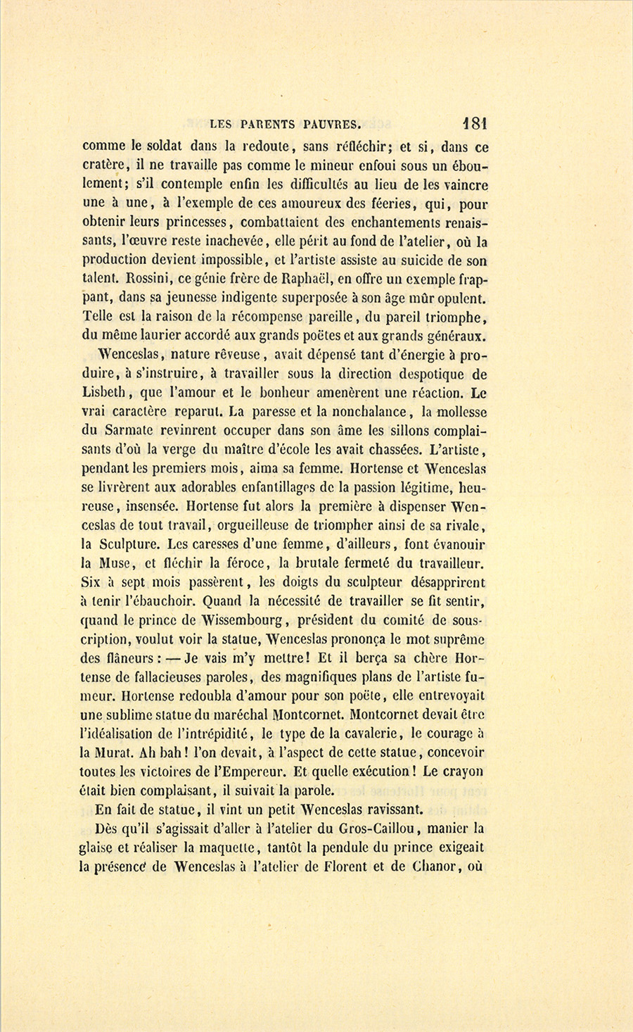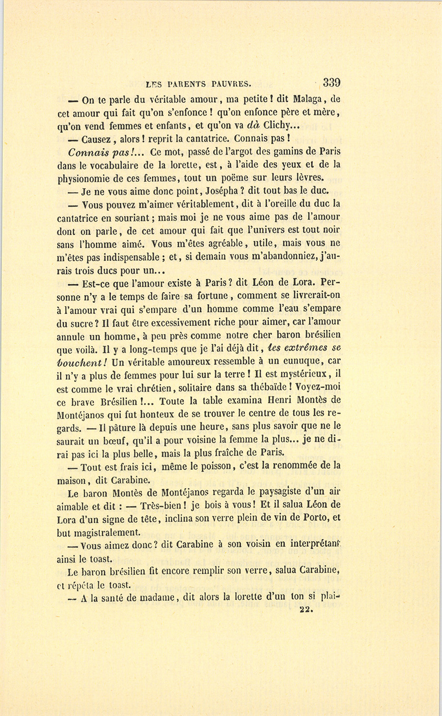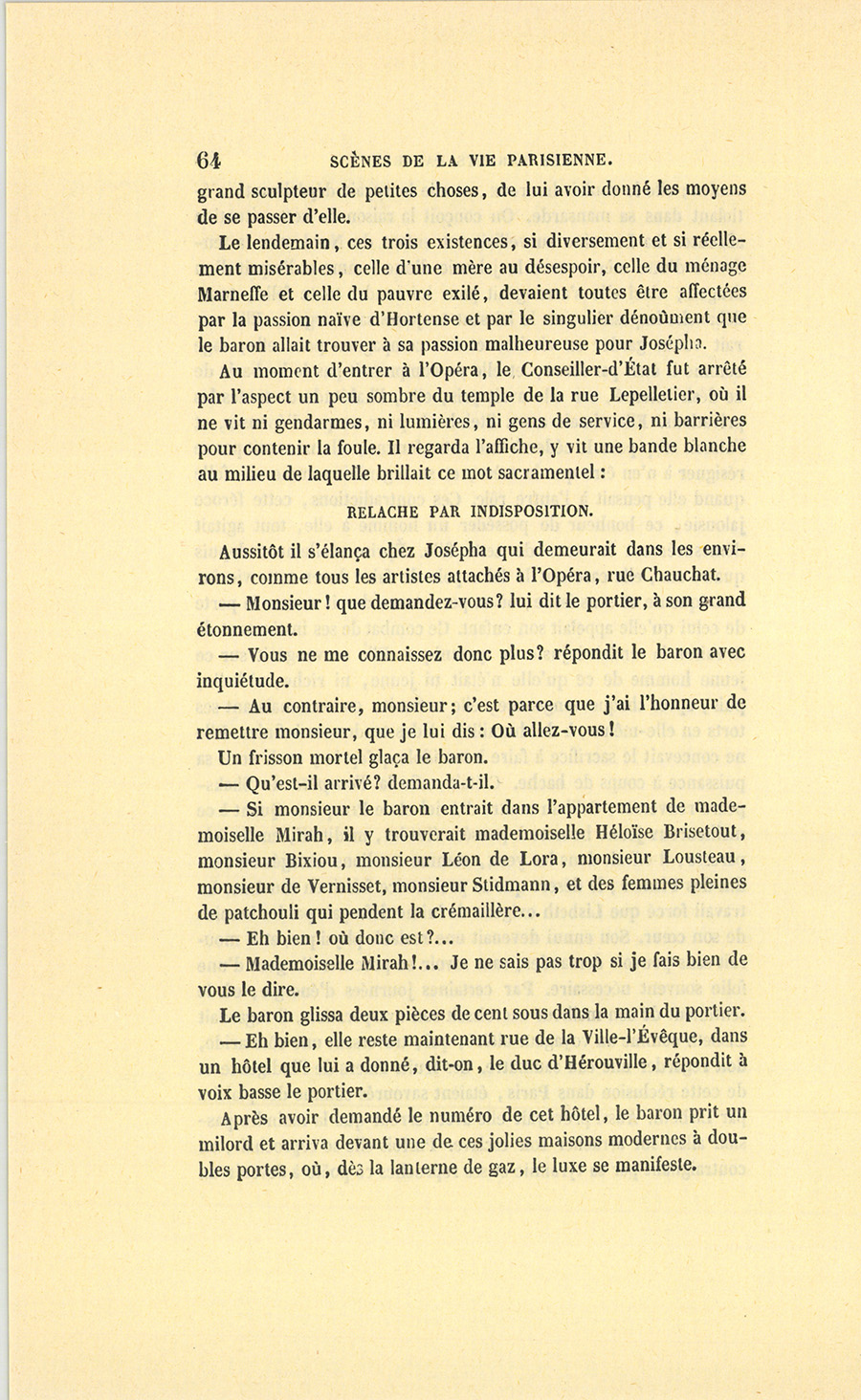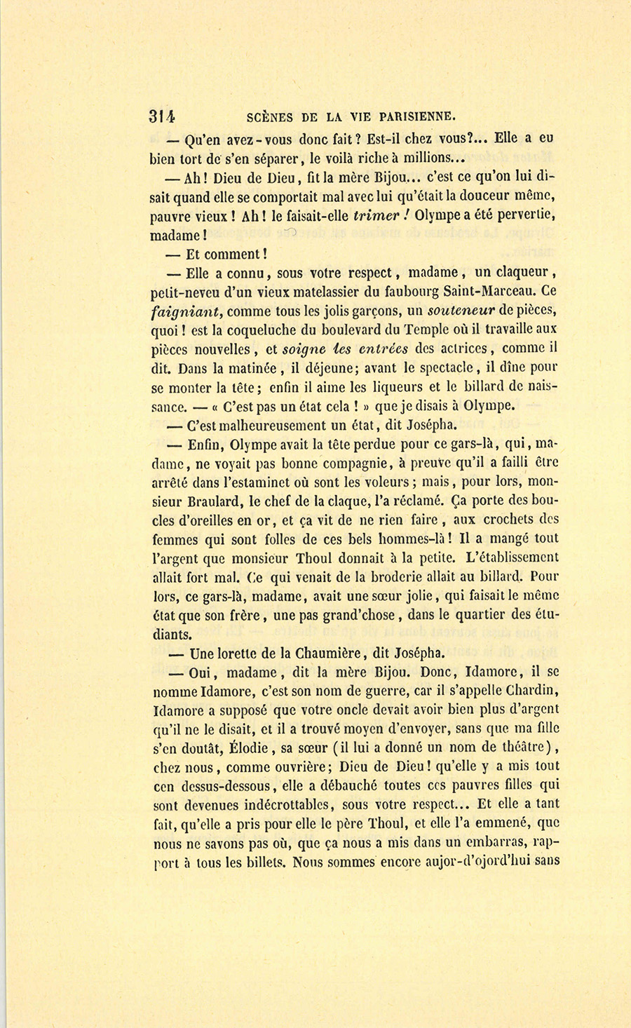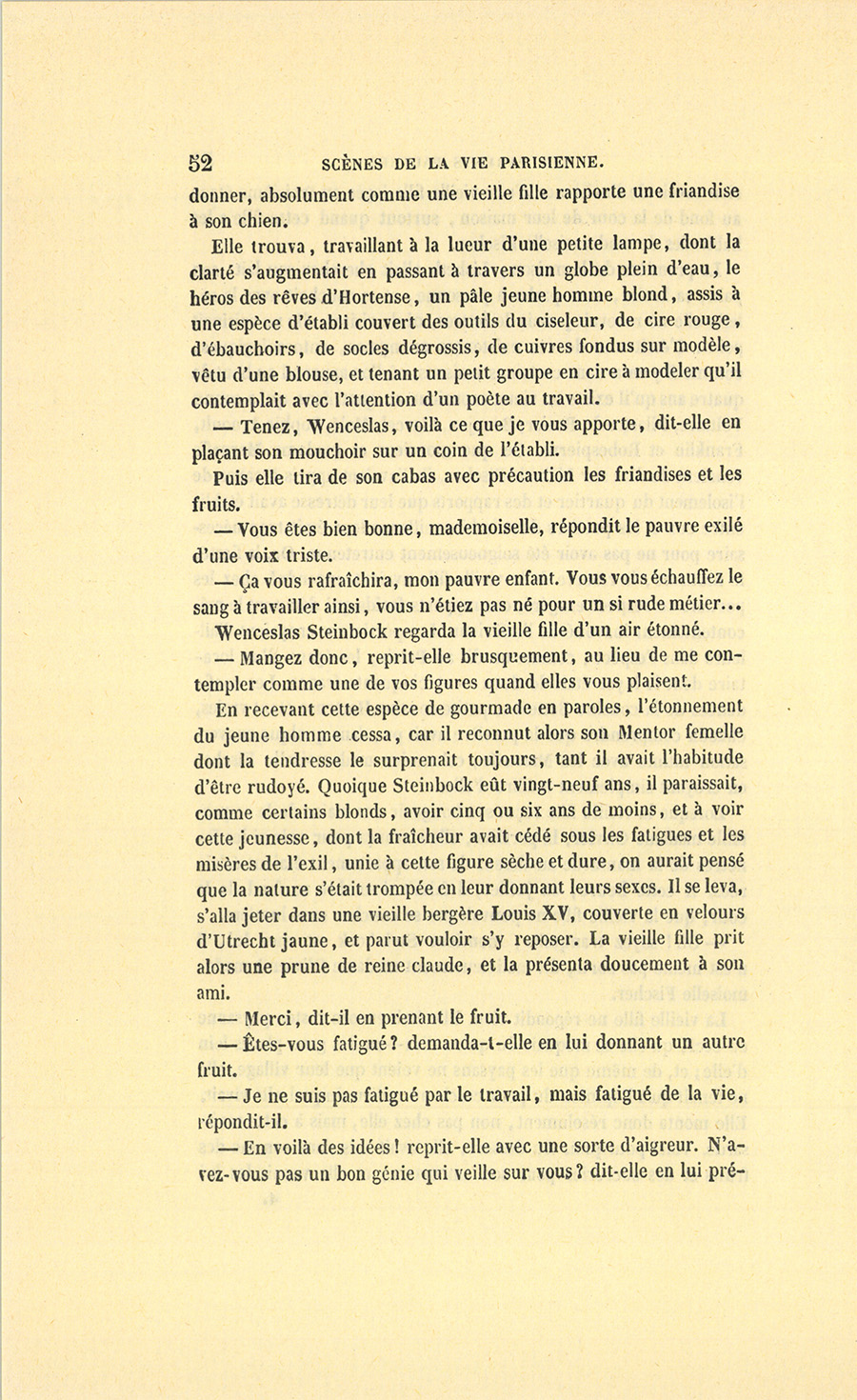 – Moi, veuf depuis cinq ans, reprit Crevel en parlant comme un homme qui va raconter une histoire, ne voulant pas me remarier, dans l’intérêt de ma fille que j’idolâtre, ne voulant pas non plus avoir d’accointances chez moi, quoique j’eusse alors une très-jolie dame de comptoir, j’ai mis, comme on dit, dans ses meubles une petite ouvrière de quinze ans, d’une beauté miraculeuse et de qui, je l’avoue, je devins amoureux à en perdre la tête. Aussi, madame, ai-je prié ma propre tante, que j’ai fait venir de mon pays (la sœur de ma mère !) de vivre avec cette charmante créature et de la surveiller pour qu’elle restât aussi sage que possible dans cette situation, comment dire ?… chocnoso… non, illicite !… La petite, dont la vocation pour la musique était visible, a eu des maîtres, elle a reçu de l’éducation (il fallait bien l’occuper !). Et d’ailleurs, je voulais être à la fois son père, son bienfaiteur, et, lâchons le mot, son amant ; faire d’une pierre deux coups, une bonne action et une {p. 11} bonne amie. J’ai été heureux cinq ans. La petite a l’une de ces voix qui sont la fortune d’un théâtre, et je ne peux la qualifier autrement qu’en disant que c’est Duprez en jupon. Elle m’a coûté deux mille francs par an, uniquement pour lui donner son talent de cantatrice. Elle m’a rendu fou de la musique, j’ai eu pour elle et pour ma fille une loge aux Italiens. J’y allais alternativement un jour avec Célestine, un jour avec Josépha…