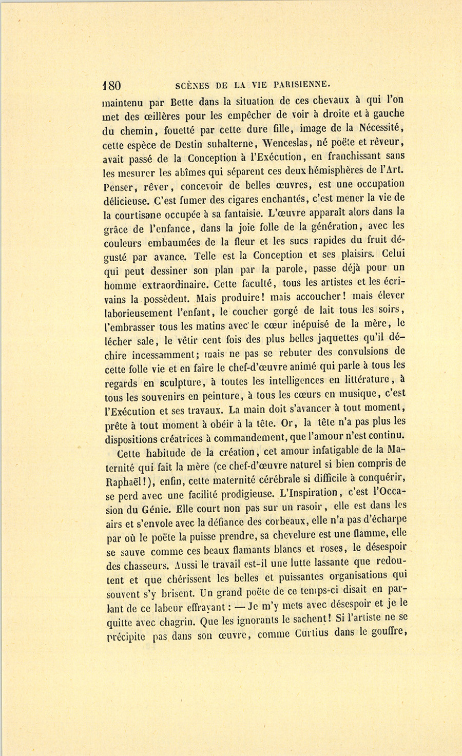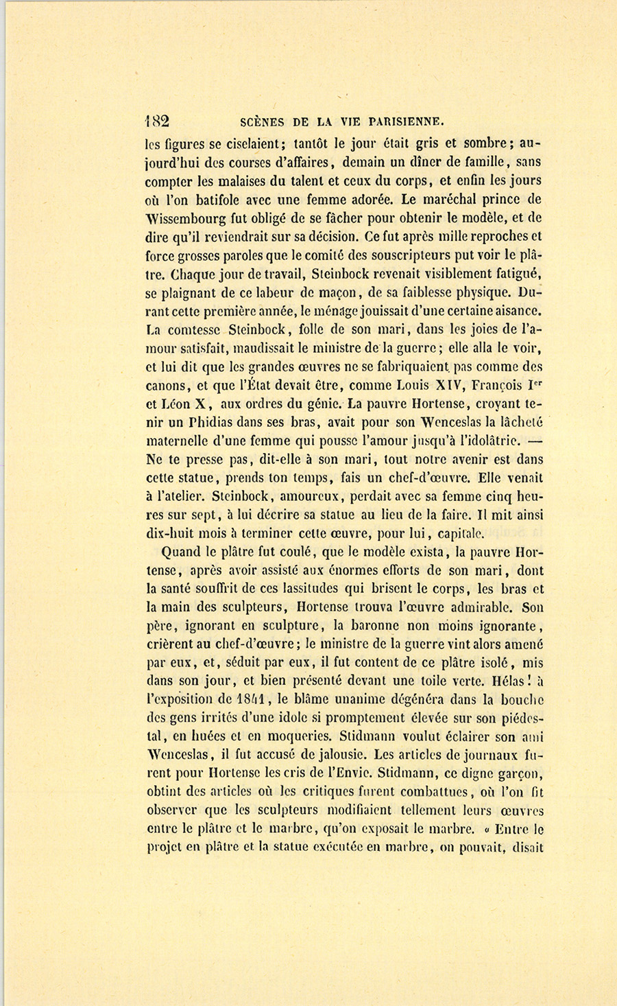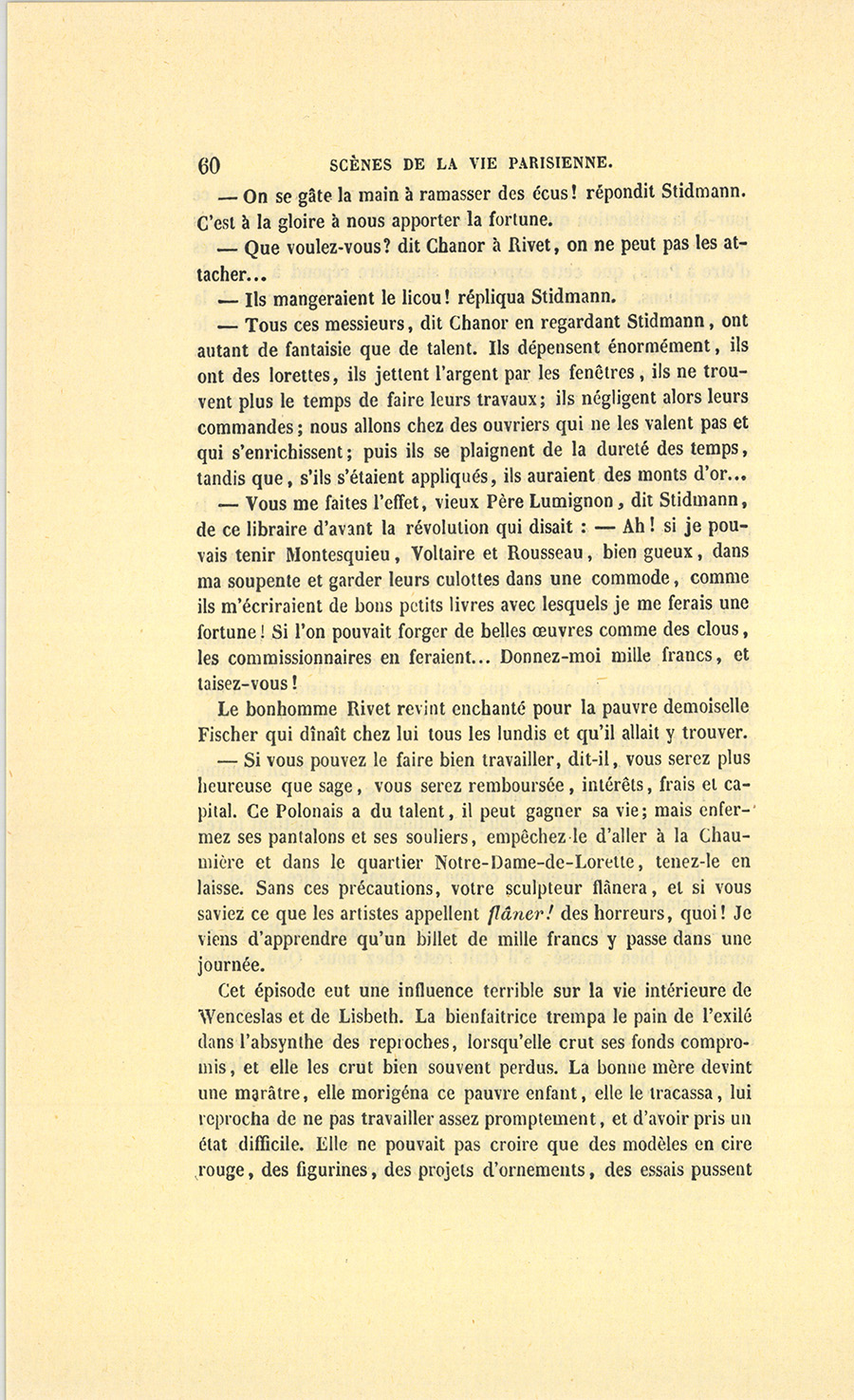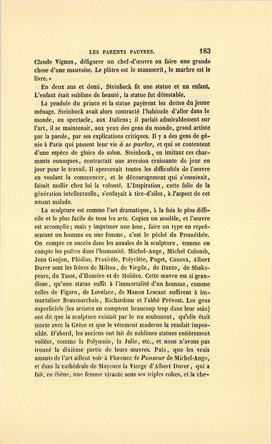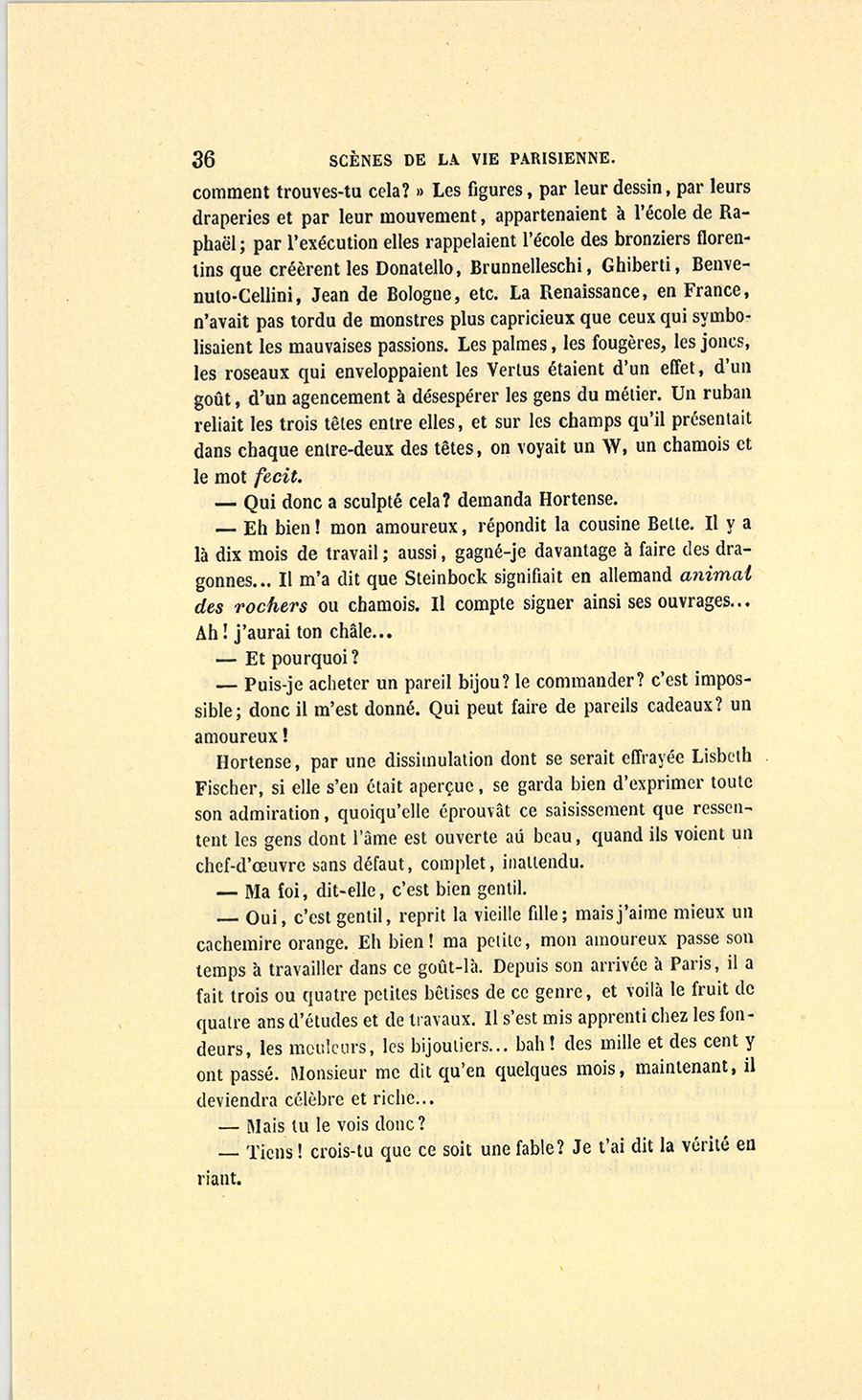 – Moi, veuf depuis cinq ans, reprit Crevel en parlant comme un homme qui va raconter une histoire, ne voulant pas me remarier, dans l’intérêt de ma fille que j’idolâtre, ne voulant pas non plus avoir d’accointances chez moi, quoique j’eusse alors une très-jolie dame de comptoir, j’ai mis, comme on dit, dans ses meubles une petite ouvrière de quinze ans, d’une beauté miraculeuse et de qui, je l’avoue, je devins amoureux à en perdre la tête. Aussi, madame, ai-je prié ma propre tante, que j’ai fait venir de mon pays (la sœur de ma mère !) de vivre avec cette charmante créature et de la surveiller pour qu’elle restât aussi sage que possible dans cette situation, comment dire ?… chocnoso… non, illicite !… La petite, dont la vocation pour la musique était visible, a eu des maîtres, elle a reçu de l’éducation (il fallait bien l’occuper !). Et d’ailleurs, je voulais être à la fois son père, son bienfaiteur, et, lâchons le mot, son amant ; faire d’une pierre deux coups, une bonne action et une {p. 11} bonne amie. J’ai été heureux cinq ans. La petite a l’une de ces voix qui sont la fortune d’un théâtre, et je ne peux la qualifier autrement qu’en disant que c’est Duprez en jupon. Elle m’a coûté deux mille francs par an, uniquement pour lui donner son talent de cantatrice. Elle m’a rendu fou de la musique, j’ai eu pour elle et pour ma fille une loge aux Italiens. J’y allais alternativement un jour avec Célestine, un jour avec Josépha…
