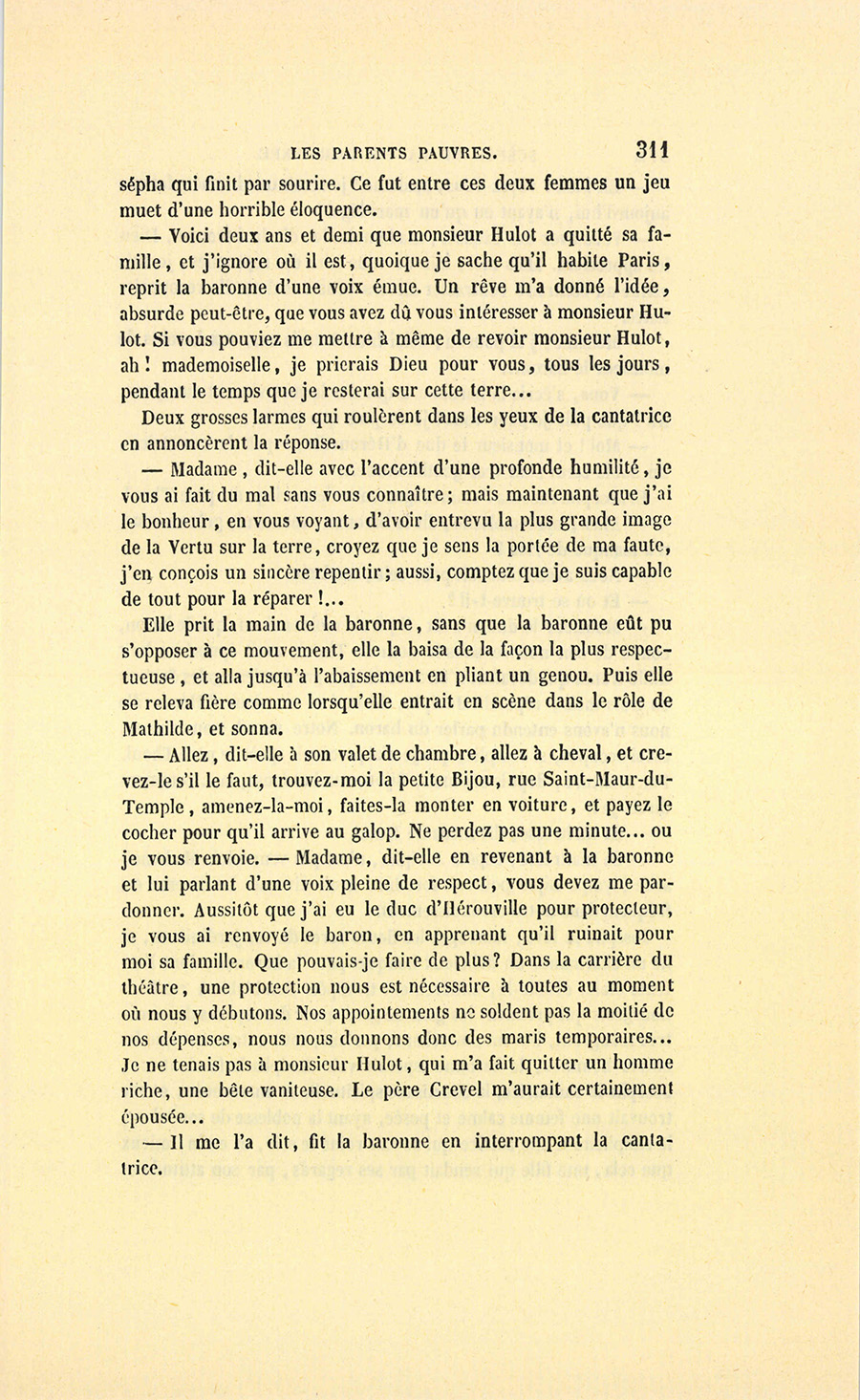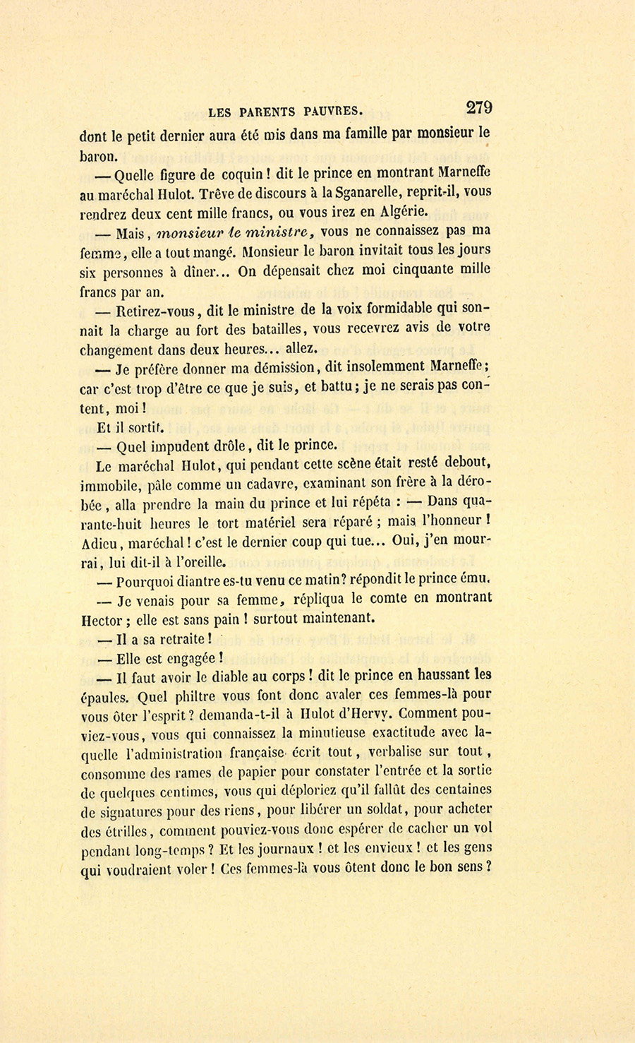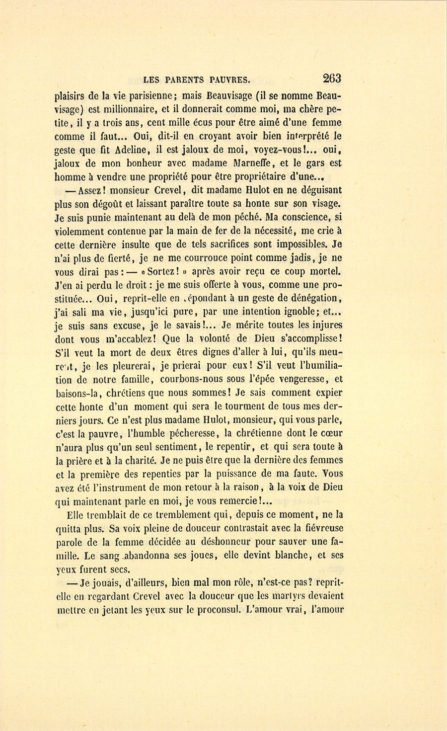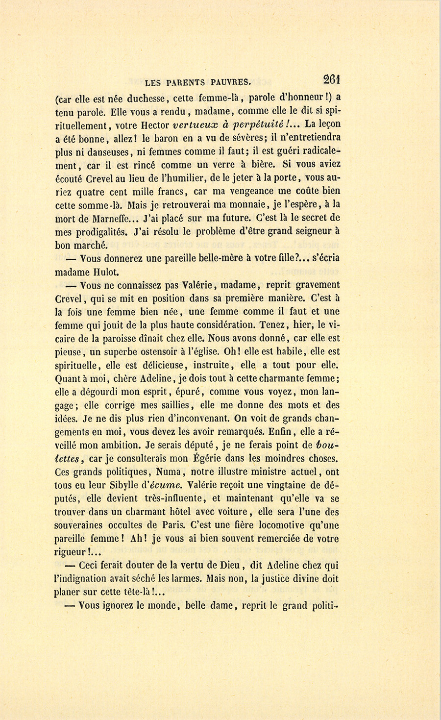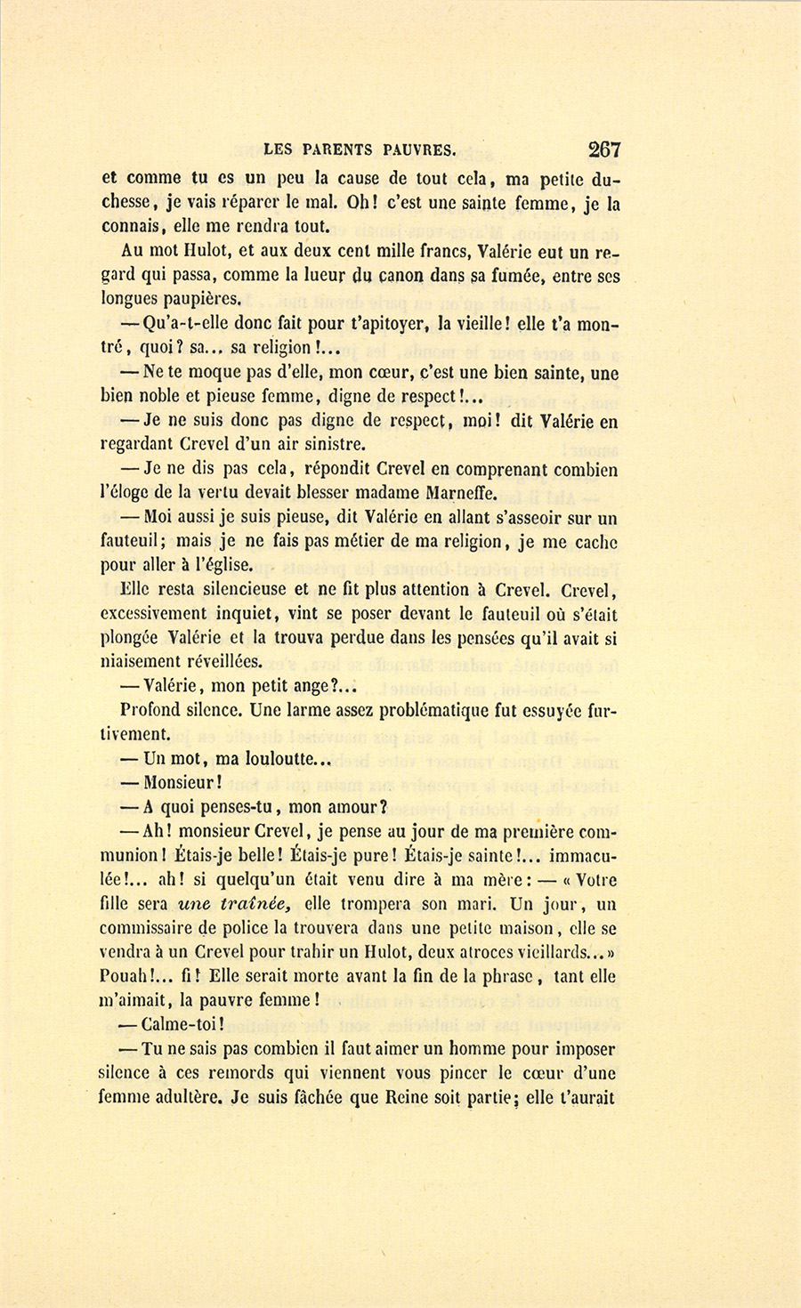 {p. 9} – Auriez-vous tenu ce langage, monsieur, demanda madame Hulot en regardant fixement Crevel, si pour vous j’eusse manqué à mes devoirs ?…