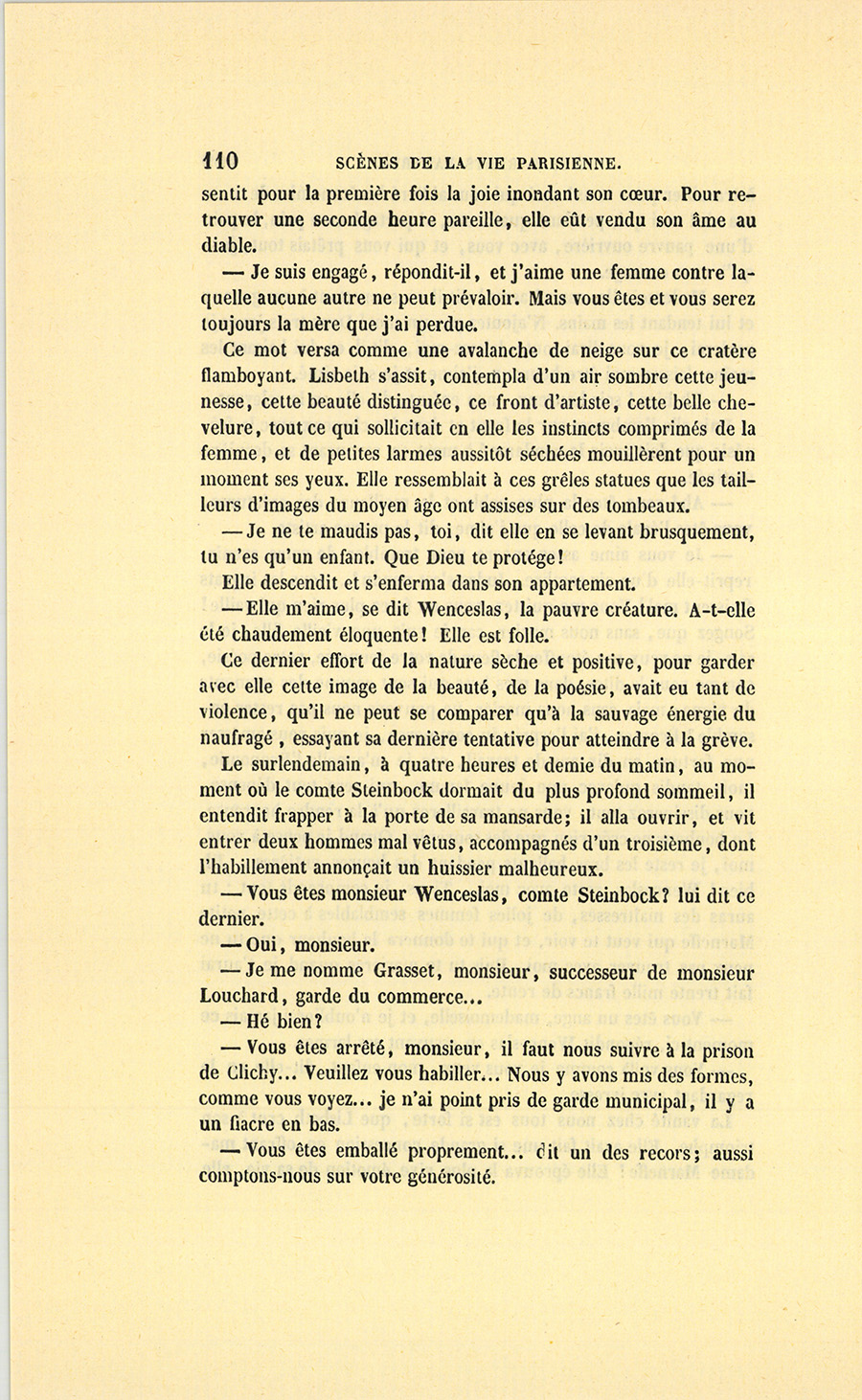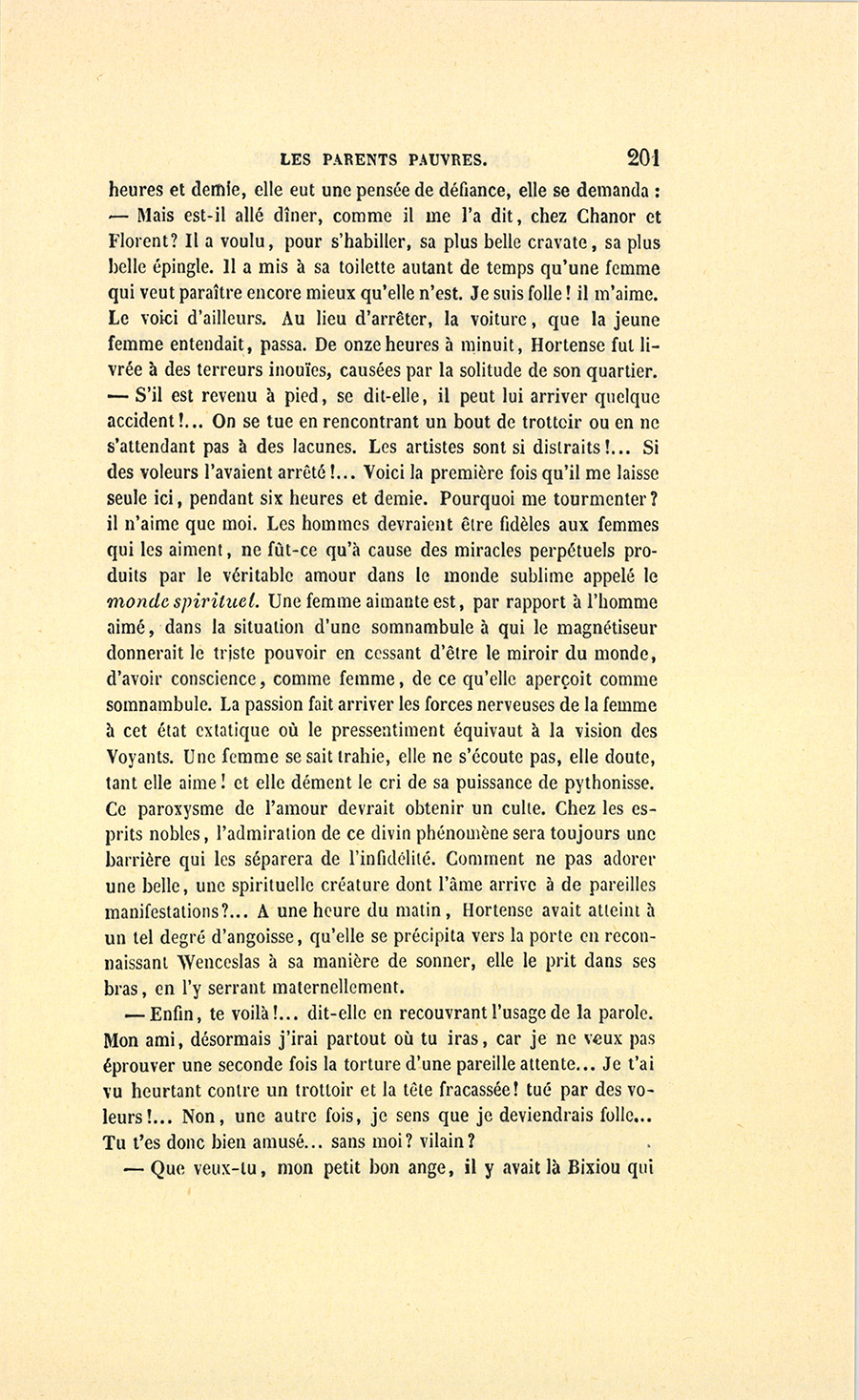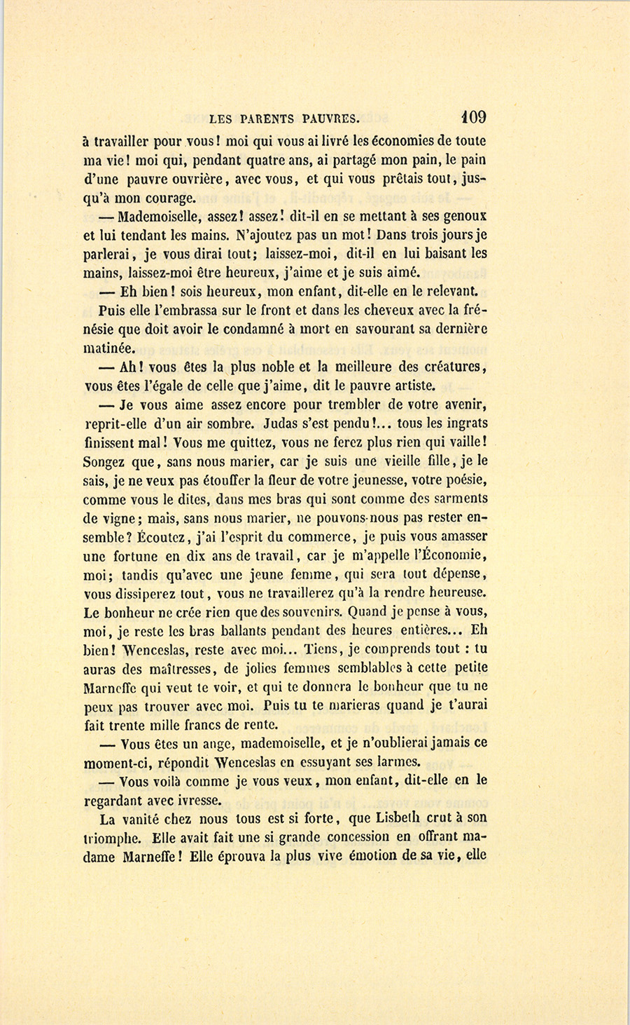 – Tu me fais quitter, dit-il à l’oreille de sa femme, la seule créature qui ait approché de l’amour que tu as pour moi ! Cette petite fond en larmes, et je ne puis pas l’abandonner ainsi…