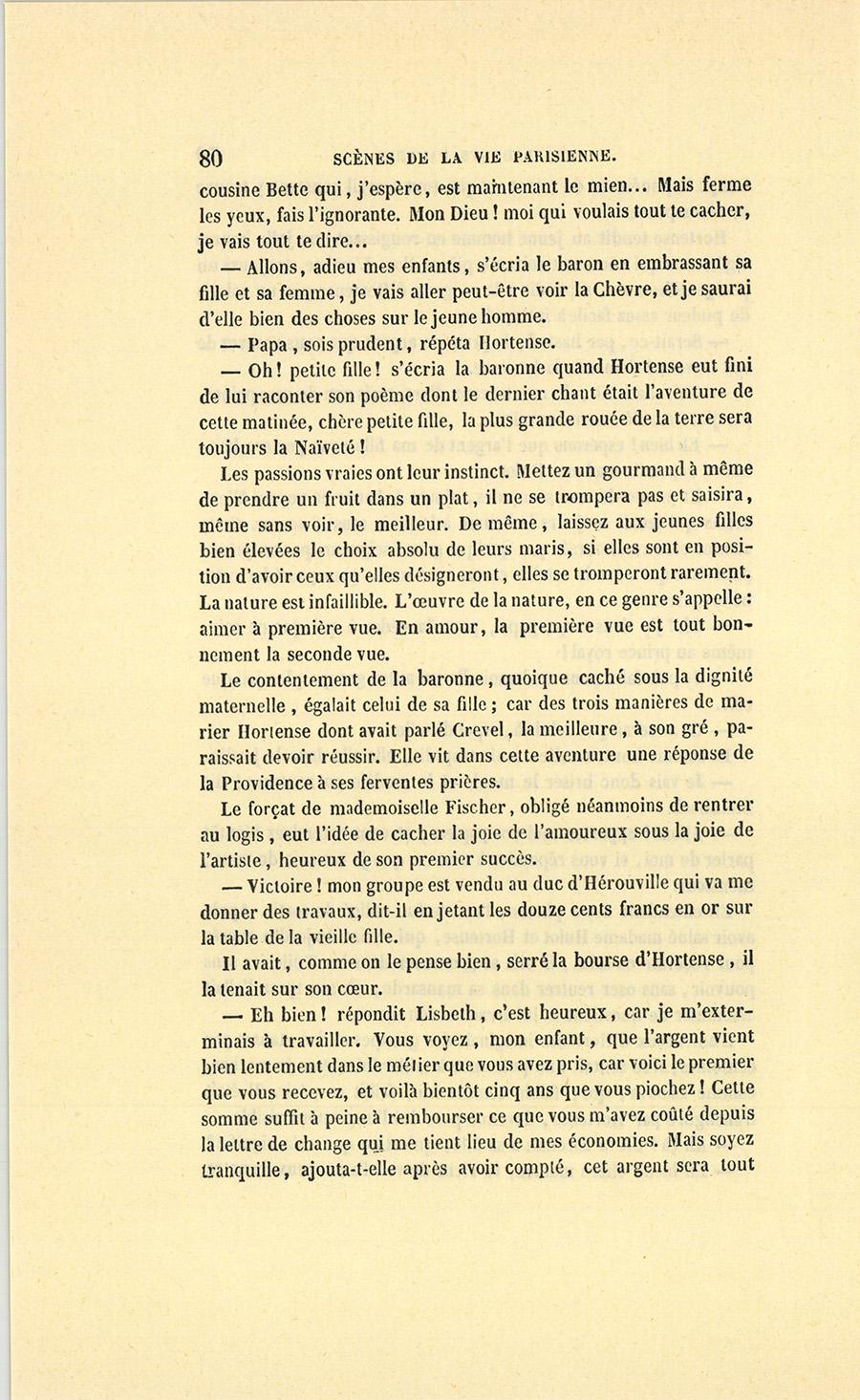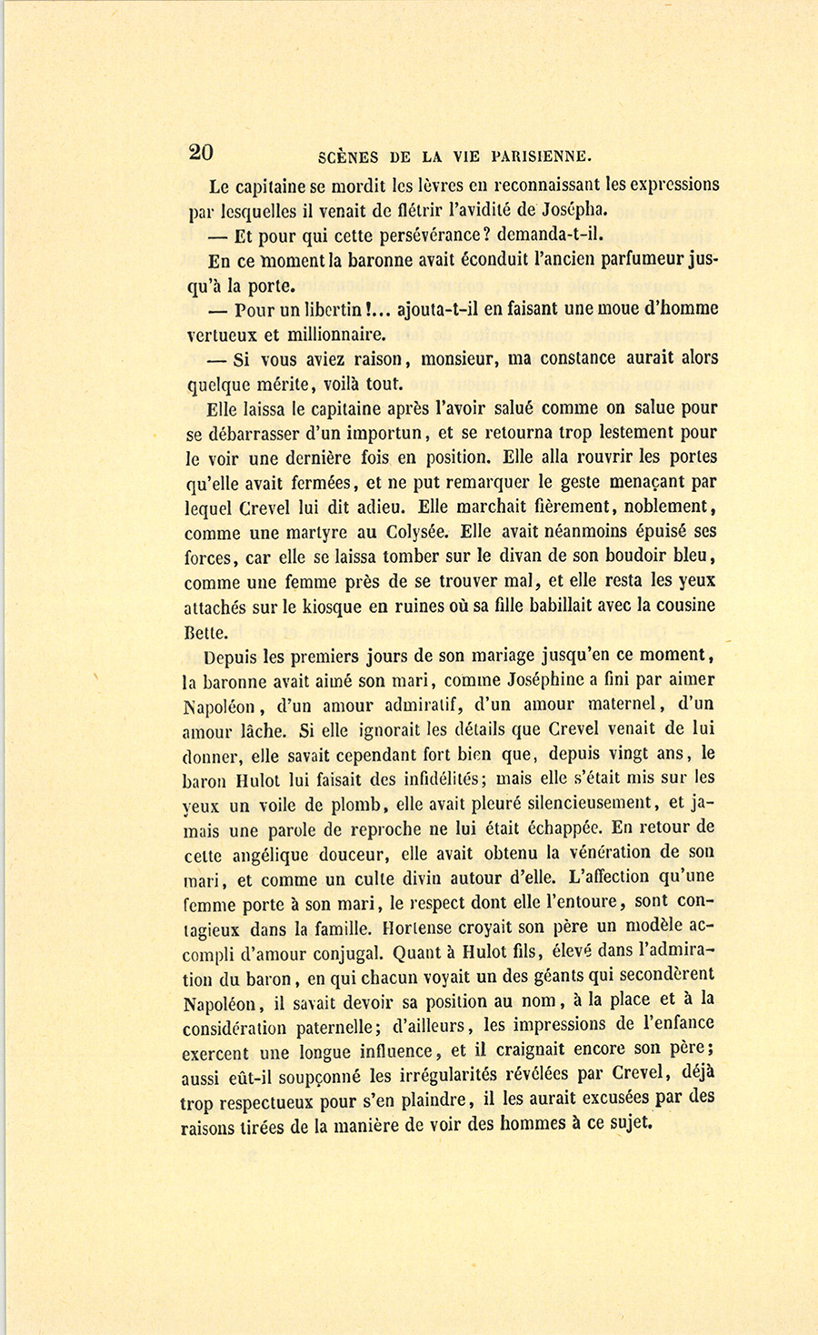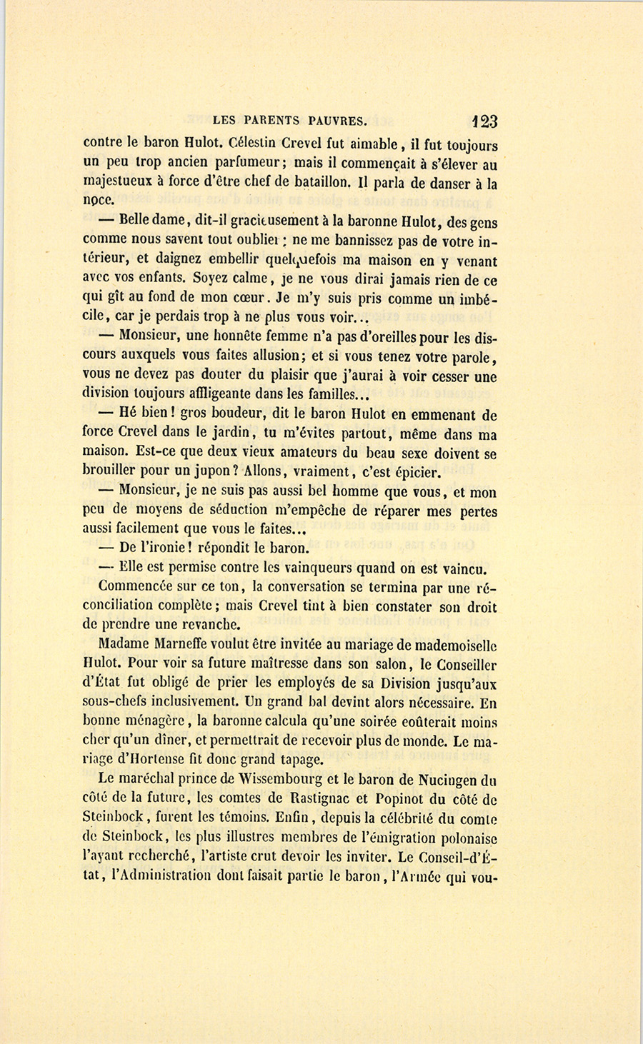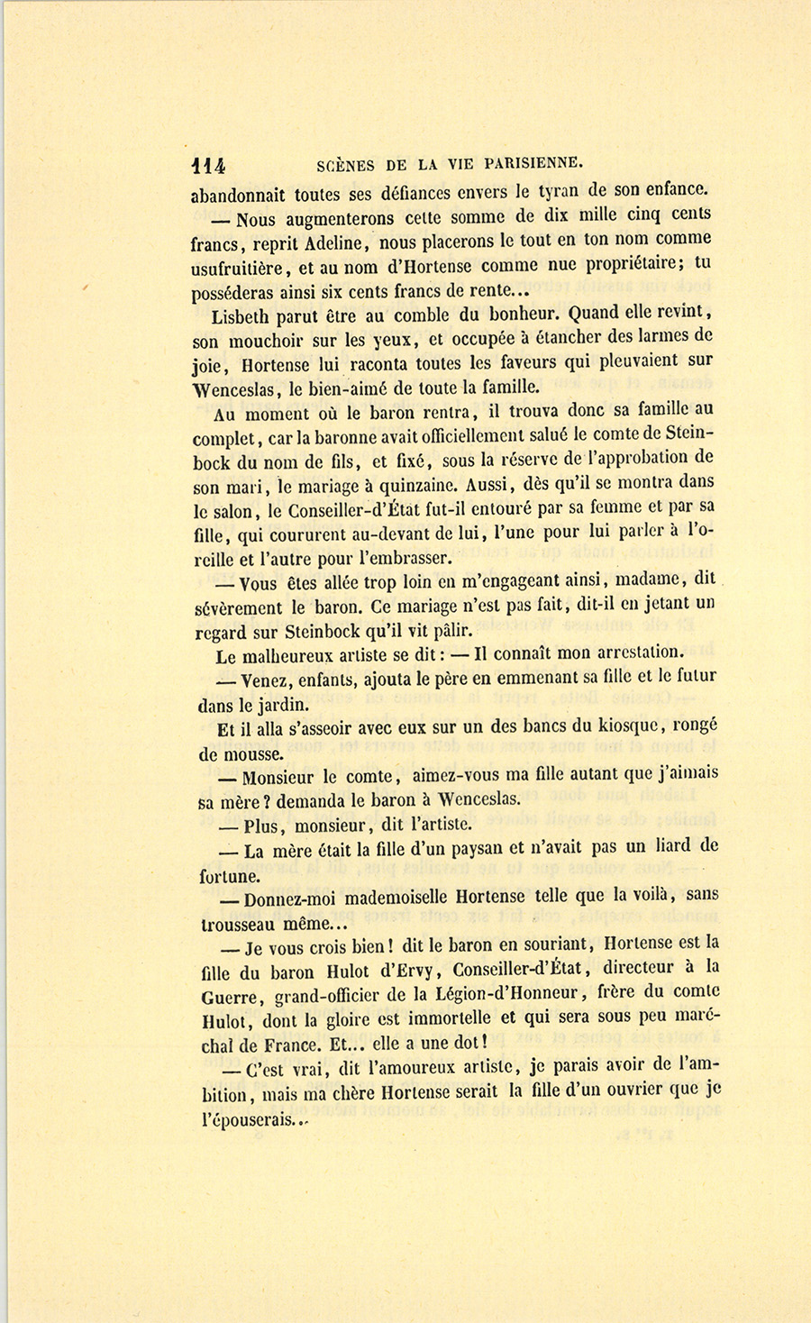 – Ah ! nous y voici, madame. Je suis un épicier, un boutiquier, un ancien débitant de pâte d’amande, d’eau de Portugal, d’huile céphalique, on doit me trouver bien honoré d’avoir marié ma fille unique au fils de monsieur le baron Hulot d’Ervy, ma fille sera baronne. C’est Régence, c’est Louis XV, Œil-de-Bœuf ! c’est très-bien… J’aime Célestine comme on aime une fille unique, je l’aime tant que, pour ne lui donner ni frère ni sœur, j’ai accepté tous les inconvénients du veuvage à Paris (et dans la force de l’âge, {p. 8} madame !), mais sachez bien que, malgré cet amour insensé pour ma fille, je n’entamerai pas ma fortune pour votre fils dont les dépenses ne me paraissent pas claires, à moi, ancien négociant…