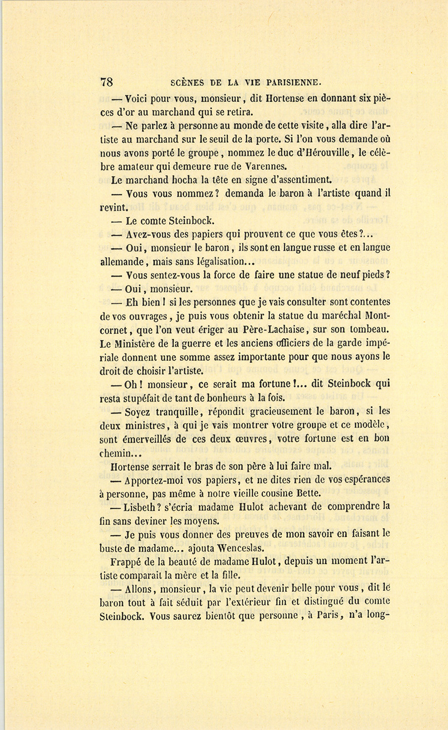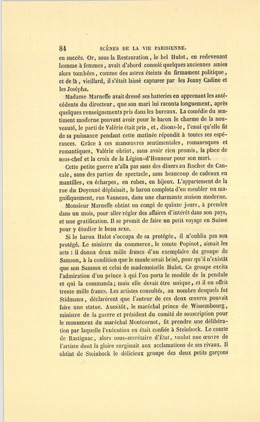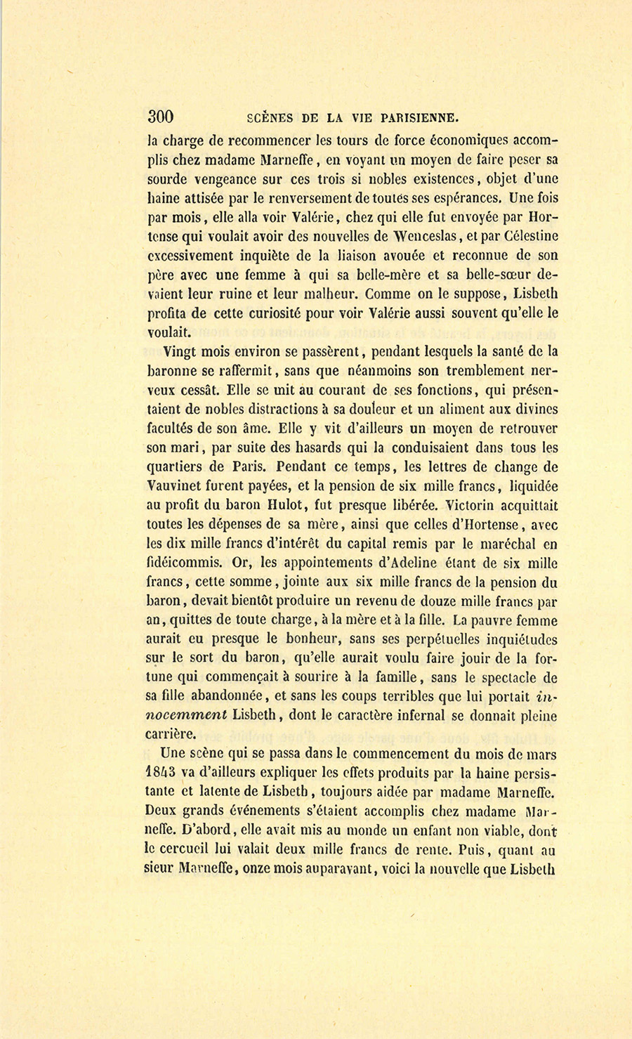 – Ah ! nous y voici, madame. Je suis un épicier, un boutiquier, un ancien débitant de pâte d’amande, d’eau de Portugal, d’huile céphalique, on doit me trouver bien honoré d’avoir marié ma fille unique au fils de monsieur le baron Hulot d’Ervy, ma fille sera baronne. C’est Régence, c’est Louis XV, Œil-de-Bœuf ! c’est très-bien… J’aime Célestine comme on aime une fille unique, je l’aime tant que, pour ne lui donner ni frère ni sœur, j’ai accepté tous les inconvénients du veuvage à Paris (et dans la force de l’âge, {p. 8} madame !), mais sachez bien que, malgré cet amour insensé pour ma fille, je n’entamerai pas ma fortune pour votre fils dont les dépenses ne me paraissent pas claires, à moi, ancien négociant…
