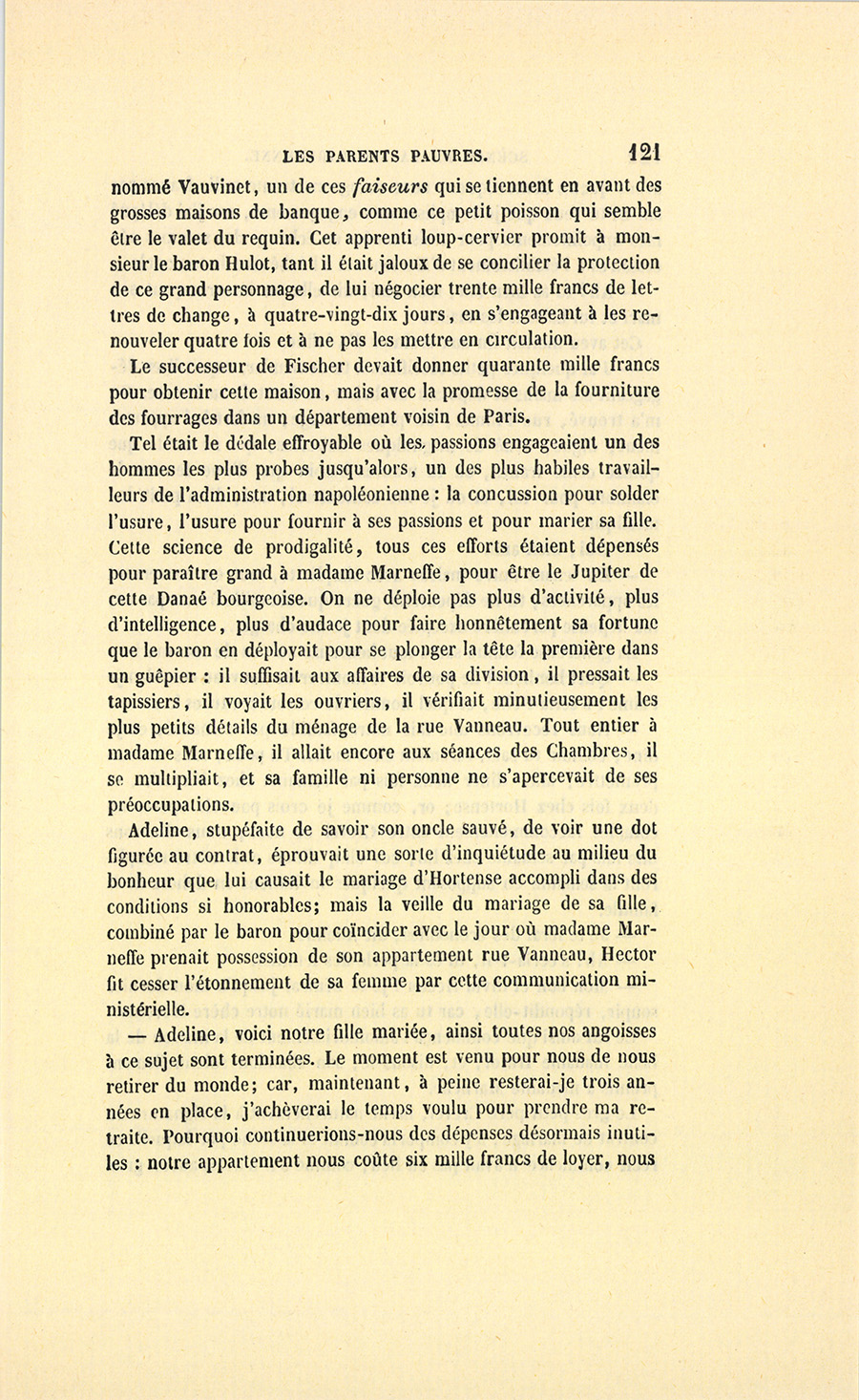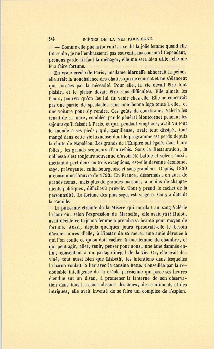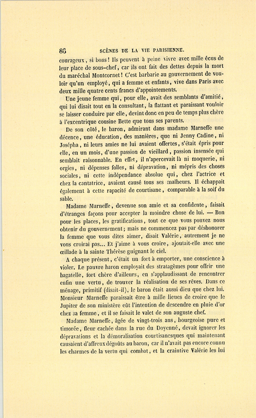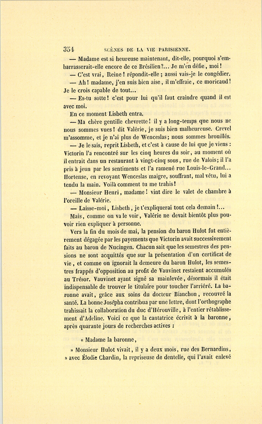 – Ah ! nous y voici, madame. Je suis un épicier, un boutiquier, un ancien débitant de pâte d’amande, d’eau de Portugal, d’huile céphalique, on doit me trouver bien honoré d’avoir marié ma fille unique au fils de monsieur le baron Hulot d’Ervy, ma fille sera baronne. C’est Régence, c’est Louis XV, Œil-de-Bœuf ! c’est très-bien… J’aime Célestine comme on aime une fille unique, je l’aime tant que, pour ne lui donner ni frère ni sœur, j’ai accepté tous les inconvénients du veuvage à Paris (et dans la force de l’âge, {p. 8} madame !), mais sachez bien que, malgré cet amour insensé pour ma fille, je n’entamerai pas ma fortune pour votre fils dont les dépenses ne me paraissent pas claires, à moi, ancien négociant…