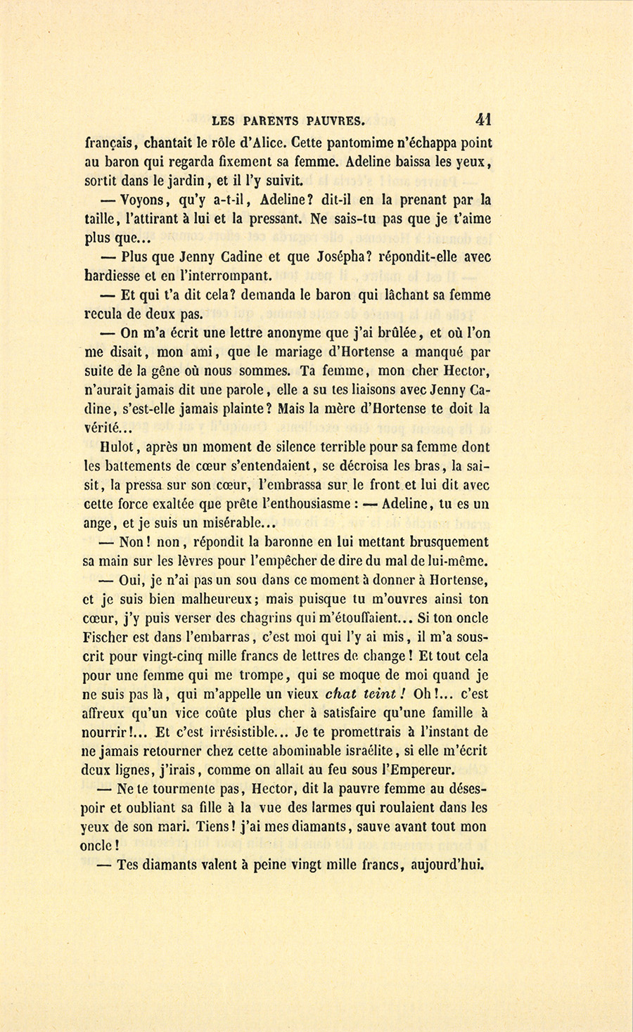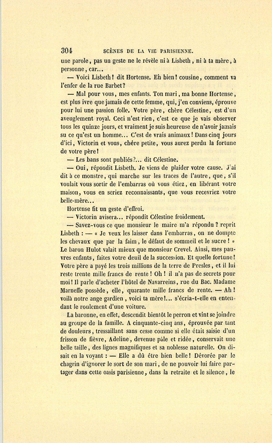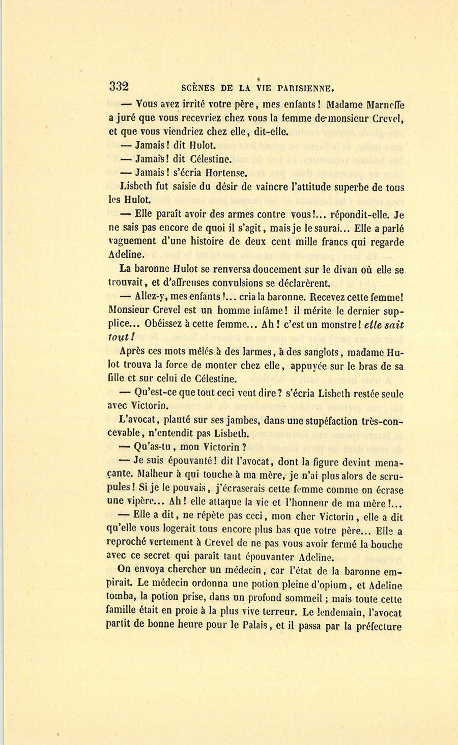– Madame, répondit l’ancien parfumeur, j’ai agi en honnête homme. On est venu me demander si les deux cent mille francs de dot attribués à mademoiselle Hortense seraient payés. J’ai répondu textuellement ceci : « – Je ne le garantirais pas. Mon gendre, à qui la famille Hulot a constitué cette somme en dot, avait des dettes, et je crois que si monsieur Hulot d’Ervy mourait demain, sa veuve serait sans pain. » Voilà, belle dame.