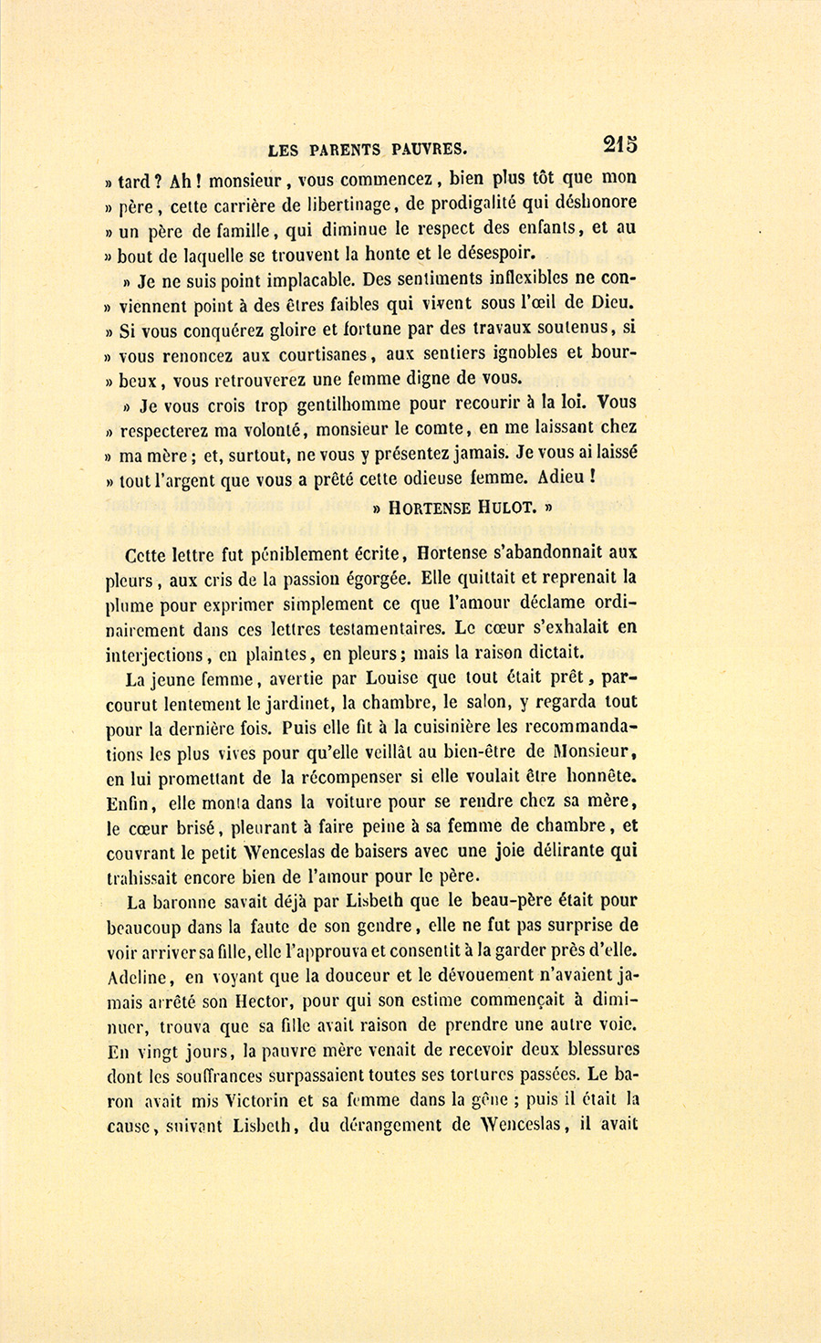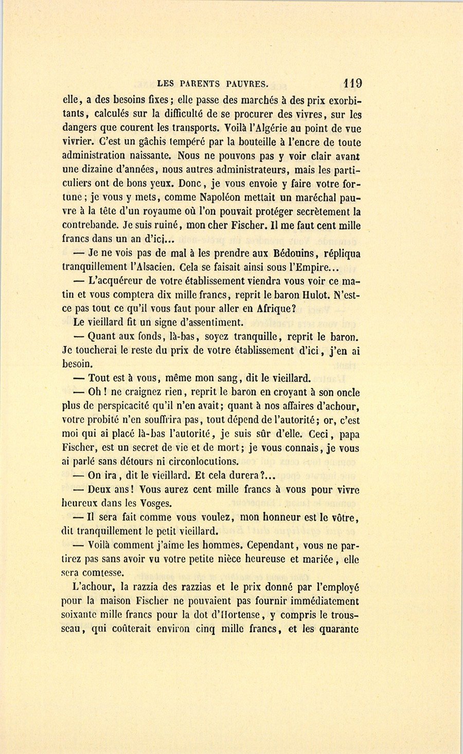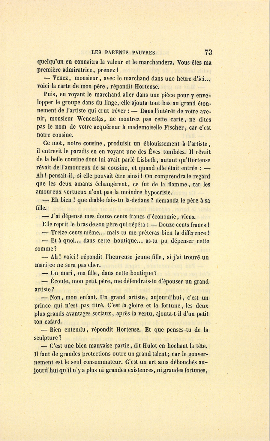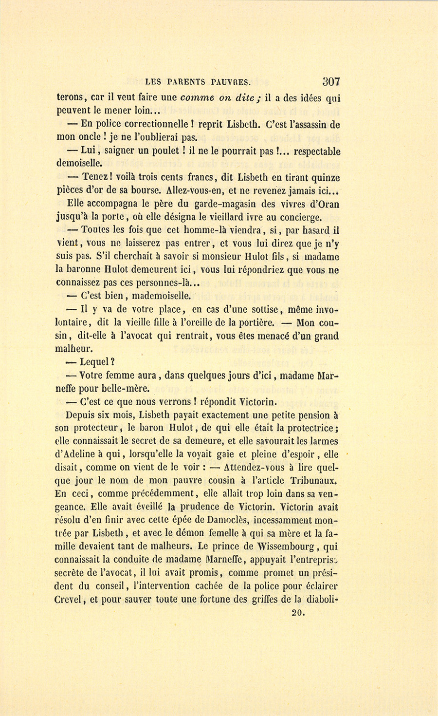 – Madame, répondit l’ancien parfumeur, j’ai agi en honnête homme. On est venu me demander si les deux cent mille francs de dot attribués à mademoiselle Hortense seraient payés. J’ai répondu textuellement ceci : « – Je ne le garantirais pas. Mon gendre, à qui la famille Hulot a constitué cette somme en dot, avait des dettes, et je crois que si monsieur Hulot d’Ervy mourait demain, sa veuve serait sans pain. » Voilà, belle dame.