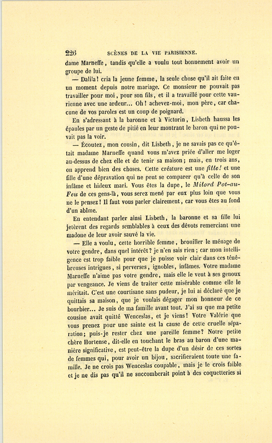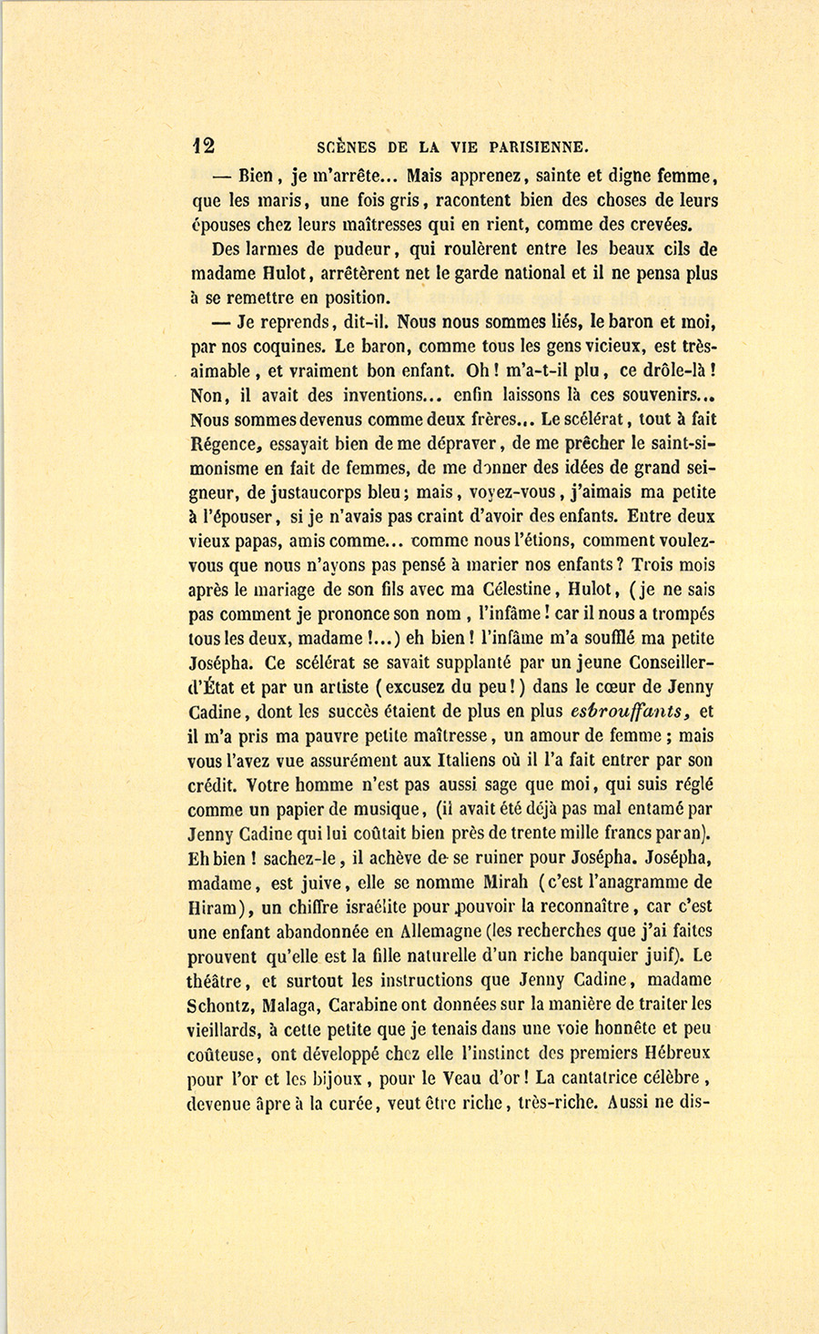 – Je reprends, dit-il. Nous nous sommes liés, le baron et moi, par nos coquines. Le baron, comme tous les gens vicieux, est très-aimable, et vraiment bon enfant. Oh ! m’a-t-il plu, ce drôle-là ! Non, il avait des inventions… enfin laissons là ces souvenirs… Nous sommes devenus comme deux frères… Le scélérat, tout à fait Régence, essayait bien de me dépraver, de me prêcher le saint-simonisme en fait de femmes, de me donner des idées de grand seigneur, de justaucorps bleu ; mais, voyez-vous, j’aimais ma petite à l’épouser, si je n’avais pas craint d’avoir des enfants. Entre deux vieux papas, amis comme… comme nous l’étions, comment voulez-vous que nous n’ayons pas pensé à marier nos enfants ? Trois mois après le mariage de son fils avec ma Célestine, Hulot, (je ne sais pas comment je prononce son nom, l’infâme ! car il nous a trompés tous les deux, madame !…) eh bien ! l’infâme m’a soufflé ma petite Josépha. Ce scélérat se savait supplanté par un jeune Conseiller-d’État et par un artiste (excusez du peu !) dans le cœur de Jenny Cadine, dont les succès étaient de plus en plus esbrouffants, et il m’a pris ma pauvre petite maîtresse, un amour de femme ; mais vous l’avez vue assurément aux Italiens où il l’a fait entrer par son crédit. Votre homme n’est pas aussi sage que moi, qui suis réglé comme un papier de musique, (il avait été déjà pas mal entamé par Jenny Cadine qui lui coûtait bien près de trente mille francs par an). Eh bien ! sachez-le, il achève de se ruiner pour Josépha. Josépha, madame, est juive, elle se nomme Mirah (c’est l’anagramme de Hiram), un chiffre israélite pour pouvoir la reconnaître, car c’est une enfant abandonnée en Allemagne (les recherches que j’ai faites prouvent qu’elle est la fille naturelle d’un riche banquier juif). Le théâtre, et surtout les instructions que Jenny Cadine, madame Schontz, Malaga, Carabine ont données sur la manière de traiter les vieillards, à cette petite que je tenais dans une voie honnête et peu coûteuse, ont développé chez elle l’instinct des premiers Hébreux pour l’or et les bijoux, pour le Veau d’or ! La cantatrice célèbre, devenue âpre à la curée, veut être riche, très-riche. Aussi ne {p. 13} dissipe-t-elle rien de ce qu’on dissipe pour elle. Elle s’est essayée sur le sieur Hulot, qu’elle a plumé net, oh ! plumé, ce qui s’appelle rasé ! Ce malheureux, après avoir lutté contre un des Keller et le marquis d’Esgrignon, fous tous deux de Josépha, sans compter les idolâtres inconnus, va se la voir enlever par ce duc si puissamment riche qui protége les arts. Comment l’appelez-vous ?… un nain ?… ah ! le duc d’Hérouville. Ce grand seigneur a la prétention d’avoir à lui seul Josépha, tout le monde courtisanesque en parle, et le baron n’en sait rien ; car il en est au treizième arrondissement comme dans tous les autres : l’amant est, comme les maris, le dernier instruit. Comprenez-vous mes droits, maintenant ? Votre époux, belle dame, m’a privé de mon bonheur, de la seule joie que j’ai eue depuis mon veuvage. Oui, si je n’avais pas eu le malheur de rencontrer ce vieux roquentin, je posséderais encore Josépha, car, moi, voyez-vous, je ne l’aurais jamais mise au théâtre, elle serait restée obscure, sage, et à moi. Oh ! si vous l’aviez vue, il y a huit ans : mince et nerveuse, le teint doré d’une Andalouse, comme on dit, les cheveux noirs et luisants comme du satin, un œil à longs cils bruns qui jetait des éclairs, une distinction de duchesse dans les gestes, la modestie de la pauvreté, de la grâce honnête, de la gentillesse comme une biche sauvage. Par la faute du sieur Hulot, ces charmes, cette pureté, tout est devenu piége à loup, chatière à pièces de cent sous. La petite est la reine des impures, comme on dit. Enfin elle blague, aujourd’hui, elle qui ne connaissait rien de rien, pas même ce mot-là !