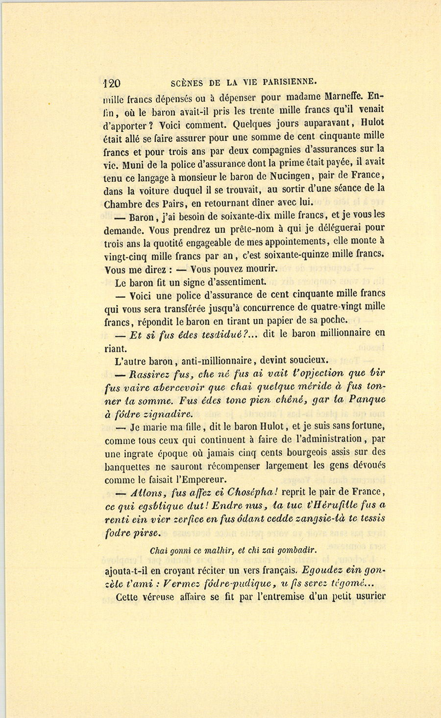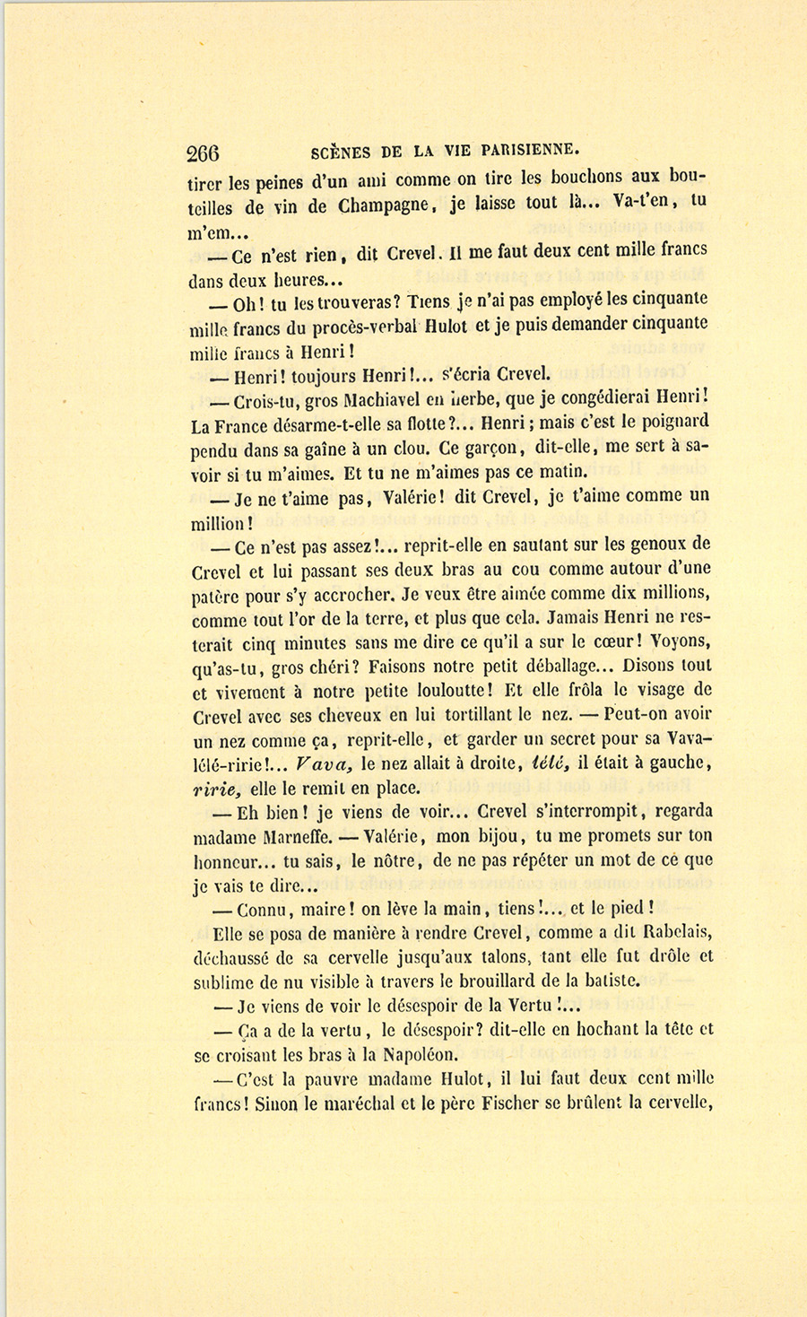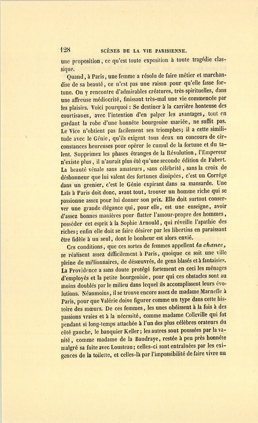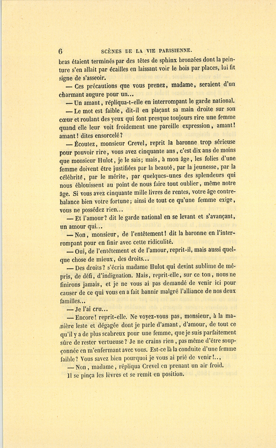 {p. 3} Dans le nombre de ces Parisiens accusés d’être si spirituels, il s’en trouve qui se croient infiniment mieux en uniforme que dans leurs habits ordinaires, et qui supposent chez les femmes des goûts assez dépravés pour imaginer qu’elles seront favorablement impressionnées à l’aspect d’un bonnet à poil et par le harnais militaire.