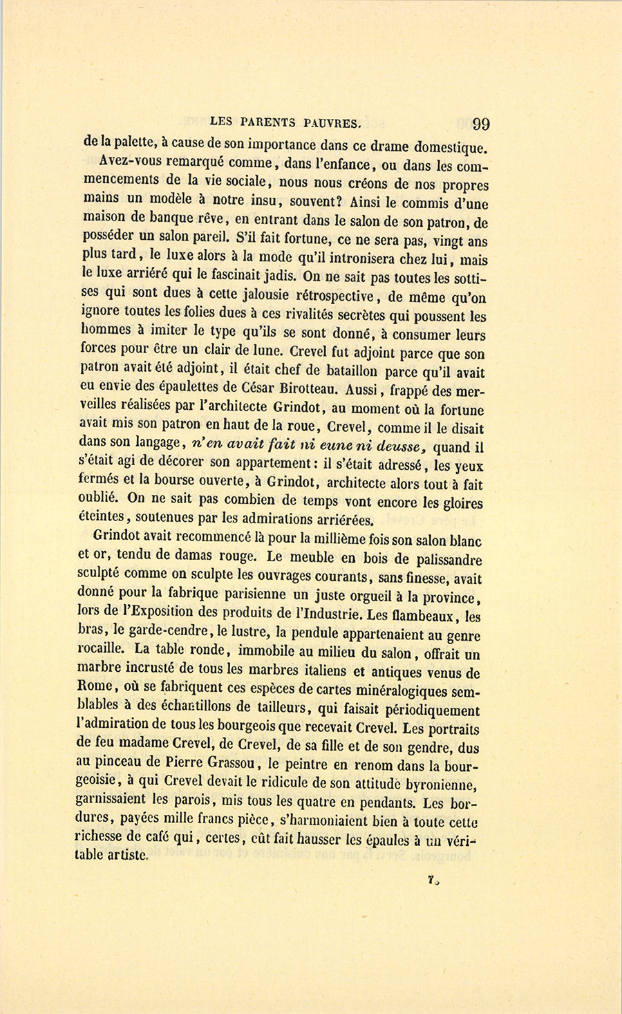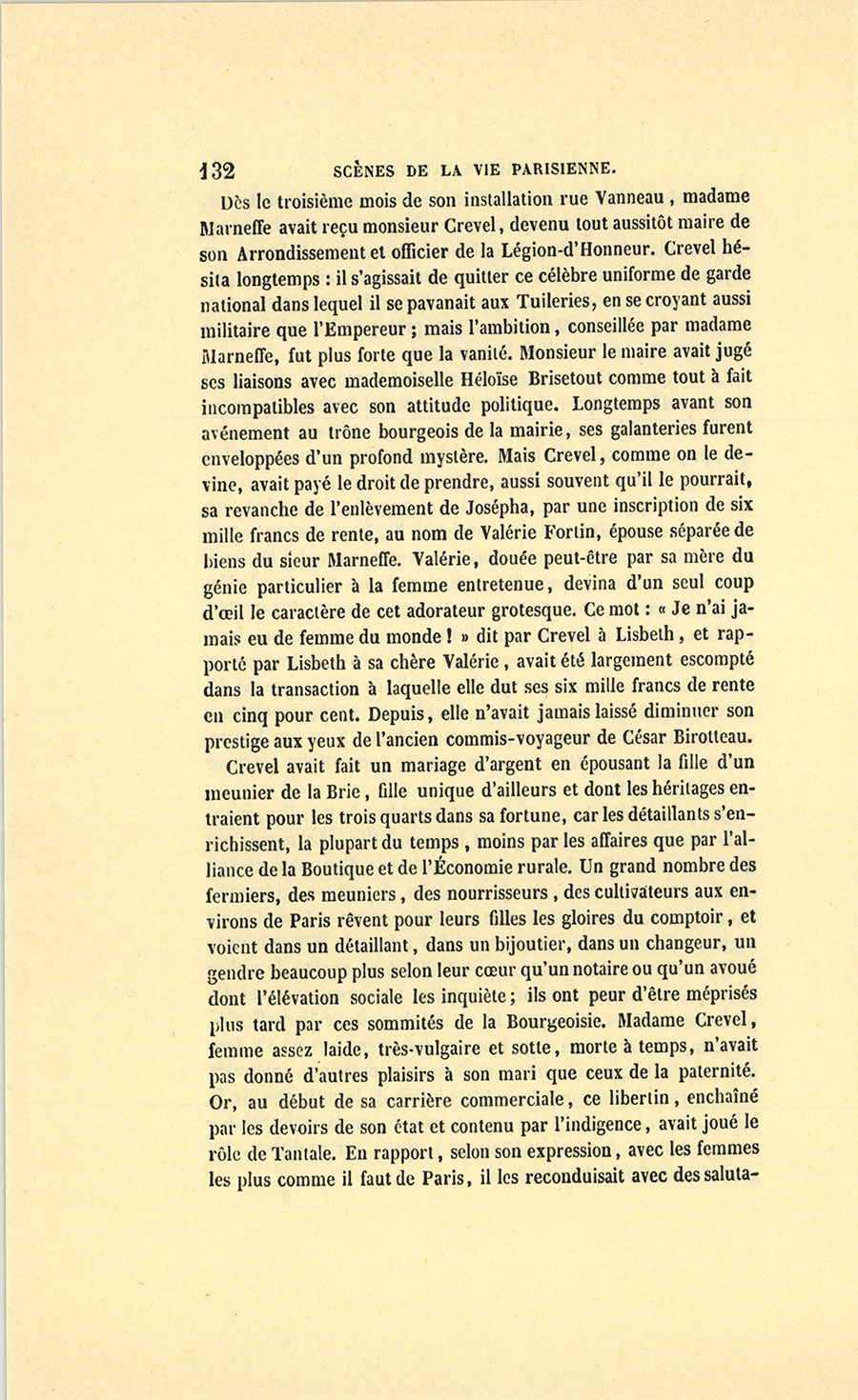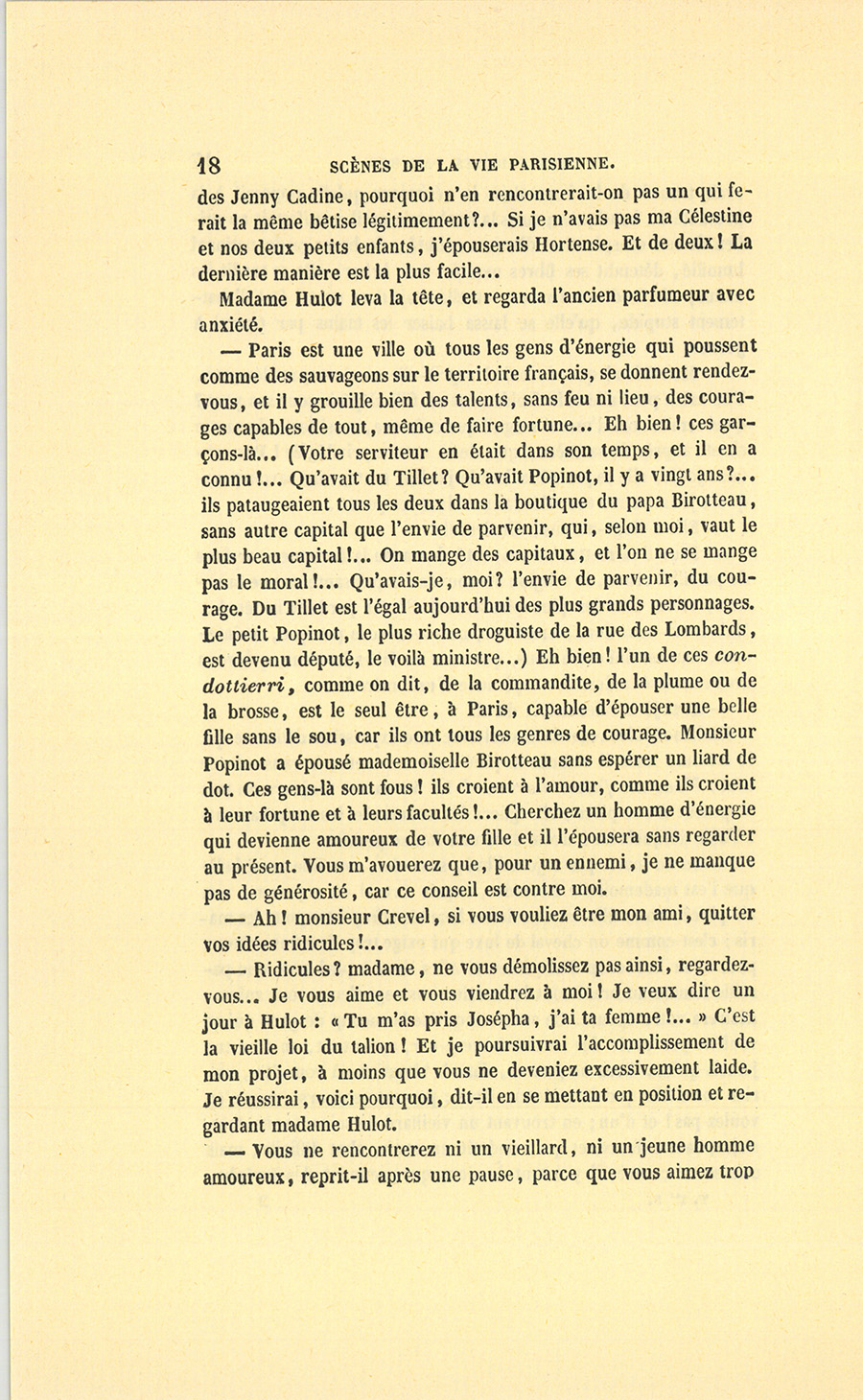 – Mon ami, madame !… dit le parfumeur retiré ; car moi, Célestin Crevel, ancien premier commis du père César Birotteau, j’ai acheté le fonds dudit Birotteau, beau-père de Popinot, lequel Popinot était simple commis dans cet établissement, et c’est lui qui me le rappelle, car il n’est pas fier (c’est une justice à lui rendre) avec les gens bien posés et qui possèdent soixante mille francs de rente.