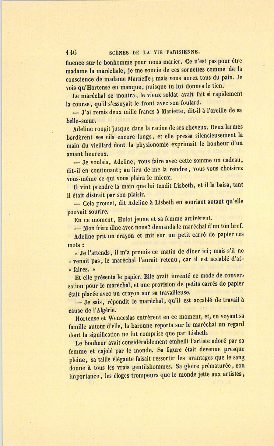 – Si vous voulez me suivre par ici, monsieur, nous serons beaucoup mieux que dans ce salon pour causer d’affaires, dit madame Hulot en désignant une pièce voisine qui, dans l’ordonnance de l’appartement, formait un salon de jeu.