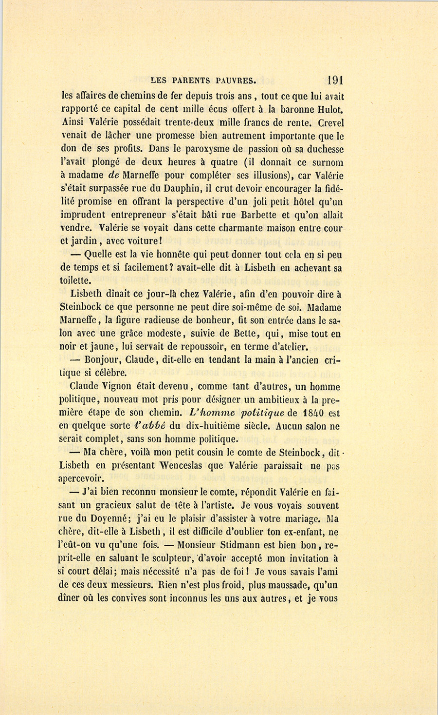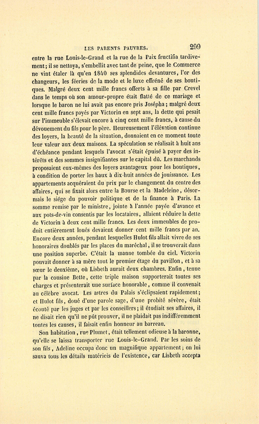 – Un gendre que je suis obligé de soutenir, reprit Crevel, ce qui me semble pis, madame. Des cinq cent mille francs constitués en dot à ma fille, deux cents ont passé, Dieu sait à quoi !… à payer les dettes de monsieur votre fils, à meubler mirobolamment sa maison, une maison de cinq cent mille francs qui rapporte à peine quinze mille francs, puisqu’il en occupe la plus belle partie, et sur laquelle il reçoit deux cent soixante mille francs… Le produit couvre à peine les intérêts de la dette. Cette année, je donne à ma fille une vingtaine de mille francs pour qu’elle puisse nouer les deux bouts. Et mon gendre, qui gagnait trente mille francs au Palais, disait-on, va négliger le Palais pour la Chambre…