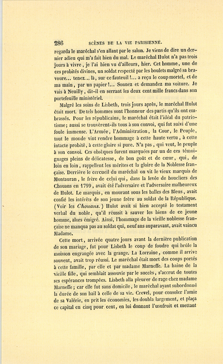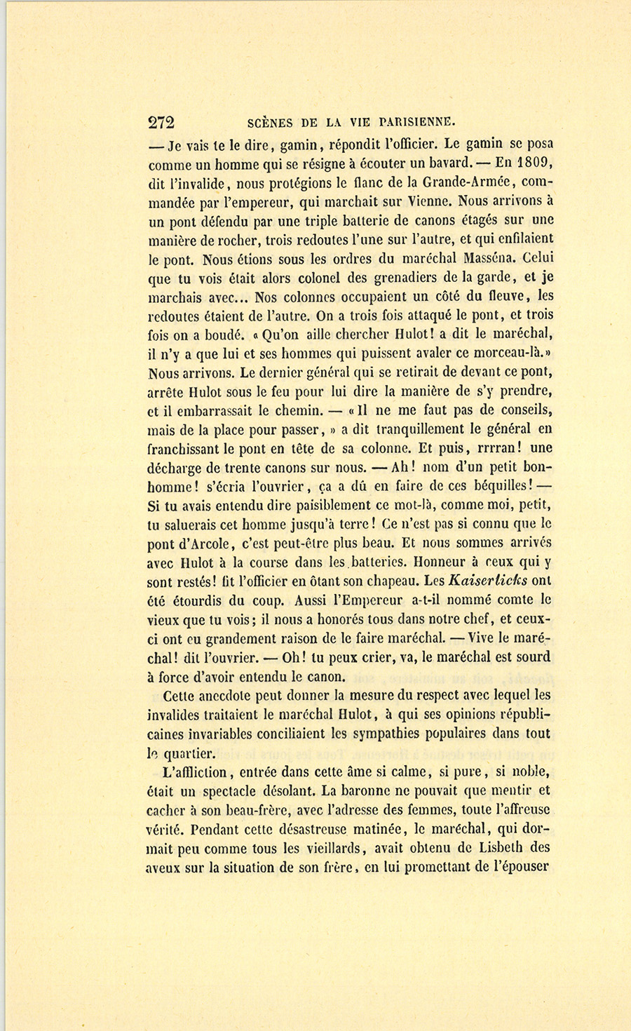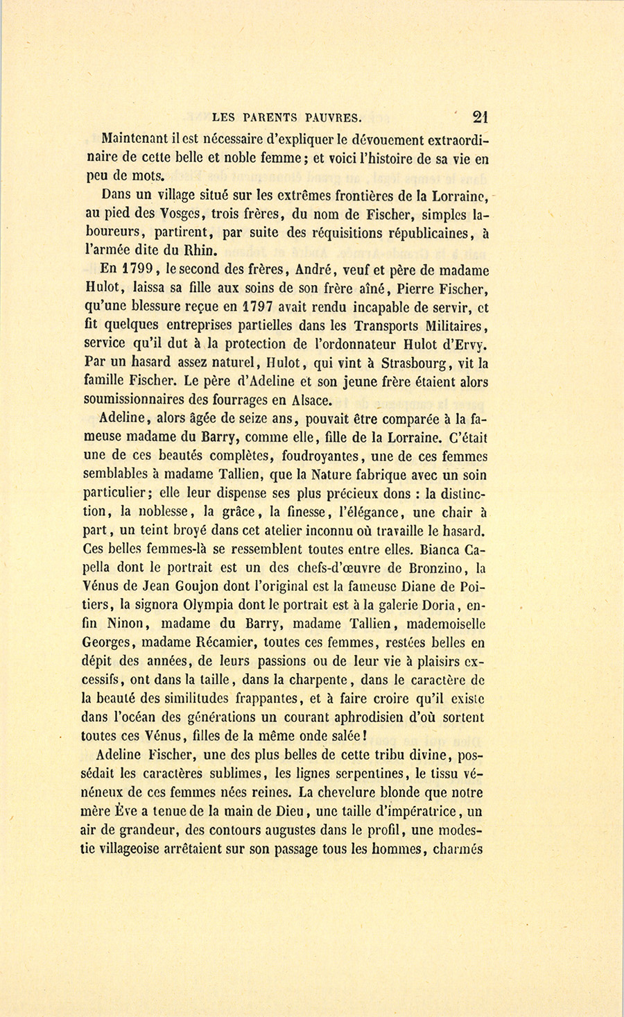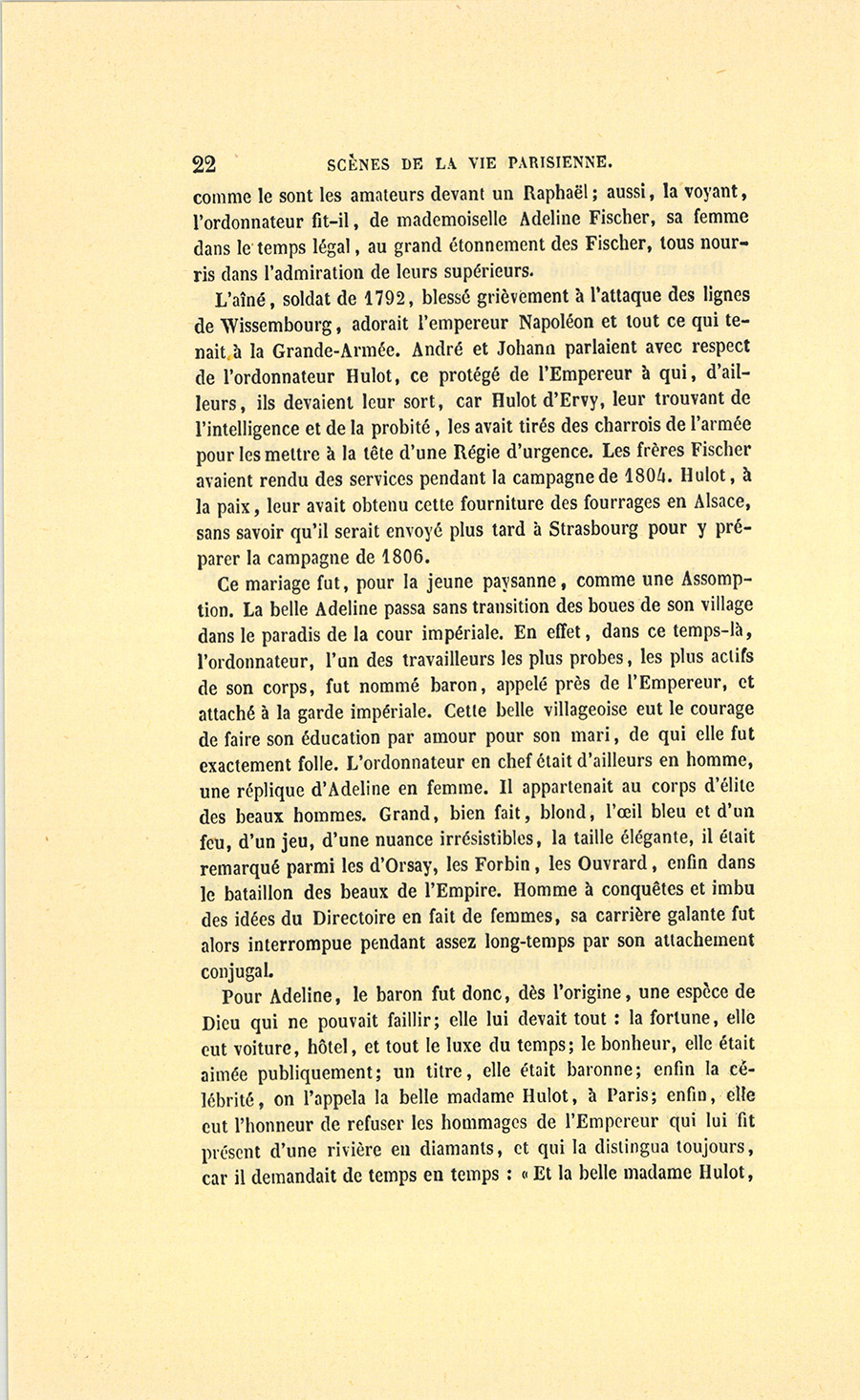 Ce baron Hulot s’était nommé lui-même d’Ervy, lieu de sa naissance, pour se distinguer de son frère, le célèbre général Hulot, colonel des grenadiers de la garde impériale, que l’Empereur avait créé comte de Forzheim, après la campagne de 1809. Le frère {p. 4} aîné, le comte, chargé de prendre soin de son frère cadet, l’avait, par prudence paternelle, placé dans l’administration militaire où, grâce à leurs doubles services, le baron obtint et mérita la faveur de Napoléon. Dès 1807, le baron Hulot était intendant-général des armées en Espagne.