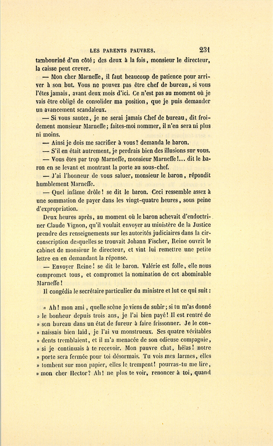 – Savez-vous, madame, comment le sieur Hulot et moi, nous nous sommes connus ?… chez nos maîtresses, madame.