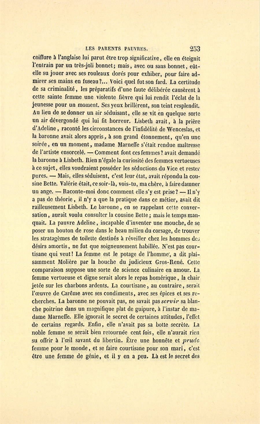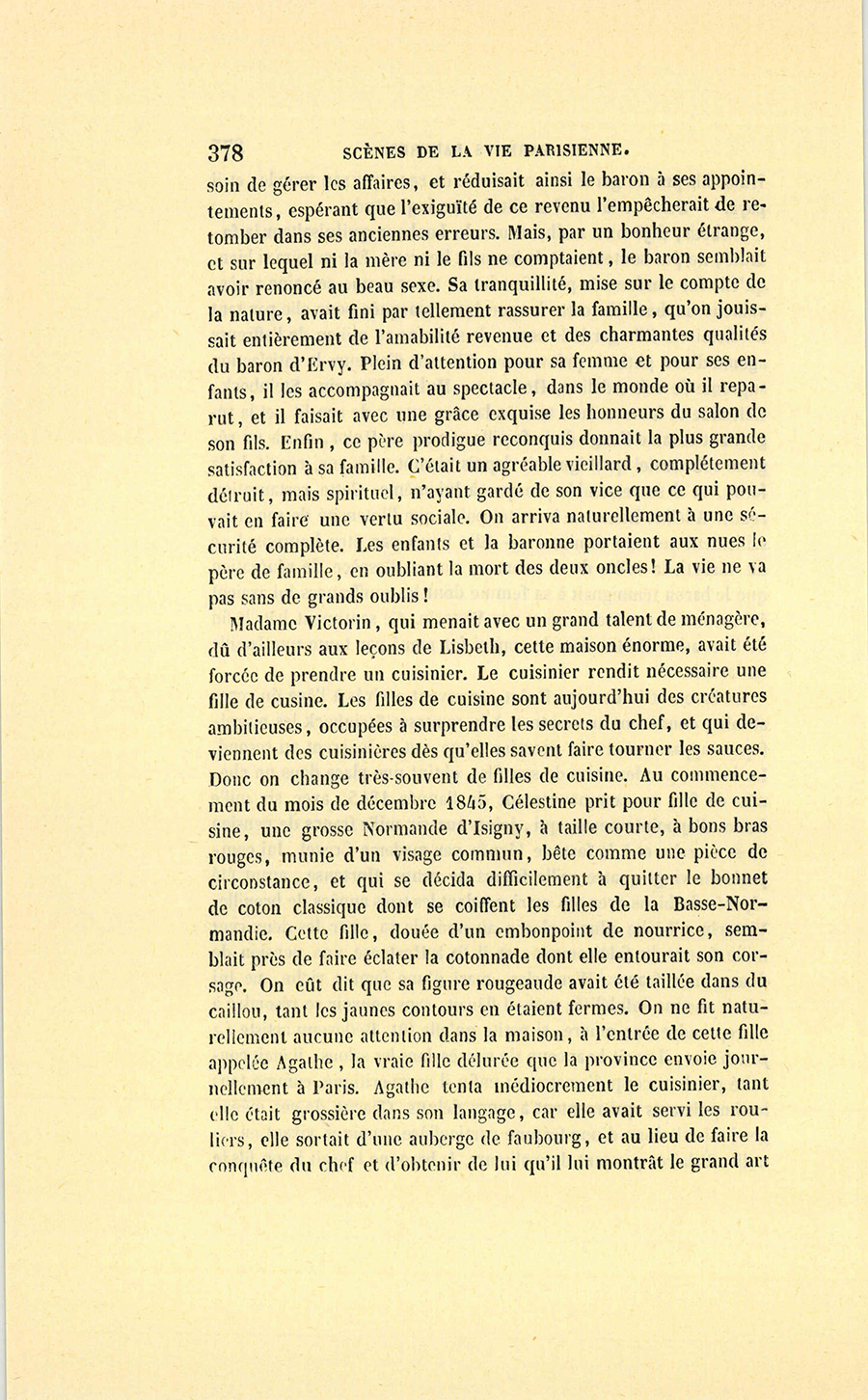Madame Victorin, qui menait avec un grand talent de ménagère, dû d’ailleurs aux leçons de Lisbeth, cette maison énorme, avait été forcée de prendre un cuisinier. Le cuisinier rendit nécessaire une fille de cuisine. Les filles de cuisine sont aujourd’hui des créatures ambitieuses, occupées à surprendre les secrets du chef, et qui deviennent des cuisinières dès qu’elles savent faire tourner les sauces. Donc on change très-souvent de filles de cuisine. Au commencement du mois de décembre 1845, Célestine prit pour fille de cuisine, une grosse Normande d’Isigny, à taille courte, à bons bras rouges, munie d’un visage commun, bête comme une pièce de circonstance, et qui se décida difficilement à quitter le bonnet de coton classique dont se coiffent les filles de la Basse-Normandie. Cette fille, douée d’un embonpoint de nourrice, semblait près de faire éclater la cotonnade dont elle entourait son corsage. On eût dit que sa figure rougeaude avait été taillée dans du caillou, tant les jaunes contours en étaient fermes. On ne fit naturellement aucune attention dans la maison, à l’entrée de cette fille appelée Agathe, la vraie fille délurée que la province envoie journellement à Paris. Agathe tenta médiocrement le cuisinier, tant elle était grossière dans son langage, car elle avait servi les rouliers, elle sortait d’une auberge de faubourg, et au lieu de faire la conquête du chef et d’obtenir de lui qu’il lui montrât le grand art {p. 379} de la cuisine, elle fut l’objet de son mépris. Le cuisinier courtisait Louise, la femme de chambre de la comtesse Steinbock. Aussi la Normande, se voyant maltraitée, se plaignit-elle de son sort ; elle était toujours envoyée dehors, sous un prétexte quelconque, quand le chef finissait un plat ou parachevait une sauce. – Décidément, je n’ai pas de chance, disait-elle, j’irai dans une autre maison. Néanmoins, elle resta, quoiqu’elle eût demandé déjà deux fois à sortir.