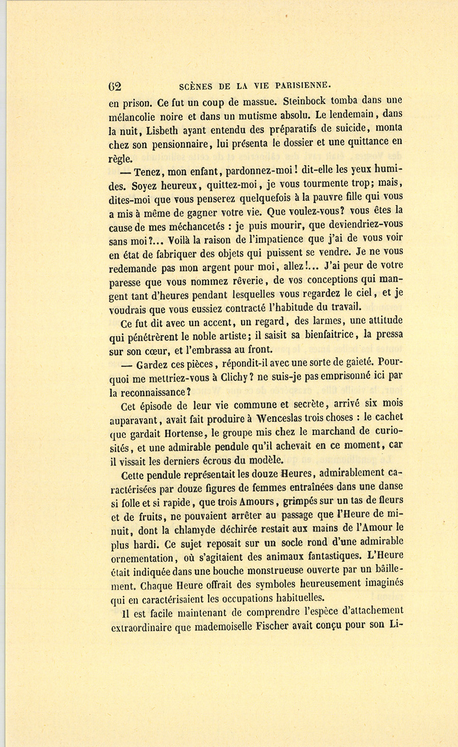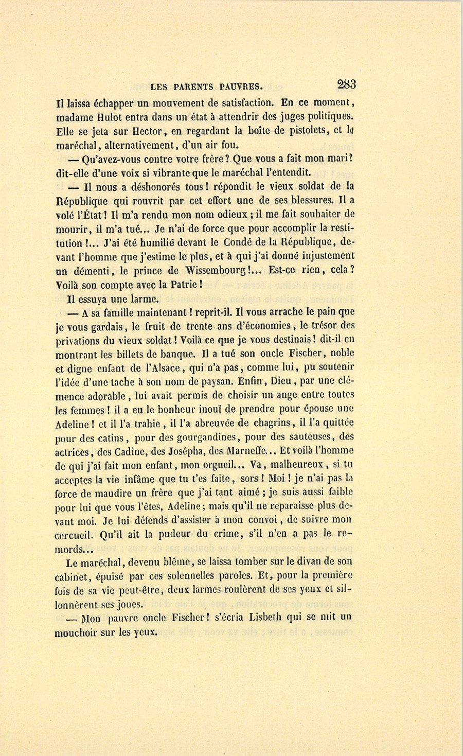 En ce moment, l’ancien parfumeur s’essuya les yeux où roulaient quelques larmes. La sincérité de cette douleur agit sur madame Hulot qui sortit de la rêverie où elle était tombée.