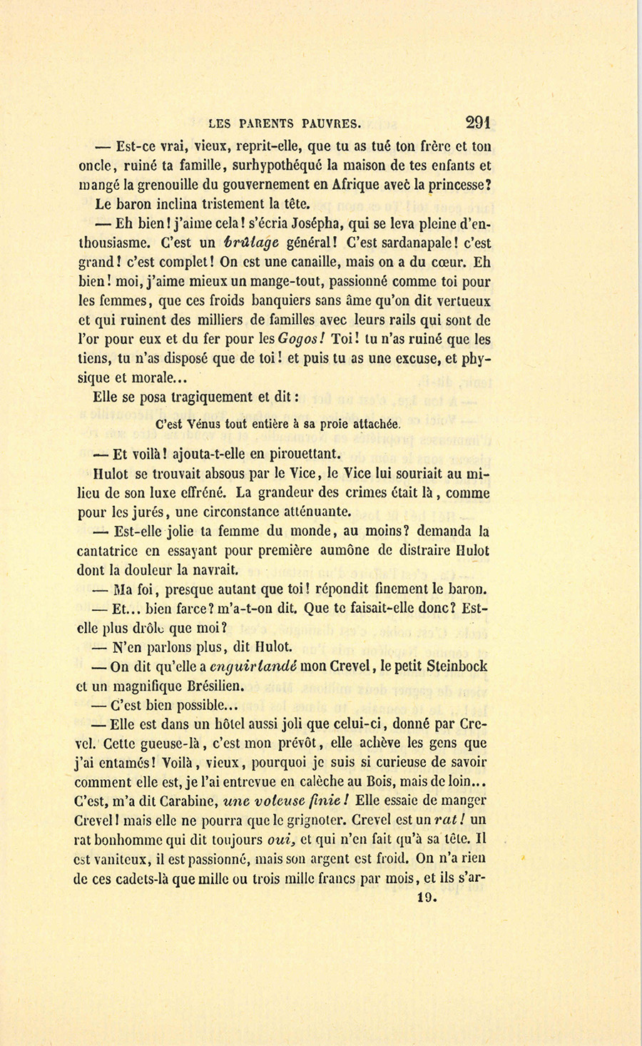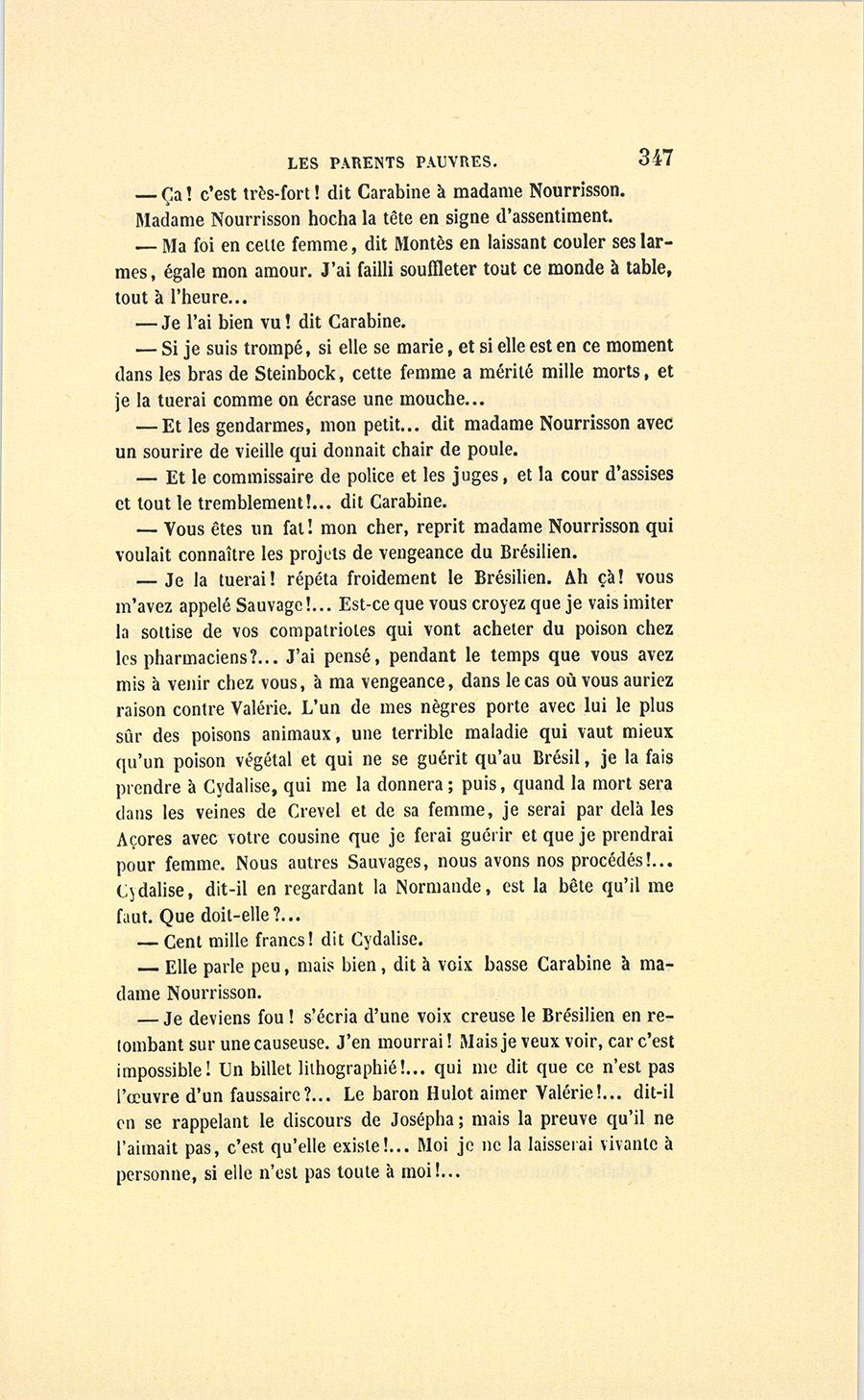– Ah ! je ne connais plus rien ! reprit Crevel. Le jour où Josépha m’a été prise, j’étais comme une tigresse à qui l’on a enlevé ses petits… Enfin, j’étais comme je vous vois en ce moment. Votre fille ! c’est, pour moi, le moyen de vous obtenir. Oui, j’ai fait manquer le mariage de votre fille !… et vous ne la marierez point sans mon secours ! Quelque belle que soit mademoiselle Hortense, il lui faut une dot…