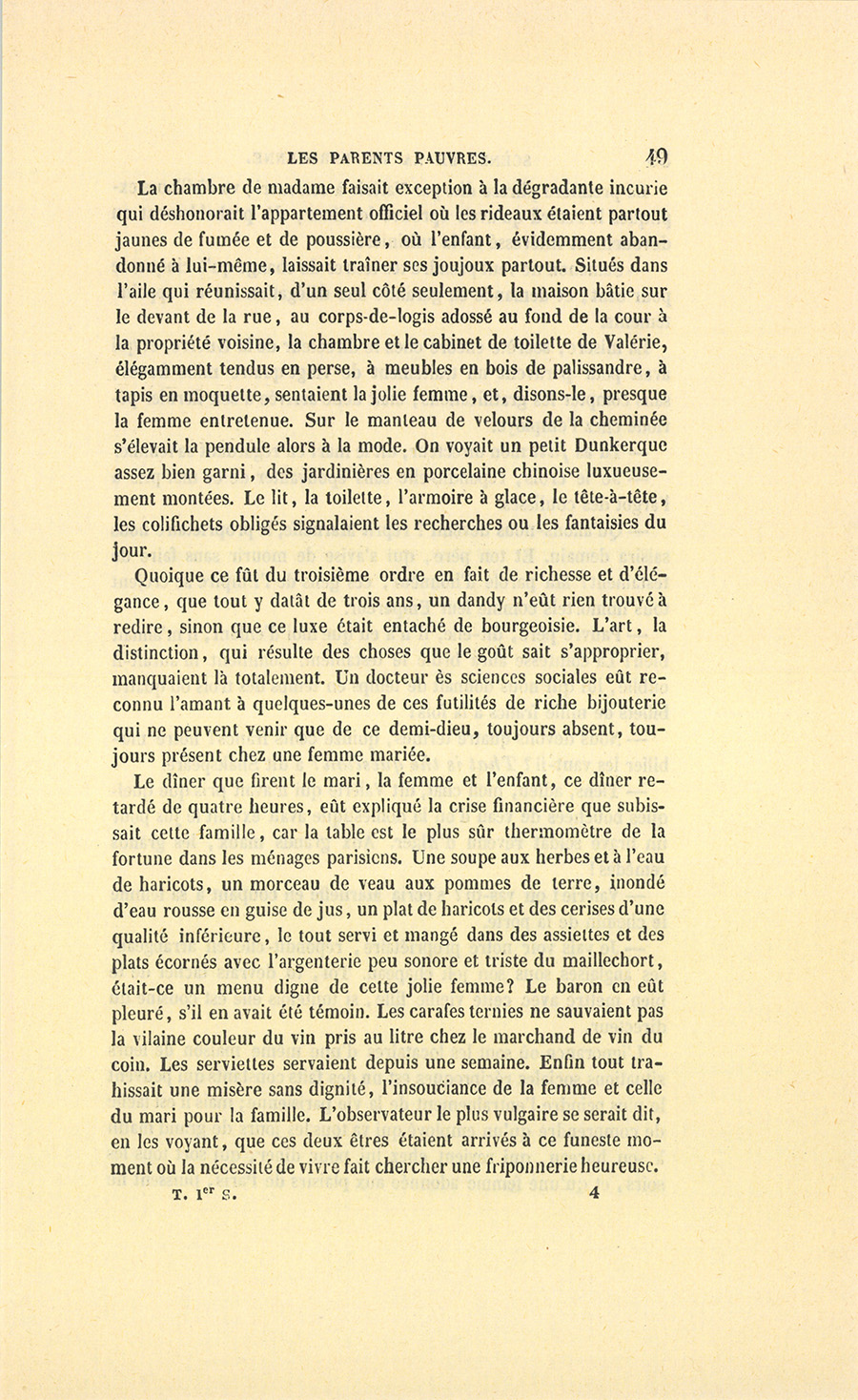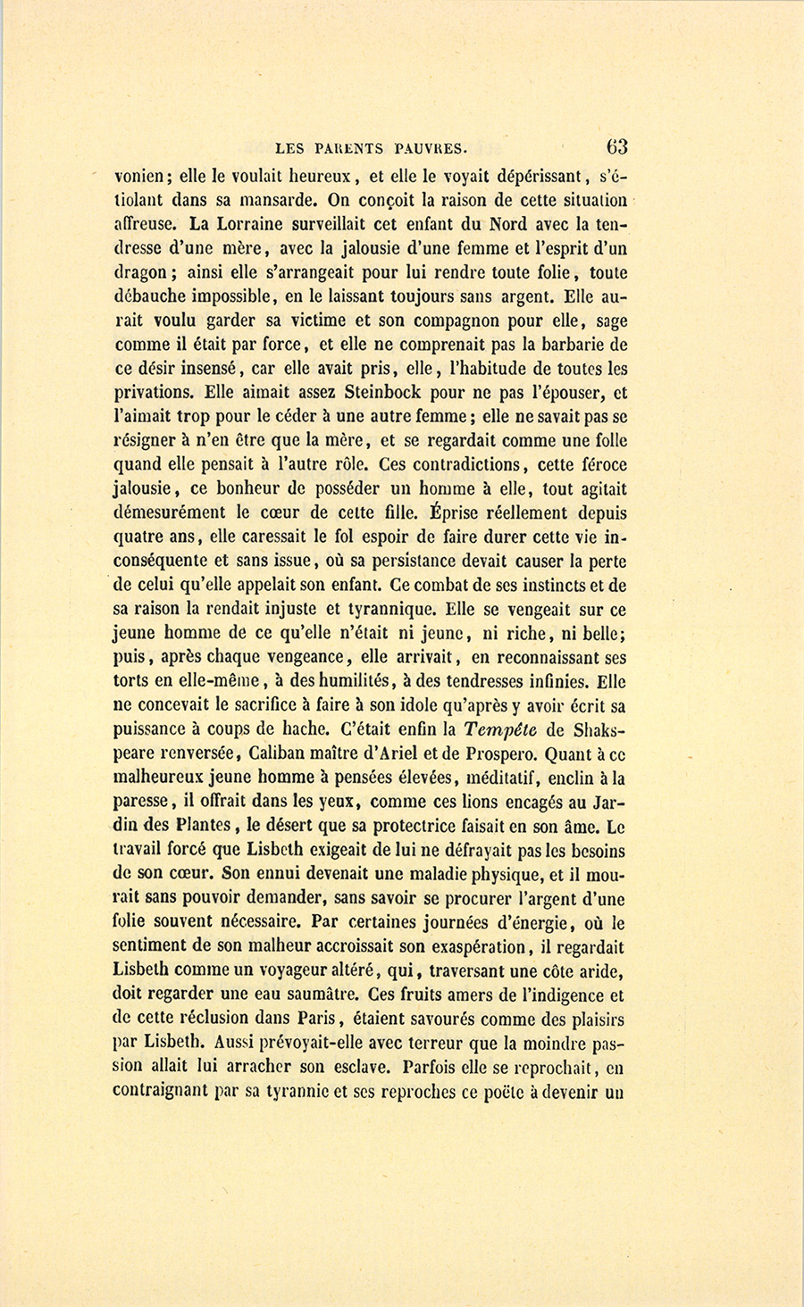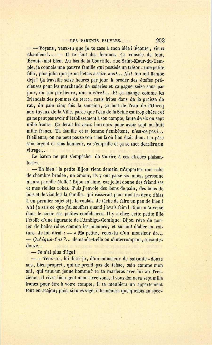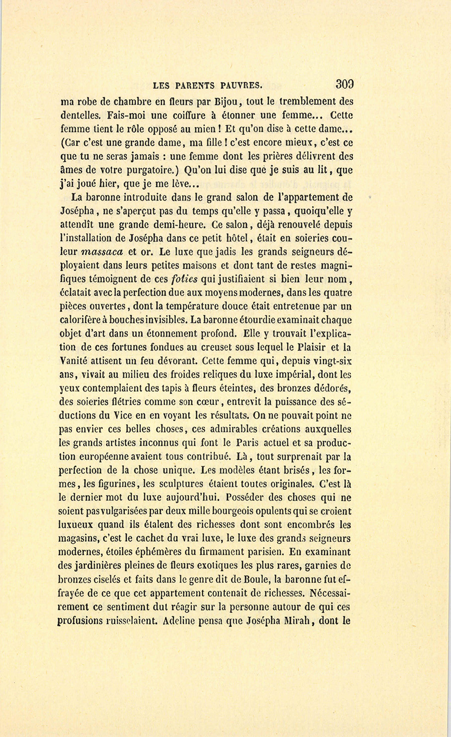 {p. 15} – S’il les avait, il les donnerait à celle qui remplacera Josépha ! dit-il en forçant son medium. Dans la voie où il est, s’arrête-t-on ? Il aime d’abord trop les femmes ! (Il y a en tout un juste milieu, comme a dit notre Roi.) Et puis la vanité s’en mêle ! C’est un bel homme ! Il vous mettra tous sur la paille pour son plaisir. Vous êtes déjà d’ailleurs sur le chemin de l’hôpital. Tenez, depuis que je n’ai mis les pieds chez vous, vous n’avez pas pu renouveler le meuble de votre salon. Le mot gêne est vomi par toutes les lézardes de ces étoffes. Quel est le gendre qui ne sortira pas épouvanté des preuves mal déguisées de la plus horrible des misères, celle des gens comme il faut ? J’ai été boutiquier, je m’y connais. Il n’y a rien de tel que le coup d’œil du marchand de Paris pour savoir découvrir la richesse réelle et la richesse apparente… Vous êtes sans le sou, dit-il à voix basse. Cela se voit en tout, même sur l’habit de votre domestique. Voulez-vous que je vous révèle d’affreux mystères qui vous sont cachés ?…