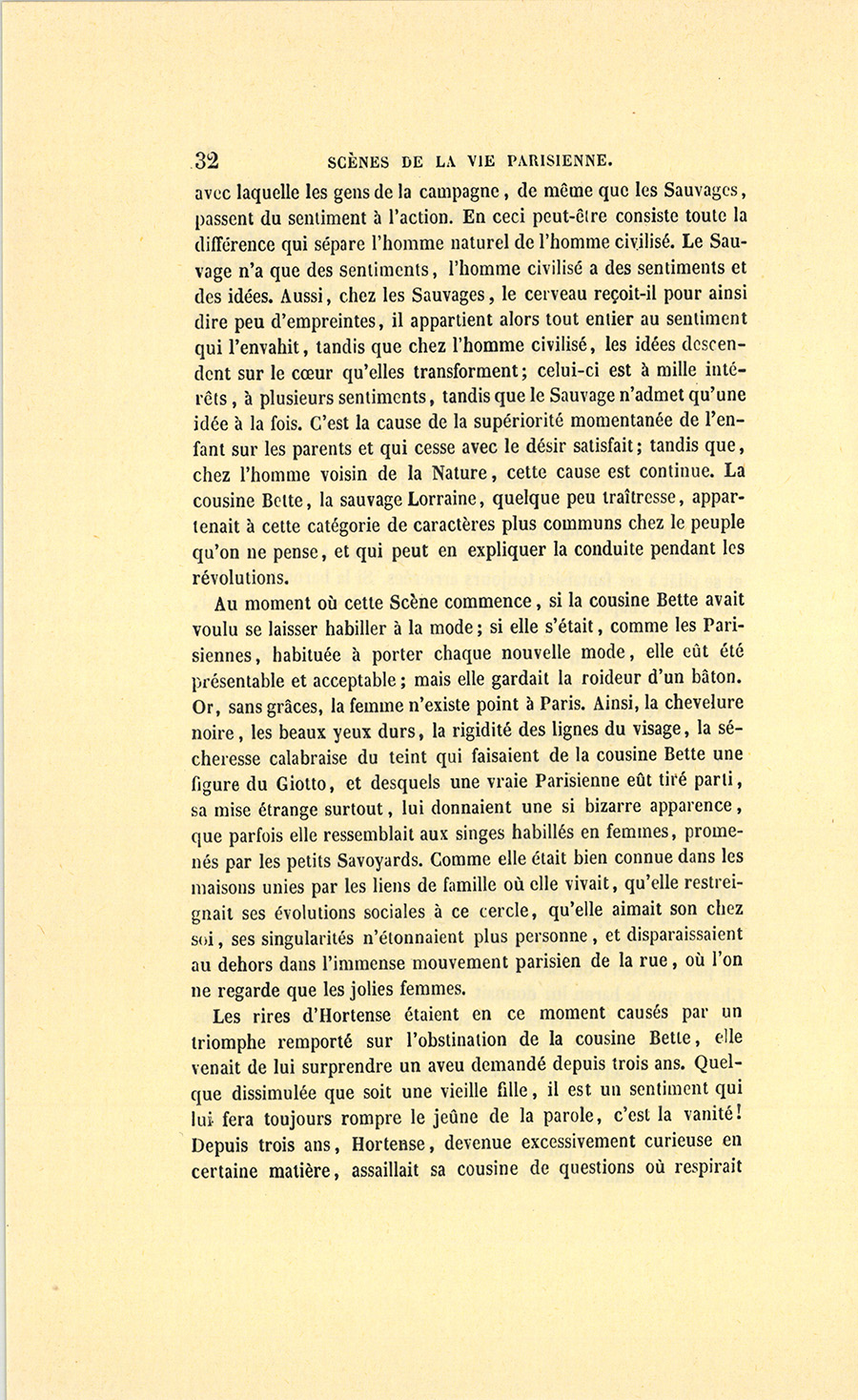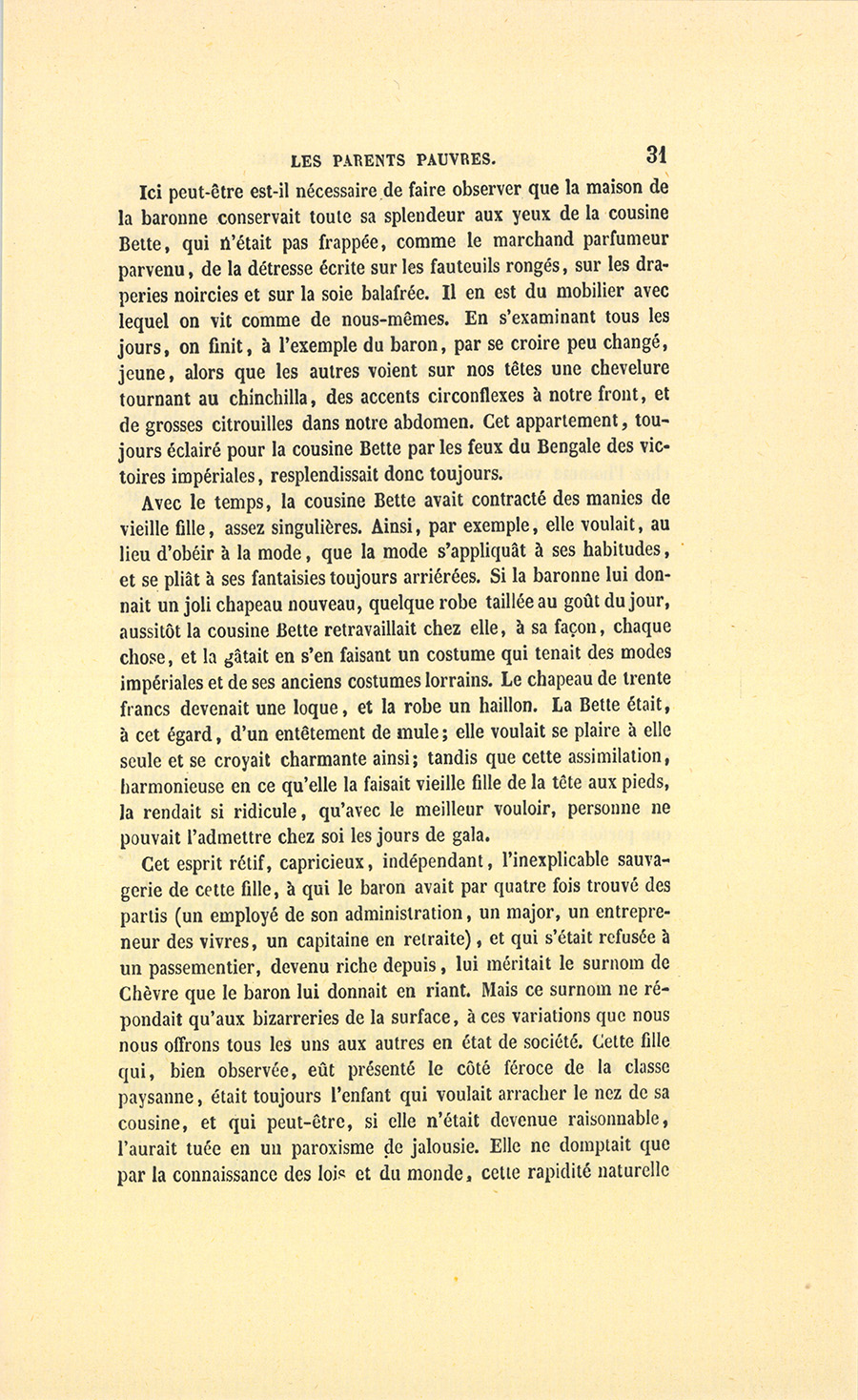 Cette vieille fille portait une robe de mérinos, couleur raisin de Corinthe, dont la coupe et les lisérés dataient de la Restauration, une collerette brodée qui pouvait valoir trois francs, un chapeau de paille cousue à coques de satin bleu bordées de paille comme on en voit aux revendeuses de la halle. À l’aspect de souliers en peau de chèvre dont la façon annonçait un cordonnier du dernier ordre, un étranger aurait hésité à saluer la cousine Bette comme une parente de la maison, car elle ressemblait tout à fait à une couturière en journée. Néanmoins la vieille fille ne sortit pas sans faire un petit salut affectueux à monsieur Crevel, auquel ce personnage répondit par un signe d’intelligence.