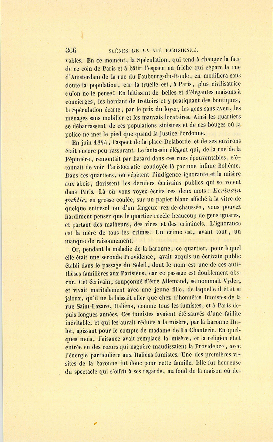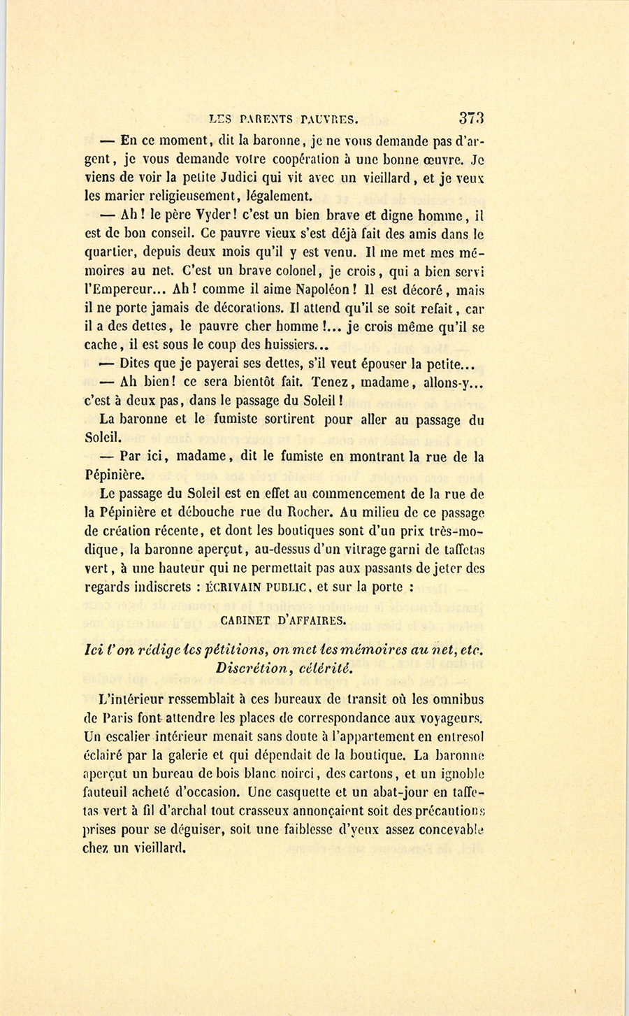 Le passage du Soleil est en effet au commencement de la rue de la Pépinière et débouche rue du Rocher. Au milieu de ce passage de création récente, et dont les boutiques sont d’un prix très-modique, la baronne aperçut, au-dessus d’un vitrage garni de taffetas vert, à une hauteur qui ne permettait pas aux passants de jeter des regards indiscrets : écrivain public, et sur la porte :