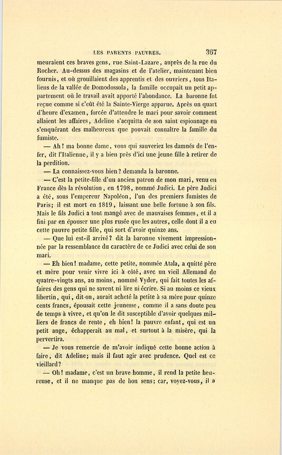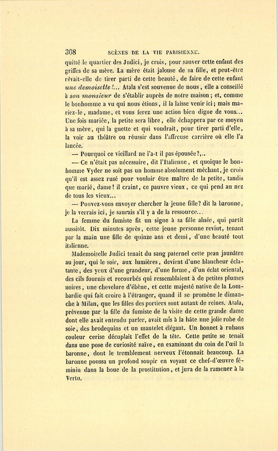 {p. 373} – En ce moment, dit la baronne, je ne vous demande pas d’argent, je vous demande votre coopération à une bonne œuvre. Je viens de voir la petite Judici qui vit avec un vieillard, et je veux les marier religieusement, légalement.