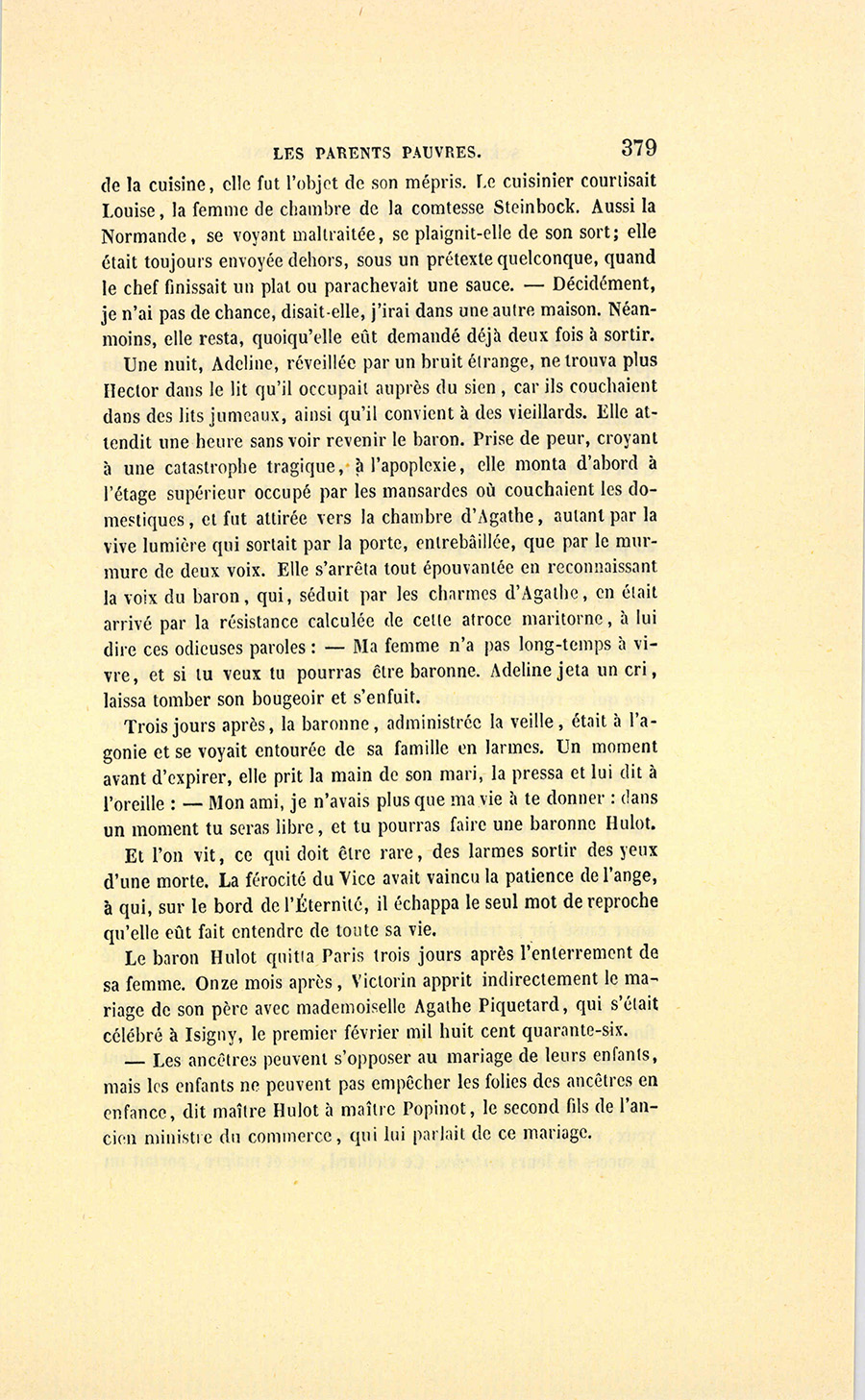 Trois jours après, la baronne, administrée la veille, était à l’agonie et se voyait entourée de sa famille en larmes. Un moment avant d’expirer, elle prit la main de son mari, la pressa et lui dit à l’oreille : – Mon ami, je n’avais plus que ma vie à te donner : dans un moment tu seras libre, et tu pourras faire une baronne Hulot.