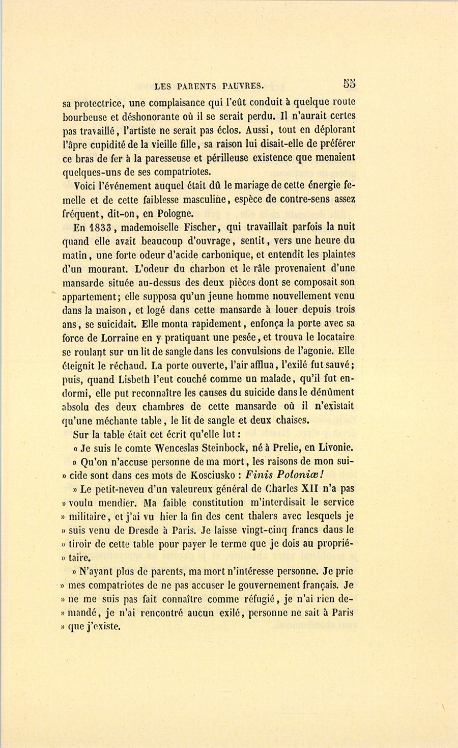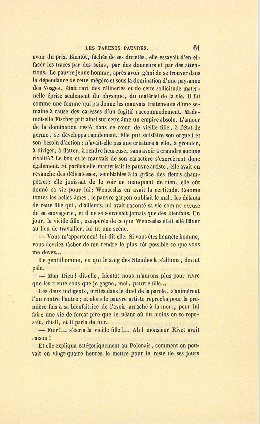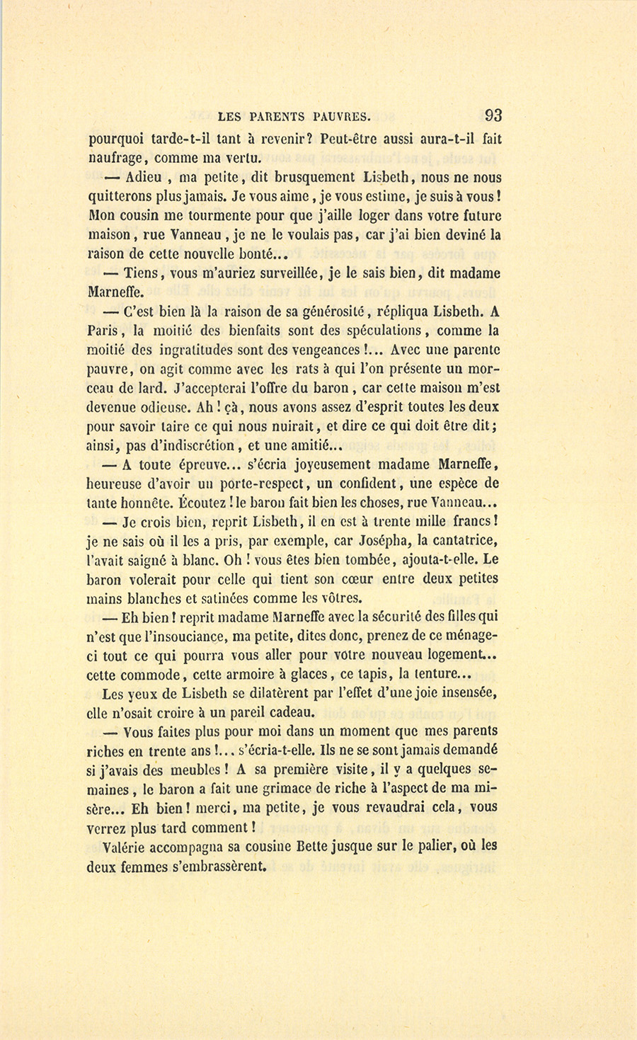 – Mon ami, dit-elle oubliant tout dans l’excès de sa joie, tu peux revenir au sein de ta famille, nous sommes riches ! ton fils a cent soixante mille francs de rente ! ta pension est libre, tu as un arriéré de quinze mille francs à toucher sur ton simple certificat de vie ! Valérie est morte en te léguant trois cent mille francs. On a bien oublié ton nom, va ! tu peux rentrer dans le monde, et tu trouveras d’abord chez ton fils une fortune. Viens, notre bonheur sera complet. Voici bientôt trois ans que je te cherche, et j’espérais si bien te rencontrer, que tu as un appartement tout prêt à te recevoir. Oh ! sors d’ici, sors de l’affreuse situation où je te vois !