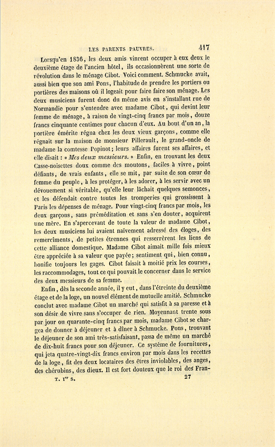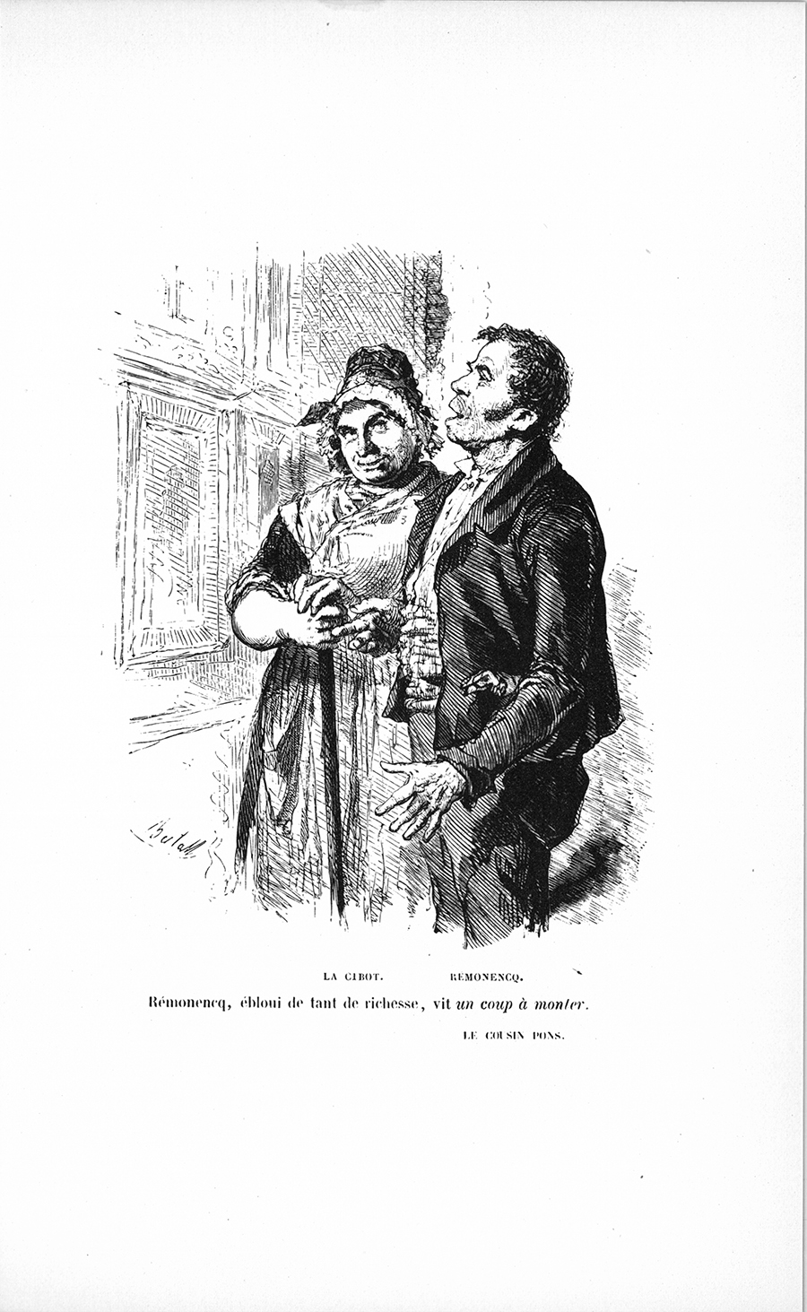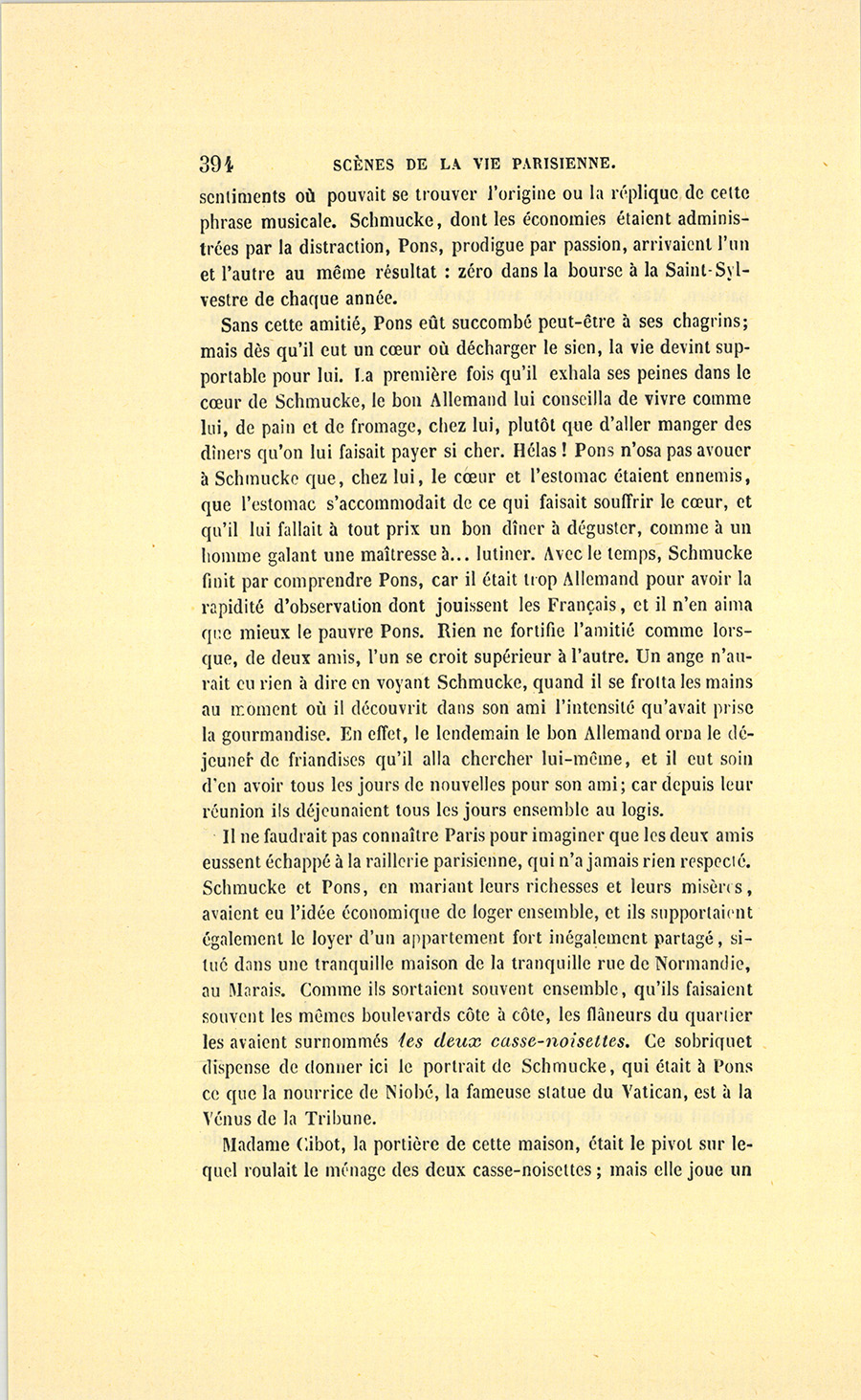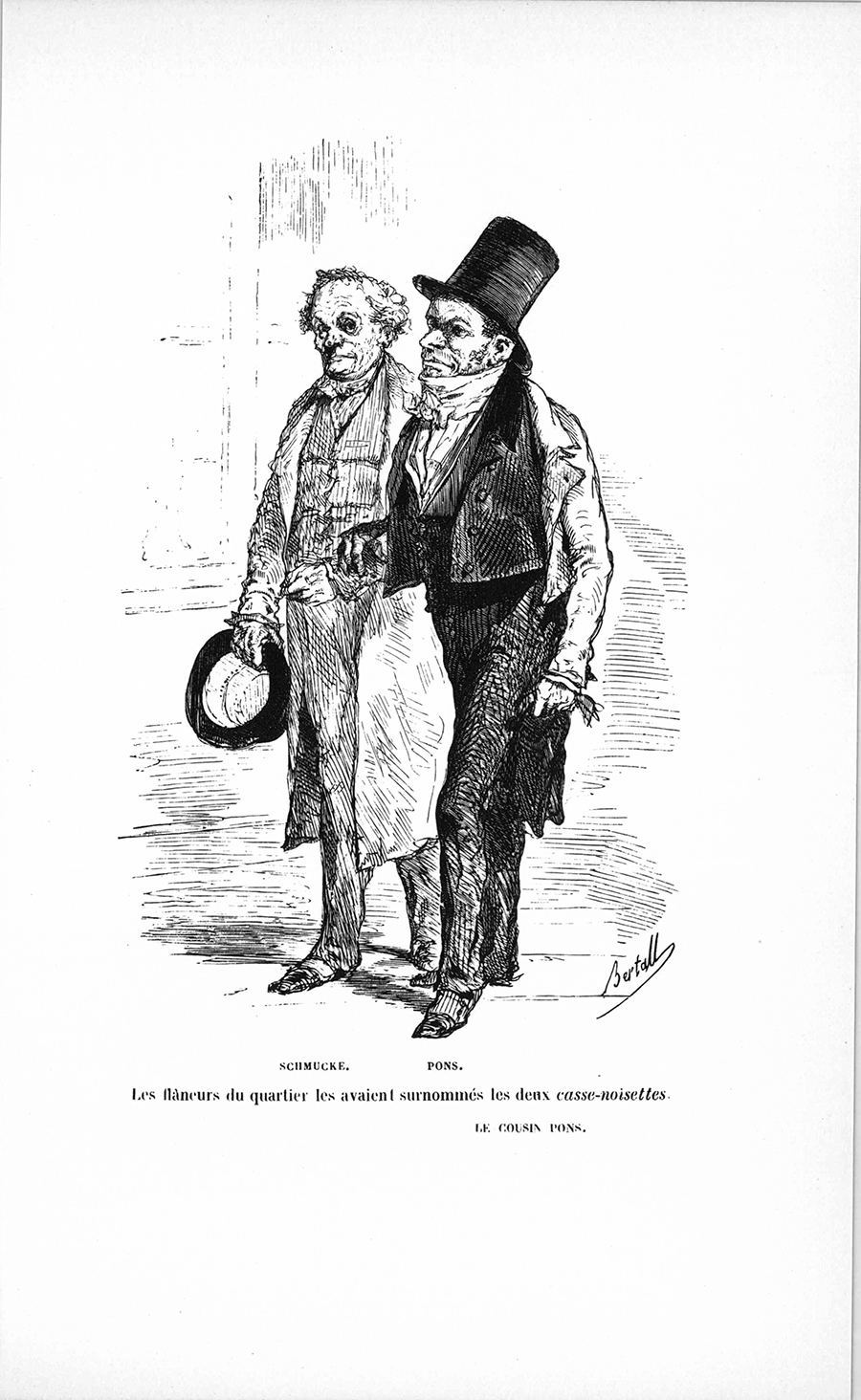 Il ne faudrait pas connaître Paris pour imaginer que les deux amis eussent échappé à la raillerie parisienne, qui n’a jamais rien respecté. Schmucke et Pons, en mariant leurs richesses et leurs misères, avaient eu l’idée économique de loger ensemble, et ils supportaient également le loyer d’un appartement fort inégalement partagé, situé dans une tranquille maison de la tranquille rue de Normandie, au Marais. Comme ils sortaient souvent ensemble, qu’ils faisaient souvent les mêmes boulevards côte à côte, les flâneurs du quartier les avaient surnommés les deux casse-noisettes. [ill.] Ce sobriquet dispense de donner ici le portrait de Schmucke, qui était à Pons ce que la nourrice de Niobé, la fameuse statue du Vatican, est à la Vénus de la Tribune.
