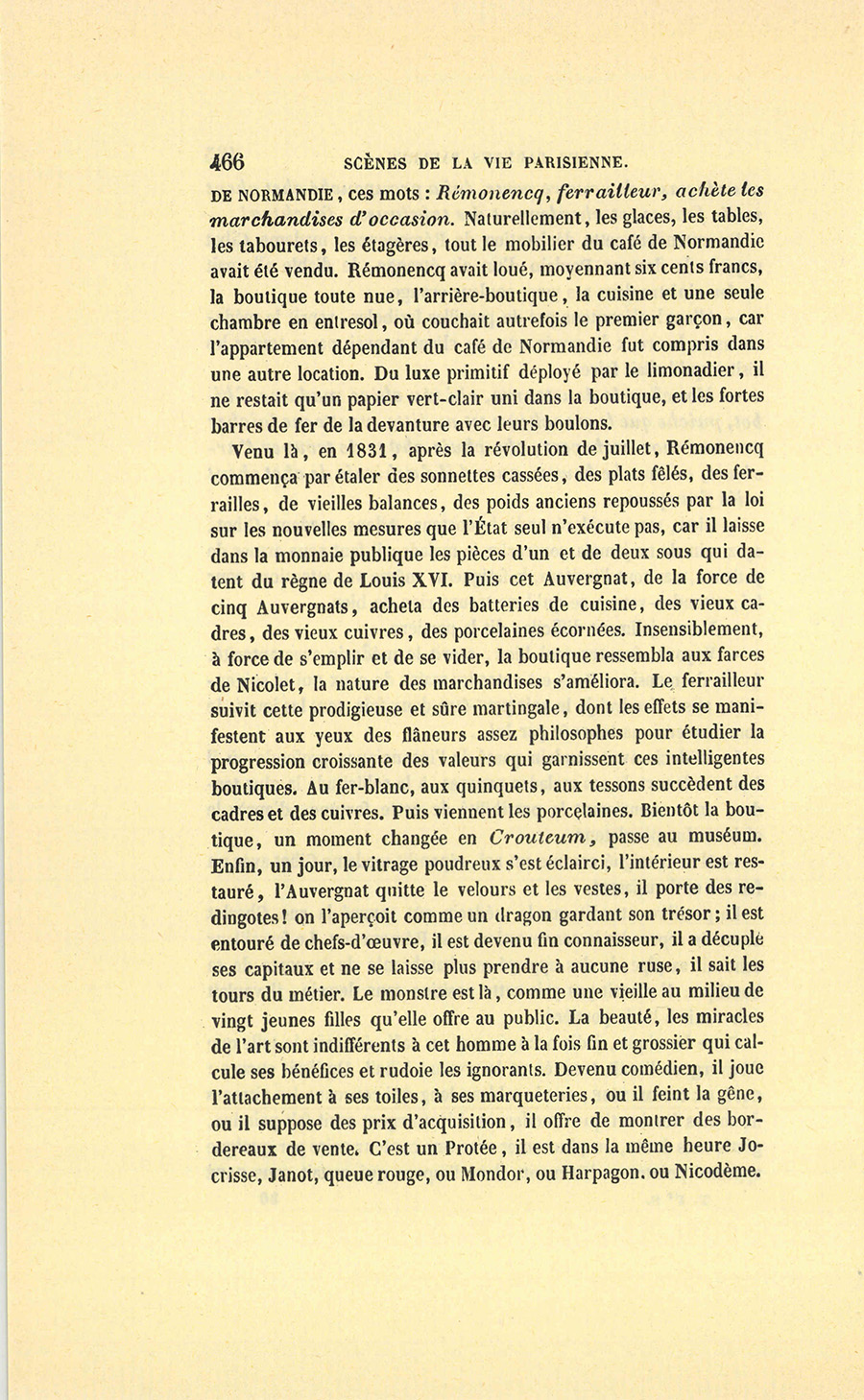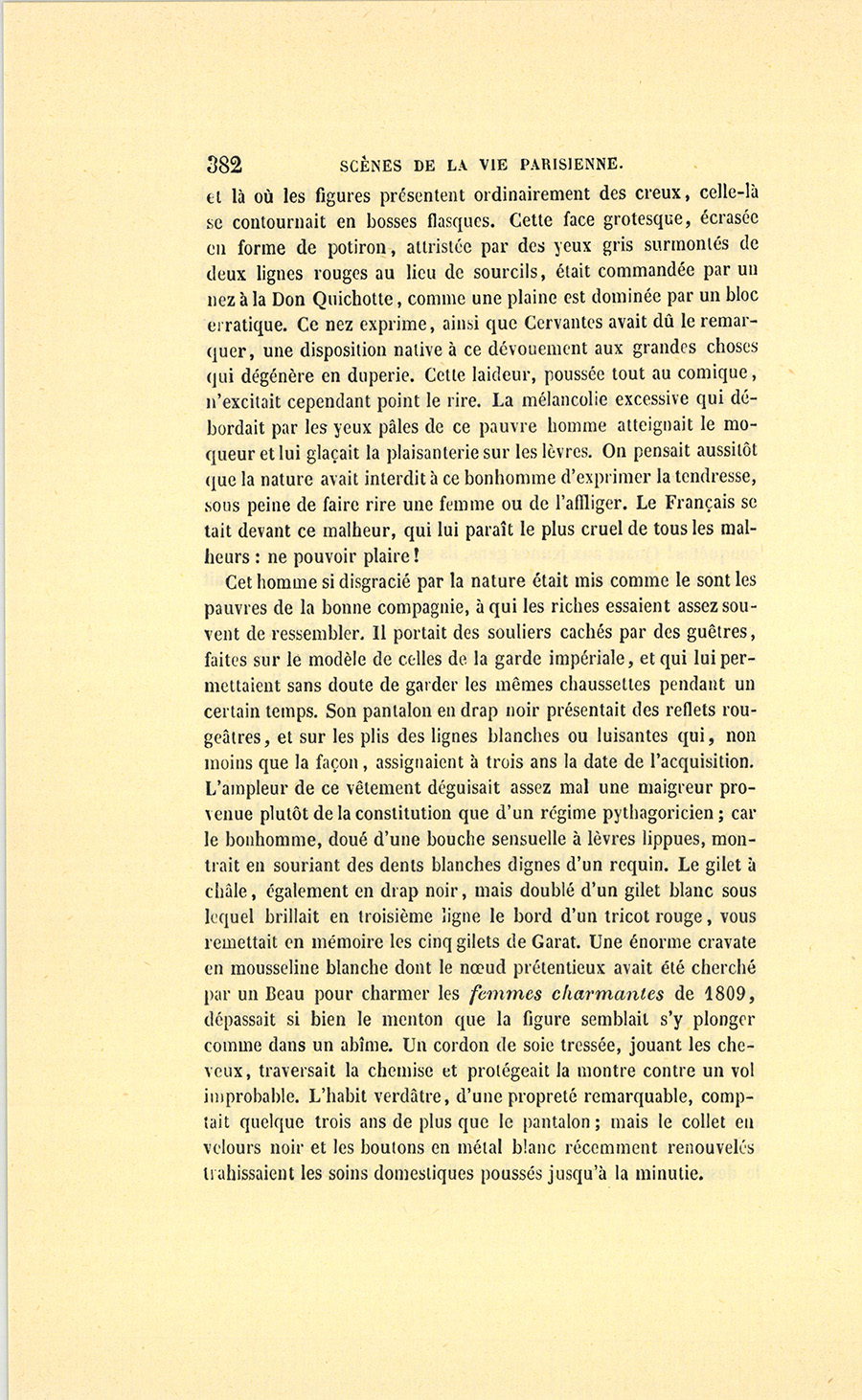 {p. 380} Vers trois heures de l’après-midi, dans le mois d’octobre de l’année 1844, un homme âgé d’une soixantaine d’années, mais à qui tout le monde eût donné plus que cet âge, allait le long du boulevard des Italiens, le nez à la piste, les lèvres papelardes, comme un négociant qui vient de conclure une excellente affaire, ou comme un garçon content de lui-même au sortir d’un boudoir. C’est à Paris la plus grande expression connue de la satisfaction personnelle chez l’homme. En apercevant de loin ce vieillard, les personnes qui sont là tous les jours assises sur des chaises, livrées au plaisir d’analyser les passants, laissaient toutes poindre dans leurs physionomies ce sourire particulier aux gens de Paris, et qui dit tant de choses ironiques, moqueuses ou compatissantes, mais qui, pour animer le visage du Parisien, blasé sur tous les spectacles possibles, exigent de hautes curiosités vivantes. Un mot fera comprendre et la valeur archéologique de ce bonhomme et la raison du sourire qui se répétait comme un écho dans tous les yeux. On demandait à Hyacinthe, un acteur célèbre par ses saillies, où il faisait faire les chapeaux à la vue desquels la salle pouffe de rire : « – Je ne les fais point faire, je les garde ? » répondit-il. Eh bien ! il se rencontre dans le million d’acteurs qui composent la grande troupe de Paris, des Hyacinthes sans le savoir qui gardent sur eux tous les ridicules d’un temps, et qui vous apparaissent comme la personnification de toute une époque pour vous arracher une bouffée de gaieté quand vous vous promenez en dévorant quelque chagrin amer causé par la trahison d’un ex-ami.