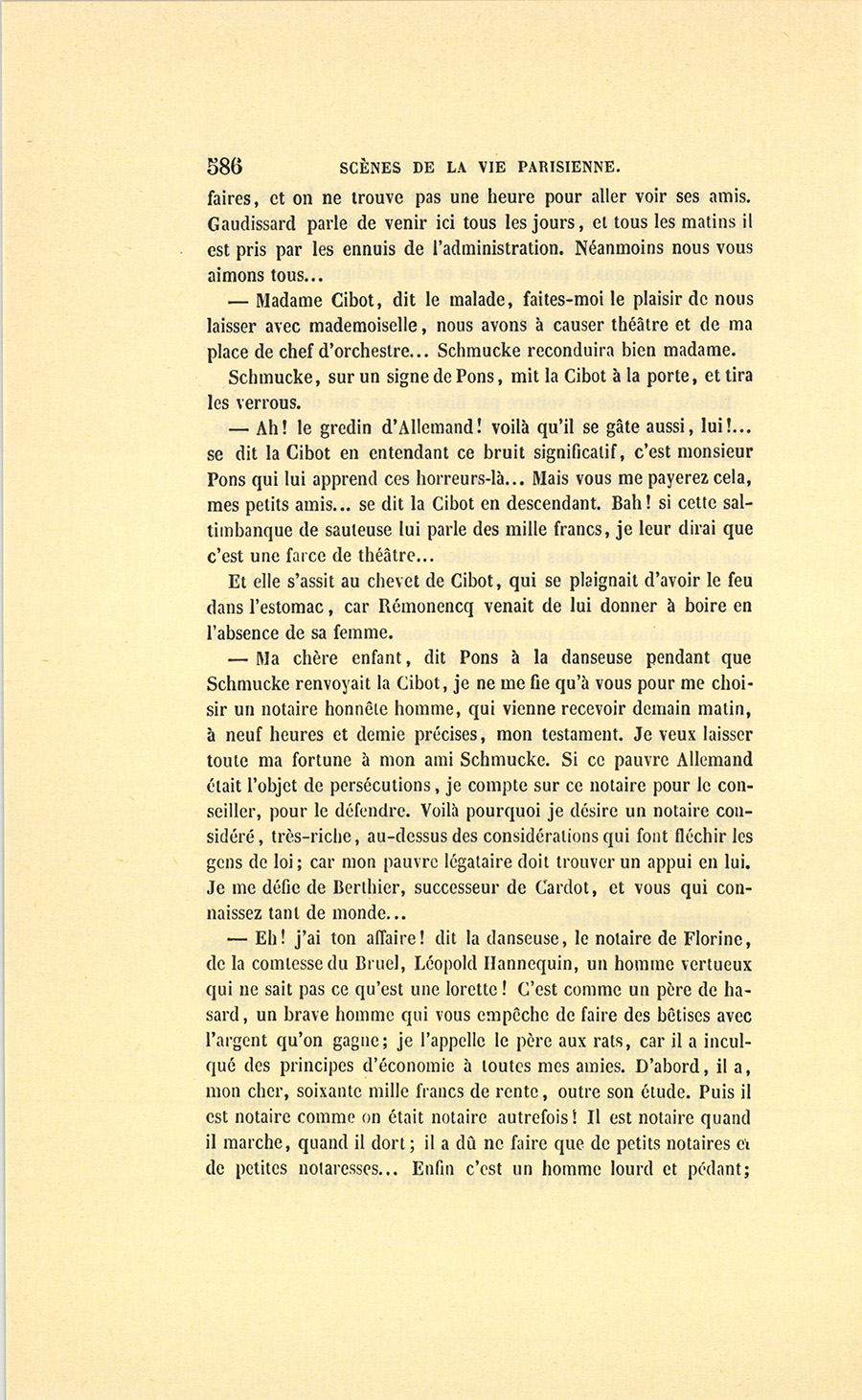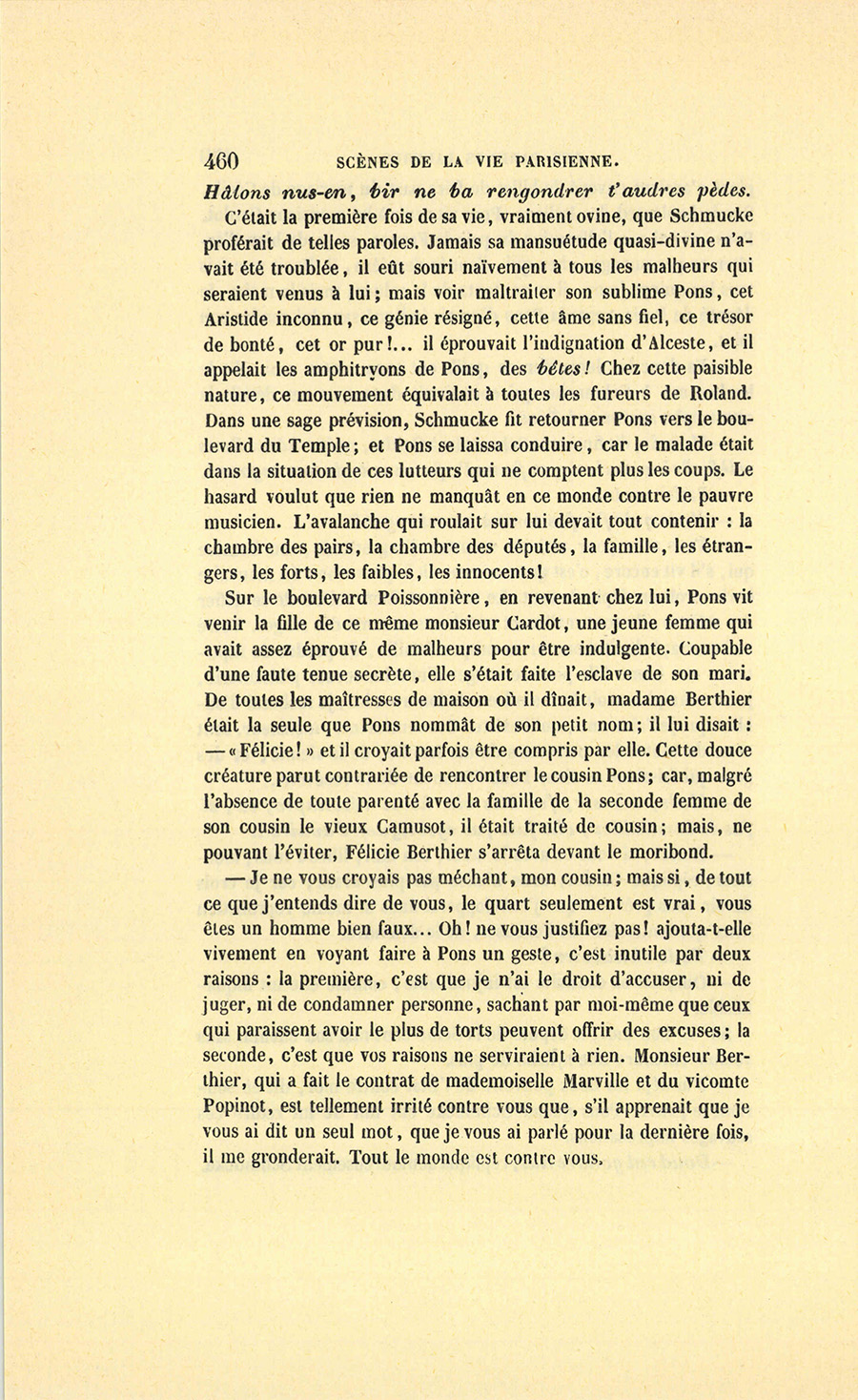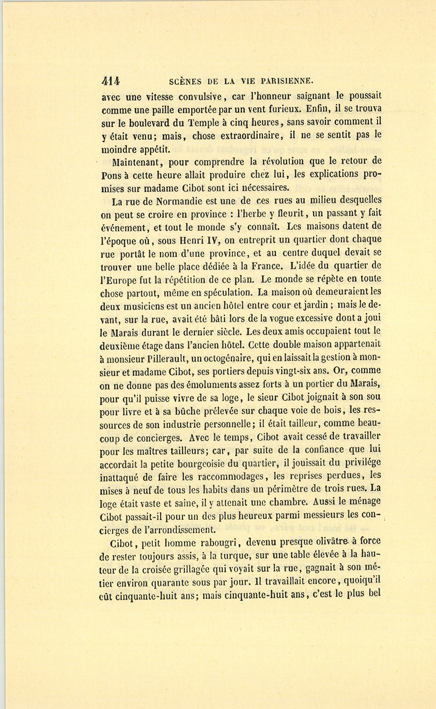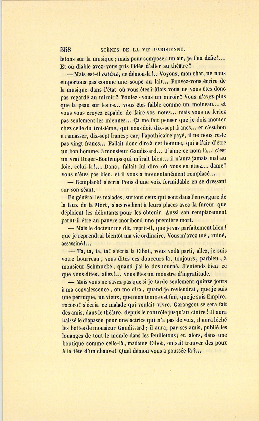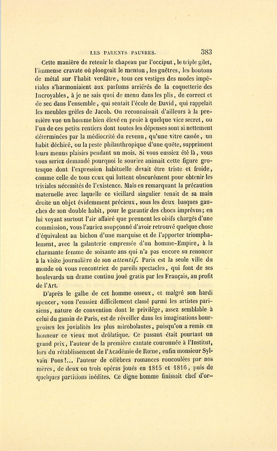 D’après le galbe de cet homme osseux, et malgré son hardi spencer, vous l’eussiez difficilement classé parmi les artistes parisiens, nature de convention dont le privilége assez semblable à celui du gamin de Paris, est de réveiller dans les imaginations bourgeoises les jovialités les plus mirobolantes, puisqu’on a remis en honneur ce vieux mot drôlatique. Ce passant était pourtant un grand prix, l’auteur de la première cantate couronnée à l’Institut, lors du rétablissement de l’Académie de Rome, enfin monsieur Sylvain Pons !… l’auteur de célèbres romances roucoulées par nos mères, de deux ou trois opéras joués en 1815 et 1816, puis de quelques partitions inédites. Ce digne homme finissait chef {p. 384} d’orchestre à un théâtre des boulevards. Il était, grâce à sa figure, professeur dans quelques pensionnats de demoiselles, et n’avait pas d’autres revenus que ses appointements et ses cachets. Courir le cachet à cet âge !… Combien de mystères dans cette situation peu romanesque !