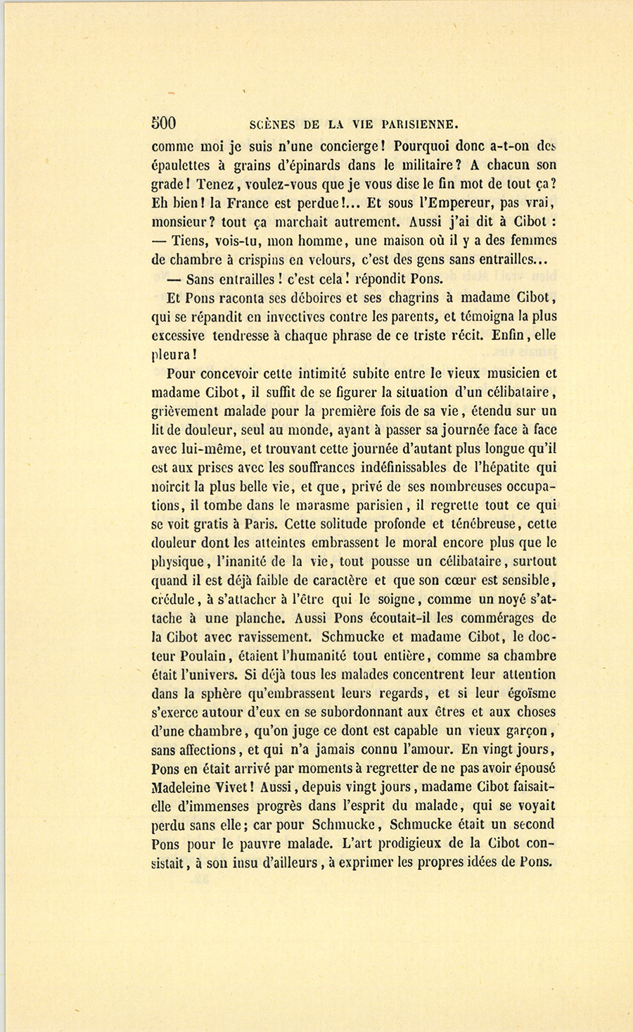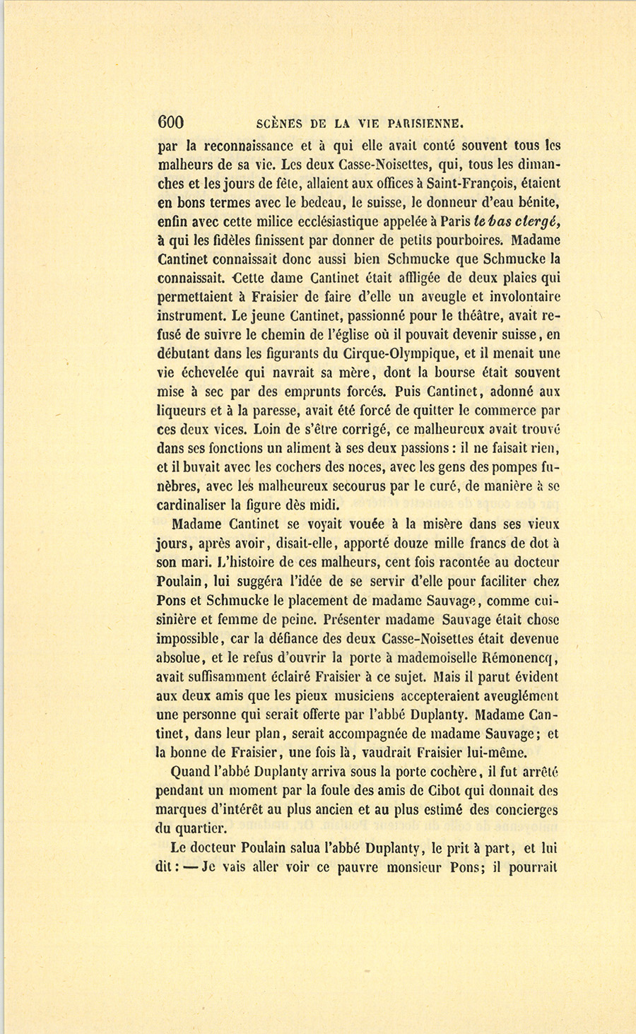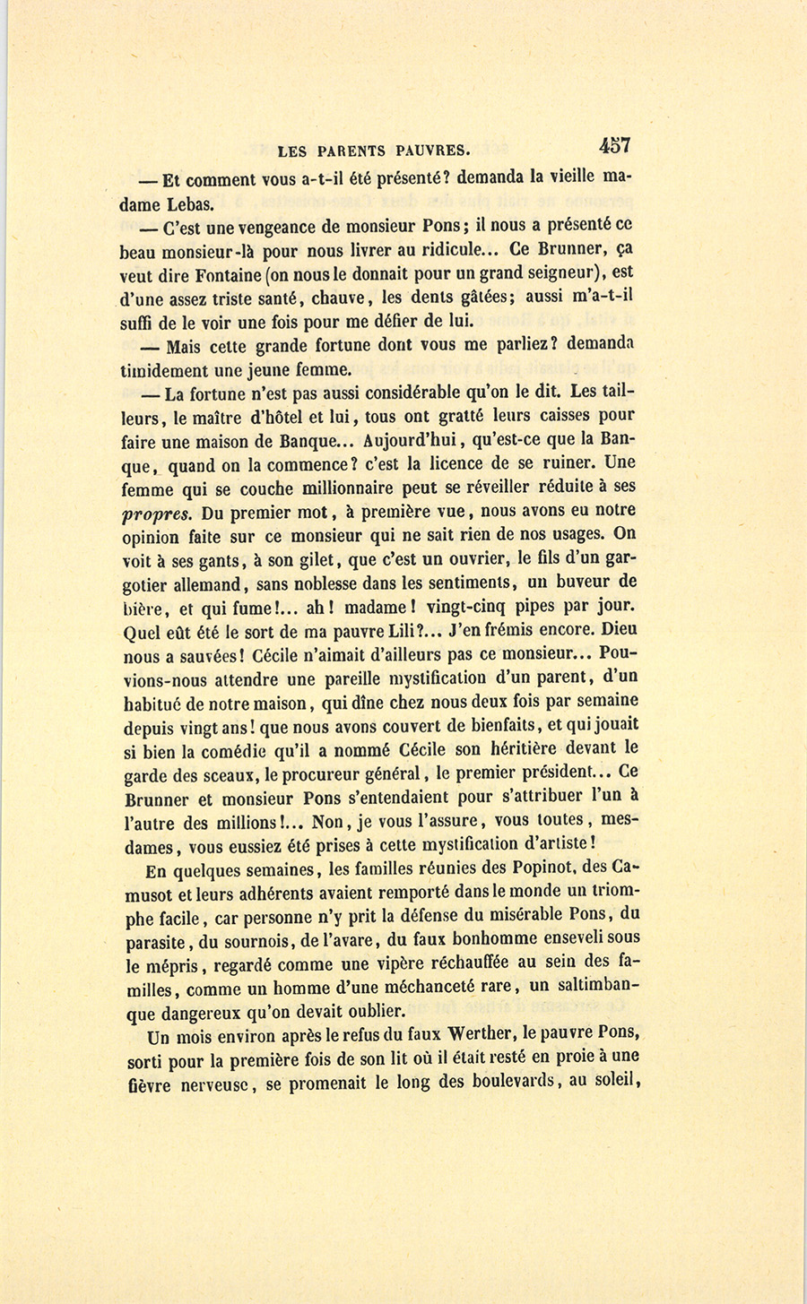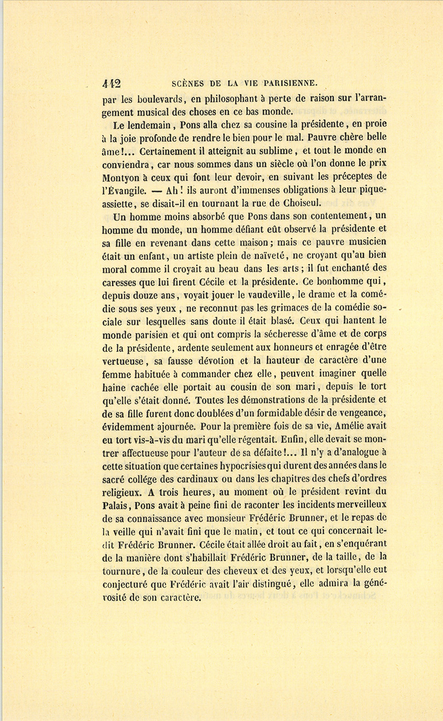 D’après le galbe de cet homme osseux, et malgré son hardi spencer, vous l’eussiez difficilement classé parmi les artistes parisiens, nature de convention dont le privilége assez semblable à celui du gamin de Paris, est de réveiller dans les imaginations bourgeoises les jovialités les plus mirobolantes, puisqu’on a remis en honneur ce vieux mot drôlatique. Ce passant était pourtant un grand prix, l’auteur de la première cantate couronnée à l’Institut, lors du rétablissement de l’Académie de Rome, enfin monsieur Sylvain Pons !… l’auteur de célèbres romances roucoulées par nos mères, de deux ou trois opéras joués en 1815 et 1816, puis de quelques partitions inédites. Ce digne homme finissait chef {p. 384} d’orchestre à un théâtre des boulevards. Il était, grâce à sa figure, professeur dans quelques pensionnats de demoiselles, et n’avait pas d’autres revenus que ses appointements et ses cachets. Courir le cachet à cet âge !… Combien de mystères dans cette situation peu romanesque !