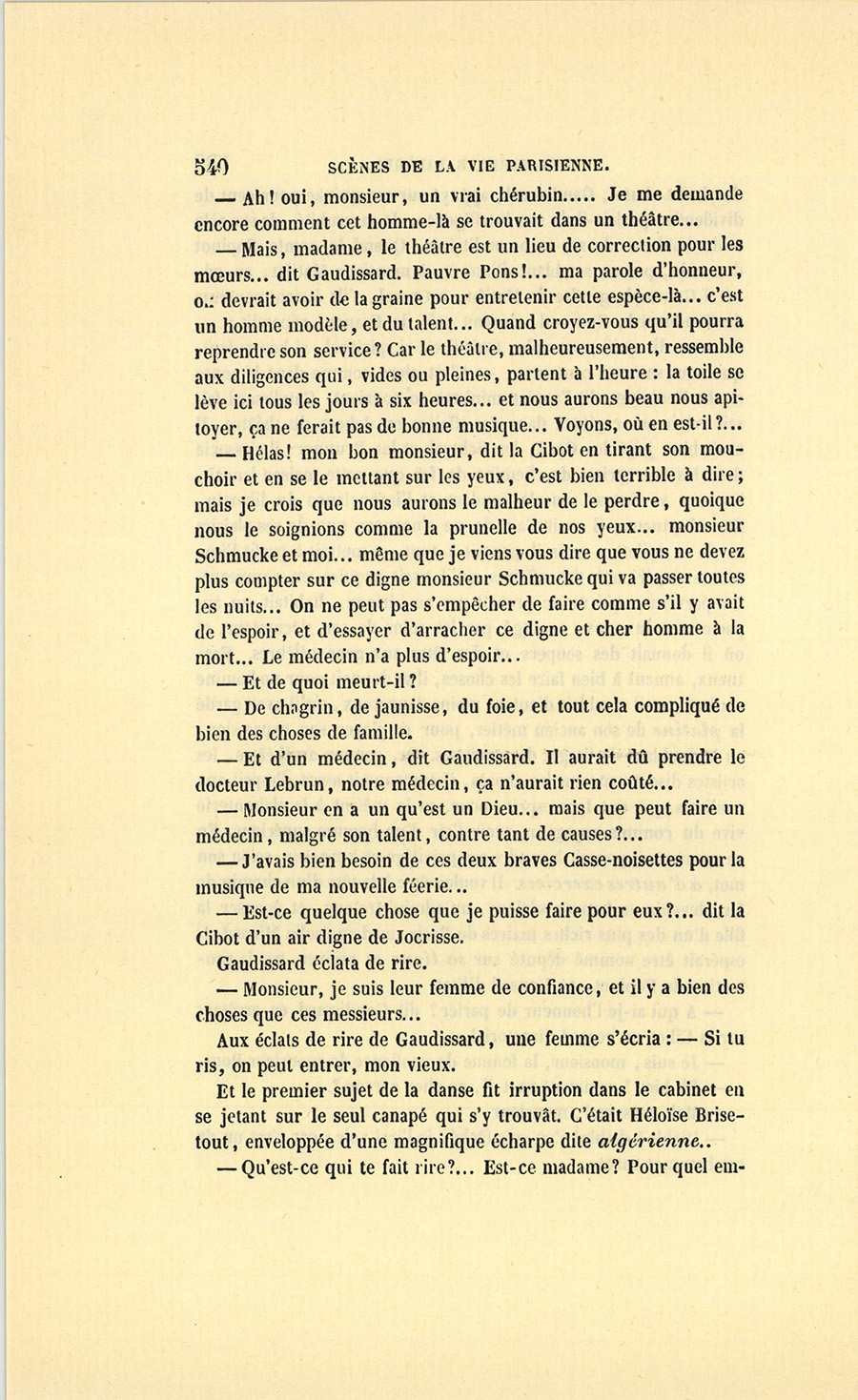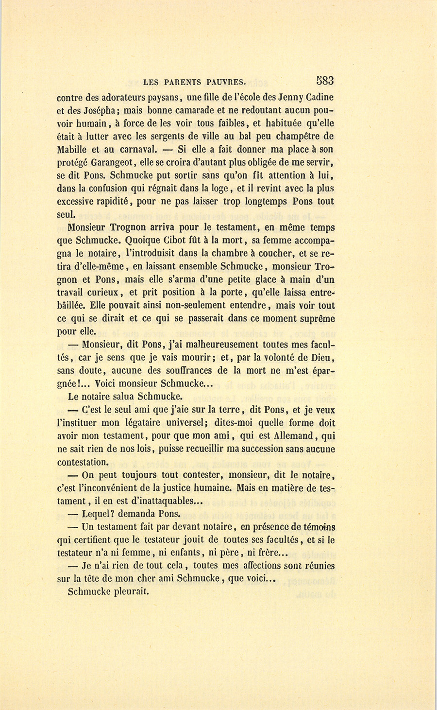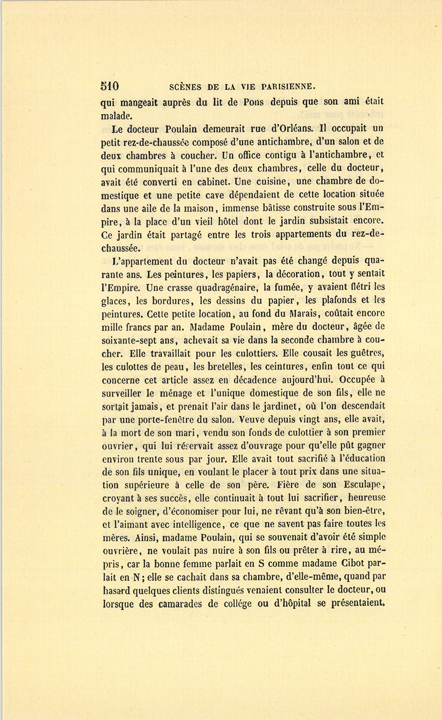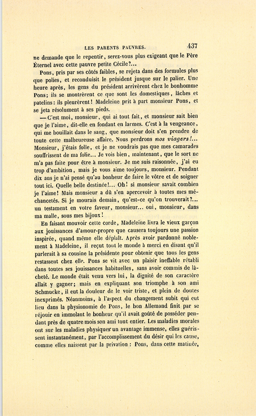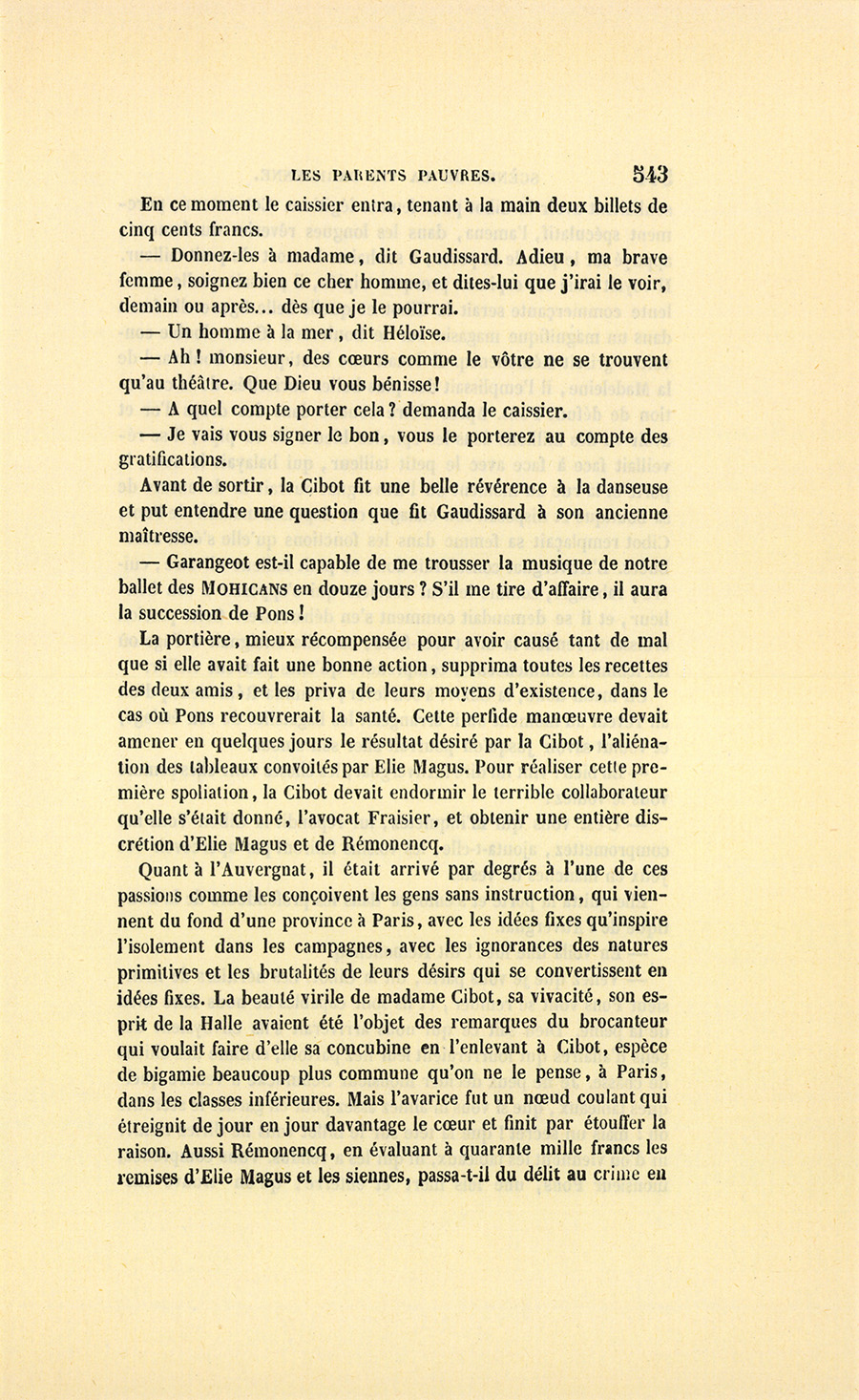 D’après le galbe de cet homme osseux, et malgré son hardi spencer, vous l’eussiez difficilement classé parmi les artistes parisiens, nature de convention dont le privilége assez semblable à celui du gamin de Paris, est de réveiller dans les imaginations bourgeoises les jovialités les plus mirobolantes, puisqu’on a remis en honneur ce vieux mot drôlatique. Ce passant était pourtant un grand prix, l’auteur de la première cantate couronnée à l’Institut, lors du rétablissement de l’Académie de Rome, enfin monsieur Sylvain Pons !… l’auteur de célèbres romances roucoulées par nos mères, de deux ou trois opéras joués en 1815 et 1816, puis de quelques partitions inédites. Ce digne homme finissait chef {p. 384} d’orchestre à un théâtre des boulevards. Il était, grâce à sa figure, professeur dans quelques pensionnats de demoiselles, et n’avait pas d’autres revenus que ses appointements et ses cachets. Courir le cachet à cet âge !… Combien de mystères dans cette situation peu romanesque !