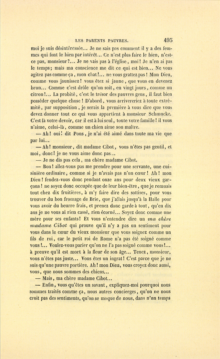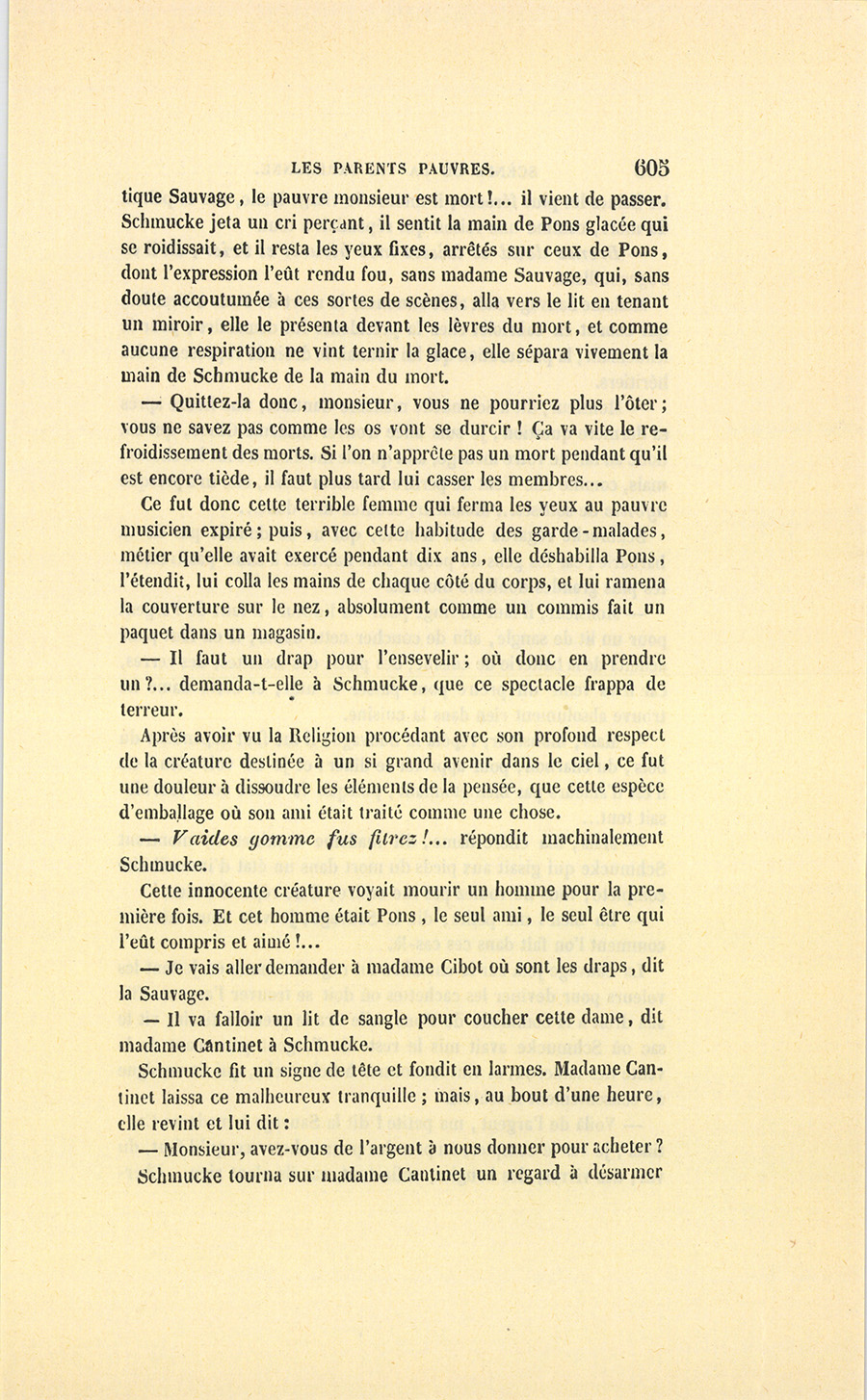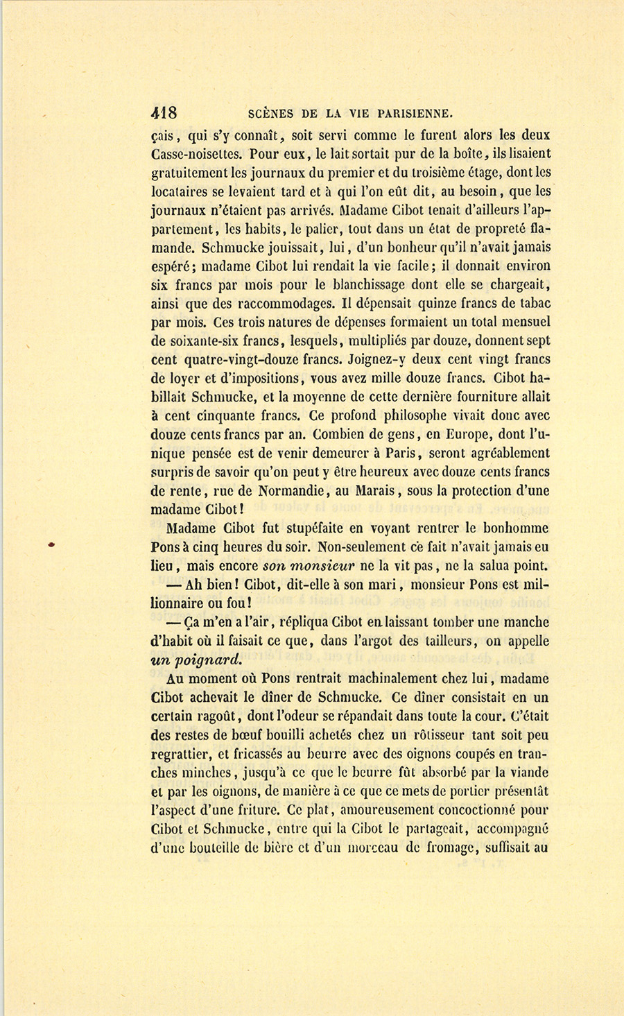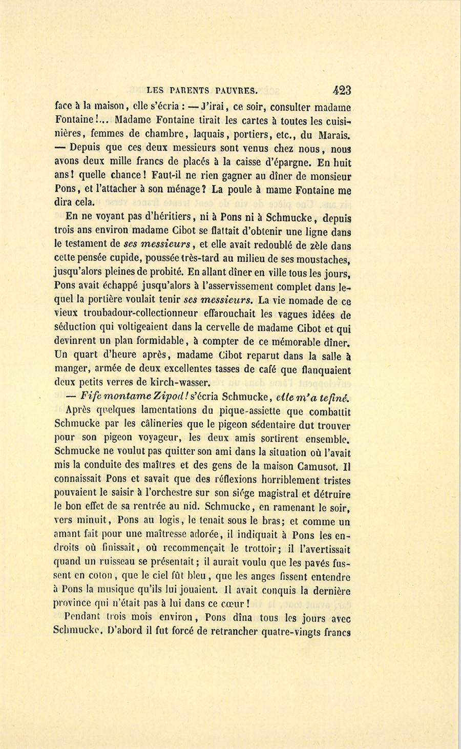D’après le galbe de cet homme osseux, et malgré son hardi spencer, vous l’eussiez difficilement classé parmi les artistes parisiens, nature de convention dont le privilége assez semblable à celui du gamin de Paris, est de réveiller dans les imaginations bourgeoises les jovialités les plus mirobolantes, puisqu’on a remis en honneur ce vieux mot drôlatique. Ce passant était pourtant un grand prix, l’auteur de la première cantate couronnée à l’Institut, lors du rétablissement de l’Académie de Rome, enfin monsieur Sylvain Pons !… l’auteur de célèbres romances roucoulées par nos mères, de deux ou trois opéras joués en 1815 et 1816, puis de quelques partitions inédites. Ce digne homme finissait chef {p. 384} d’orchestre à un théâtre des boulevards. Il était, grâce à sa figure, professeur dans quelques pensionnats de demoiselles, et n’avait pas d’autres revenus que ses appointements et ses cachets. Courir le cachet à cet âge !… Combien de mystères dans cette situation peu romanesque !