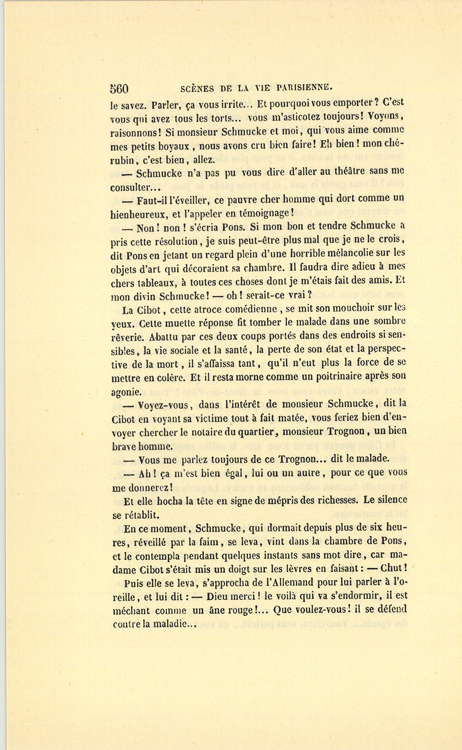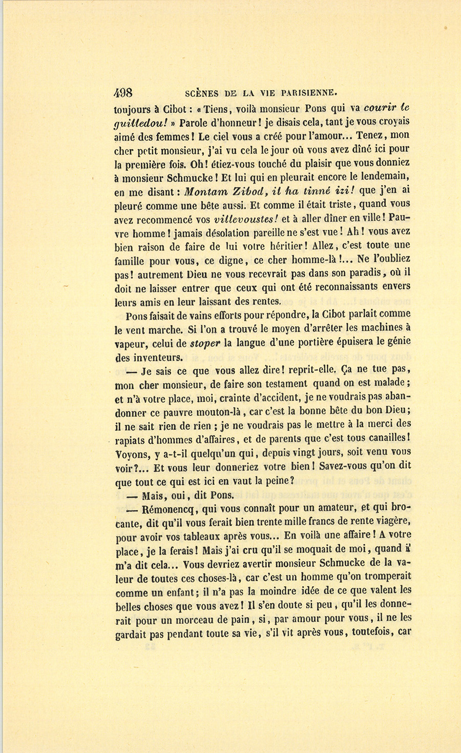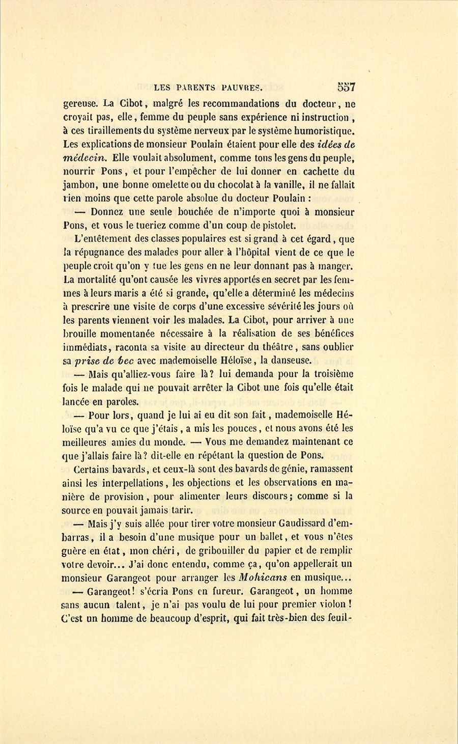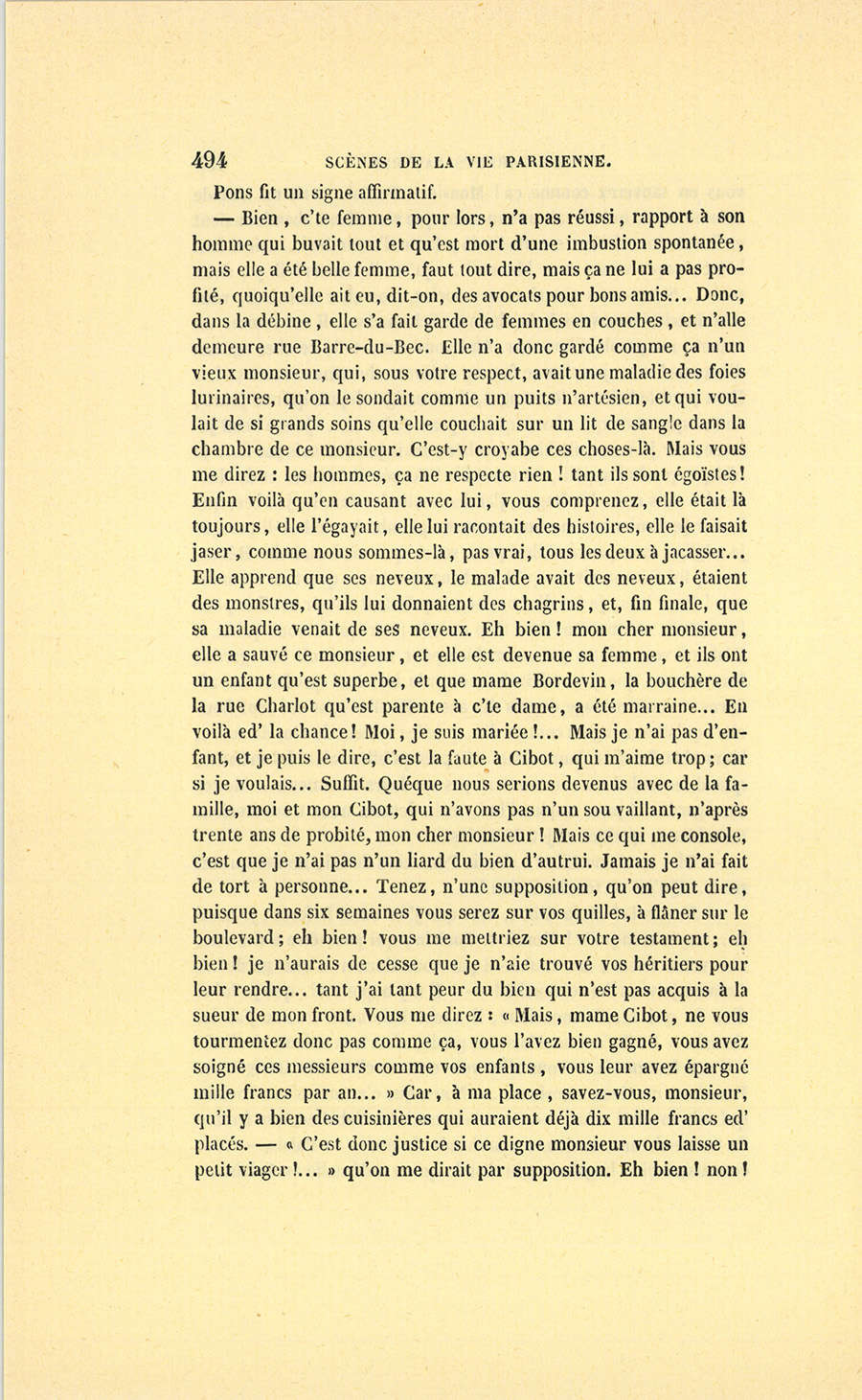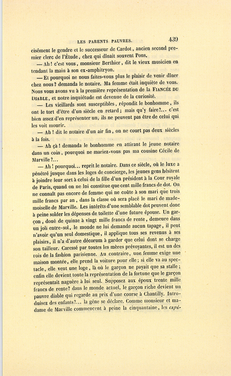 D’après le galbe de cet homme osseux, et malgré son hardi spencer, vous l’eussiez difficilement classé parmi les artistes parisiens, nature de convention dont le privilége assez semblable à celui du gamin de Paris, est de réveiller dans les imaginations bourgeoises les jovialités les plus mirobolantes, puisqu’on a remis en honneur ce vieux mot drôlatique. Ce passant était pourtant un grand prix, l’auteur de la première cantate couronnée à l’Institut, lors du rétablissement de l’Académie de Rome, enfin monsieur Sylvain Pons !… l’auteur de célèbres romances roucoulées par nos mères, de deux ou trois opéras joués en 1815 et 1816, puis de quelques partitions inédites. Ce digne homme finissait chef {p. 384} d’orchestre à un théâtre des boulevards. Il était, grâce à sa figure, professeur dans quelques pensionnats de demoiselles, et n’avait pas d’autres revenus que ses appointements et ses cachets. Courir le cachet à cet âge !… Combien de mystères dans cette situation peu romanesque !